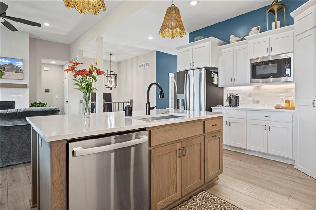 Better than new! Lovely four-bedroom reverse one and a half story by Pfannes Homes with tons of upgrades on a quiet cul-de-sac. Quartz counters, stainless steel appliances, upgraded lighting and hardware throughout, wood floors on main level. Large rec room area on the daylight lower level +2 bedrooms and a third-full bathroom and loads of storage space! Award-winning Basehor-Linwood school district! *big ticket items that stay with the home, refrigerator, washer & dryer and full house water softener and purifying system*