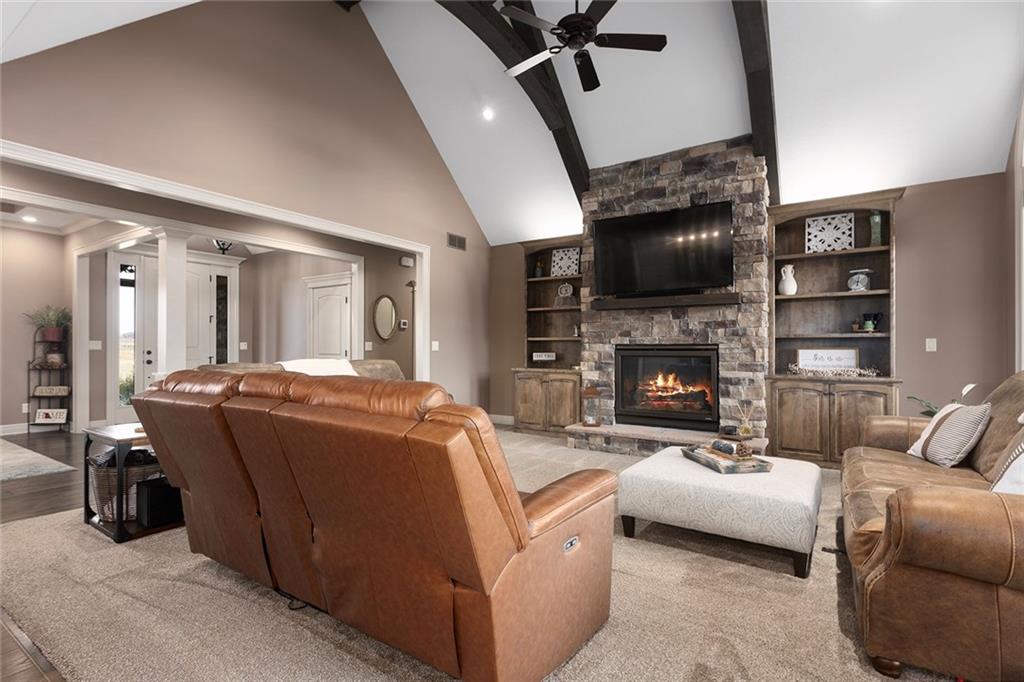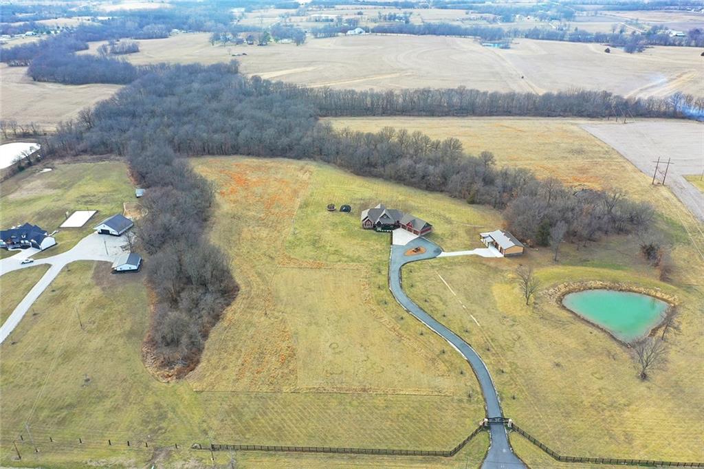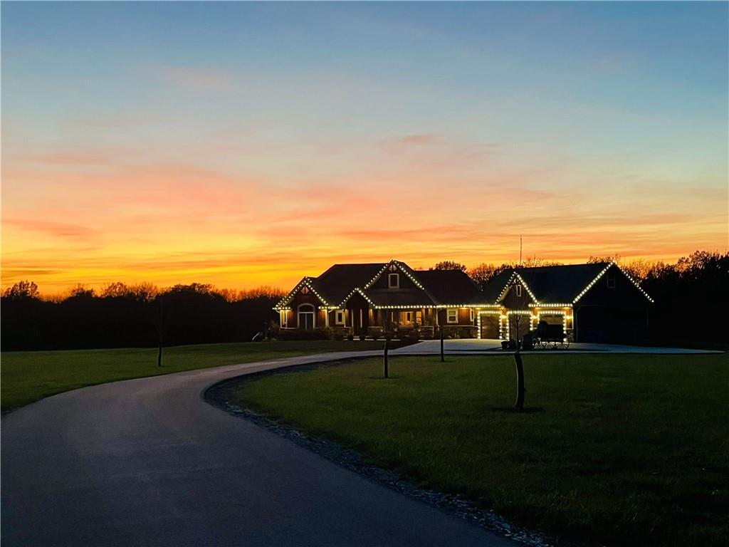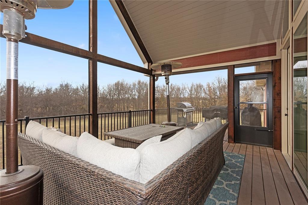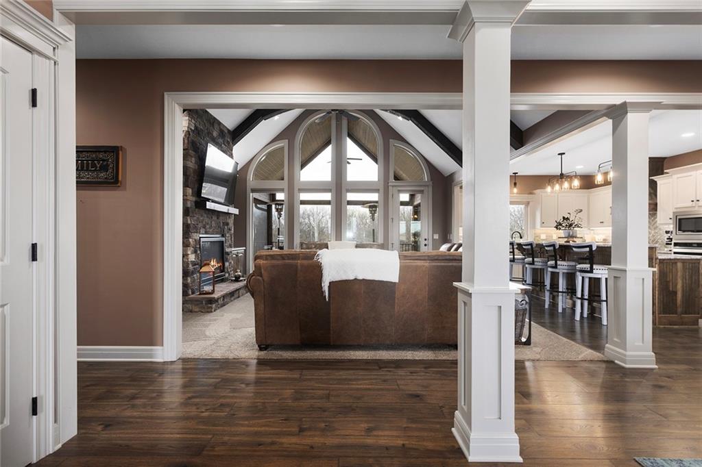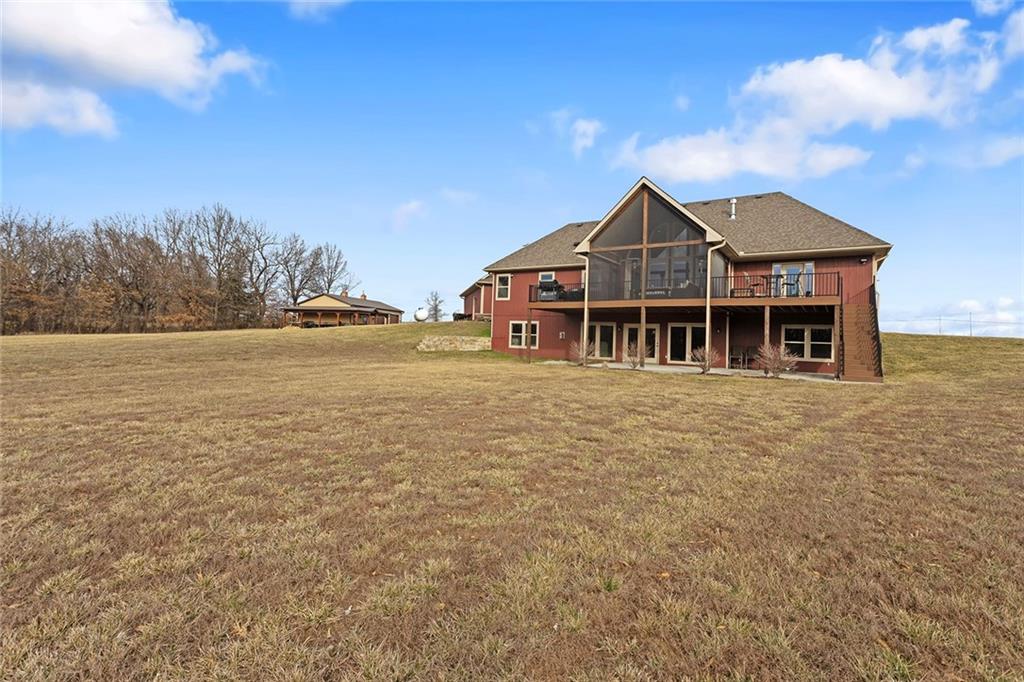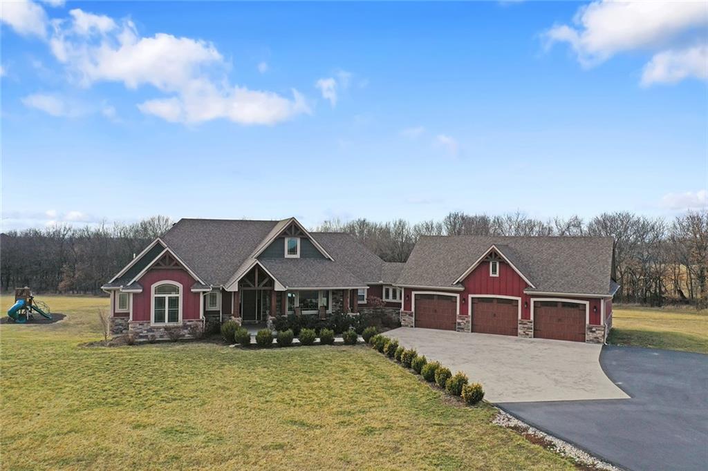 Welcome to Murricane Ranch — a private, gated estate where luxury meets the land. A winding paved drive lined with brilliant Fire Maples creates a breathtaking approach, setting the tone for nearly 25 pristine acres framed by classic Kentucky horse fencing and highlighted by a fully stocked pond. Designed to embrace the natural beauty and uniqueness of the property, this custom-built reverse 1.5-story captures sweeping treed views and unforgettable sunsets from its screened-in covered deck. Inside, the open-concept layout is anchored by a true chef’s kitchen featuring custom cabinet detailing and an amazing walk-in pantry built for both serious cooking and seamless organization. The kitchen flows effortlessly into the main living areas, creating a warm and inviting space ideal for everyday living & entertaining. A thoughtfully designed main-floor pet/mud room adds convenience and function. The private owner’s retreat is a sanctuary of its own, complete with heated floors and a spa-quality shower that elevates daily living. Guest rooms are intentionally positioned for privacy, while the full walkout lower level offers two additional bedrooms, a spacious game room, wet bar, and dedicated media area. Quality construction is evident throughout, including zoned high-efficiency HVAC, engineered laminated floor joists, and a reinforced storm room for peace of mind. The absolutely massive heated 3 car garage (with over 1100 sq ft) accommodates even the largest vehicles with ease to maneuver and provides the option to finish a private apartment above. A 1,500-square-foot heated and cooled outbuilding with office space, bathroom, and an impressive man cave expands the lifestyle possibilities even further. Though privately tucked away, Murricane Ranch is just minutes to I-70 & approximately 20 minutes to Blue Springs—offering convenient access without sacrificing seclusion. This is more than a home; it is a purposefully crafted retreat where land, luxury, & lifestyle converge.