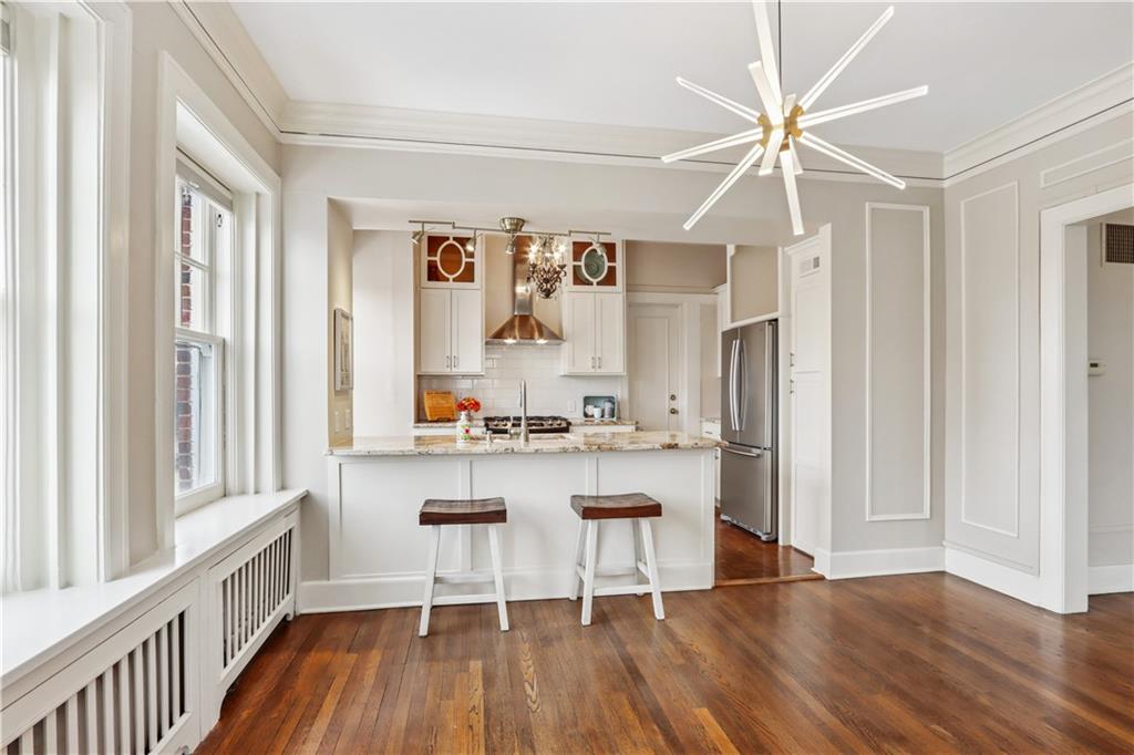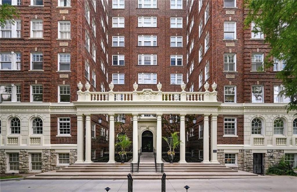 Fall in love with this beautifully updated 2-bedroom, 1-bath corner unit in the iconic Sophian Plaza. Flooded with natural light, this unit features rich hardwood floors, crown molding, and oversized windows with views in multiple directions. The updated kitchen is both stylish and functional, offering granite countertops, stainless appliances, a gas range, pantry, and spice cabinetry. Kitchen layout is open to the main living space, making it ideal for hosting or simply enjoying everyday life. The spacious primary bedroom is a wonderful retreat! Thoughtful touches like in-unit laundry and custom window treatments for convenience. Unlike many Plaza condos, the bedrooms are large enough to easily accommodate wardrobe pieces or armoires if someone wants additional closet space. Private basement storage included — perfect for seasonal items and extra belongings. Sophian residents enjoy a newly upgraded patio, private storage, secure exterior parking, and dues that include gas and water. Set in one of Kansas City’s most architecturally celebrated buildings, this location places you moments from the Country Club Plaza, Nelson-Atkins Museum of Art, parks, shopping, dining, and entertainment. If owning a piece of iconic architecture is on your bingo card for 2026, this one is worth it!