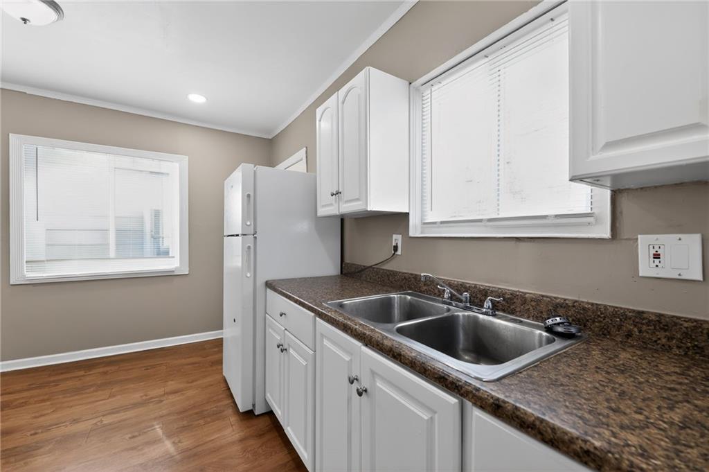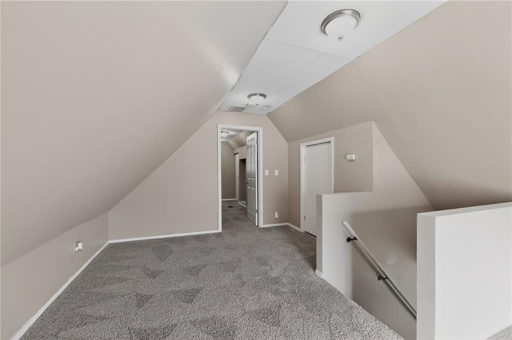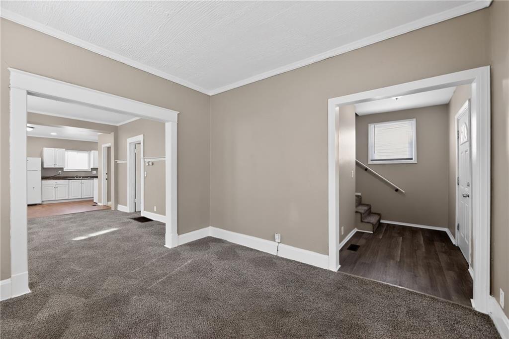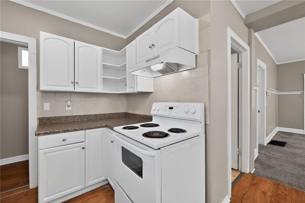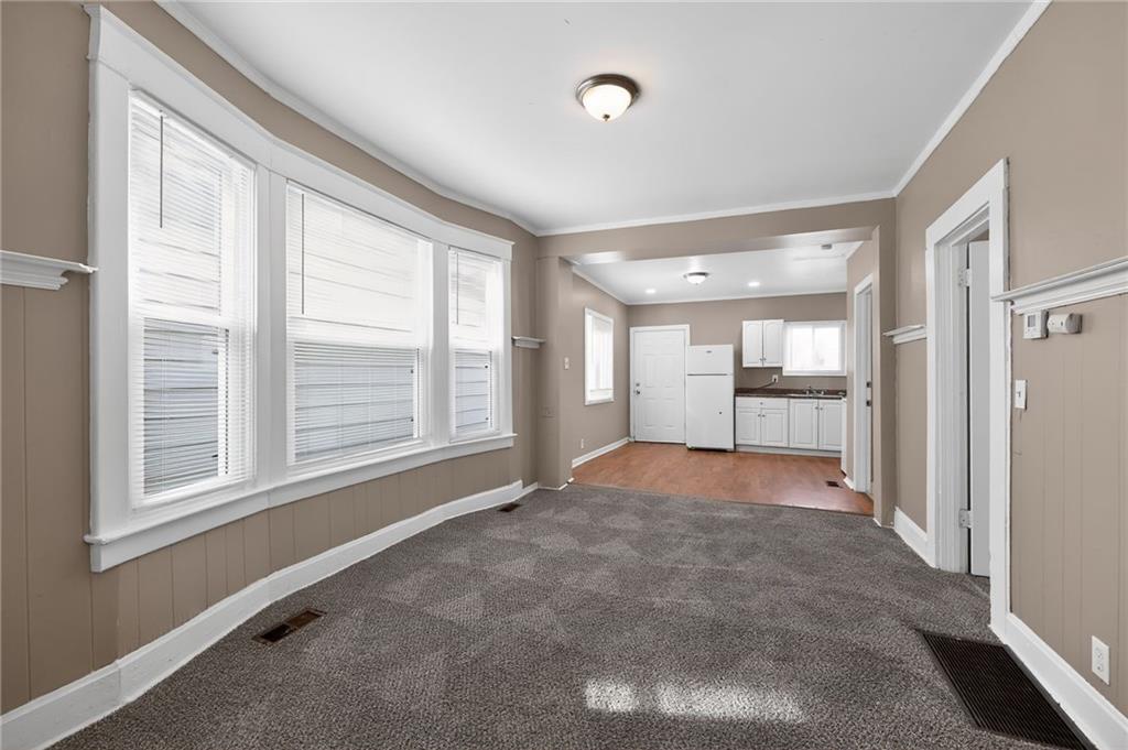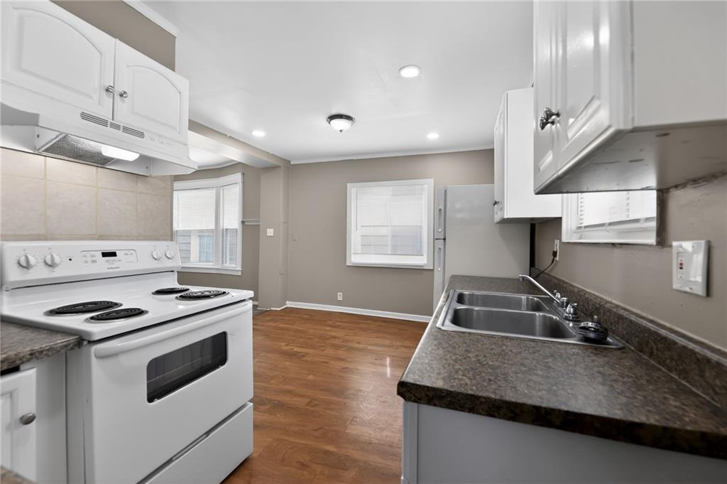 Lovely 1.5-story bungalow featuring a covered front porch and low-maintenance exterior siding, set on a level lot. Inside, the home offers a bright living area with neutral paint, white trim, and large windows that provide abundant natural light. The kitchen includes white cabinetry, laminate countertops, a double-basin sink, and white appliances, with adjacent space for dining. Carpeted bedrooms offer comfortable layouts, and the upper-level rooms feature vaulted ceilings and unique angles. Additional highlights include updated flooring in select areas, ample storage, and a functional floor plan that maximizes space throughout.