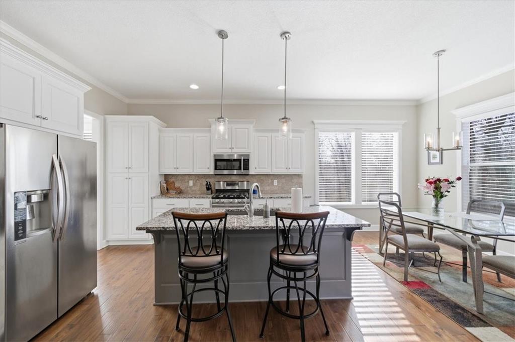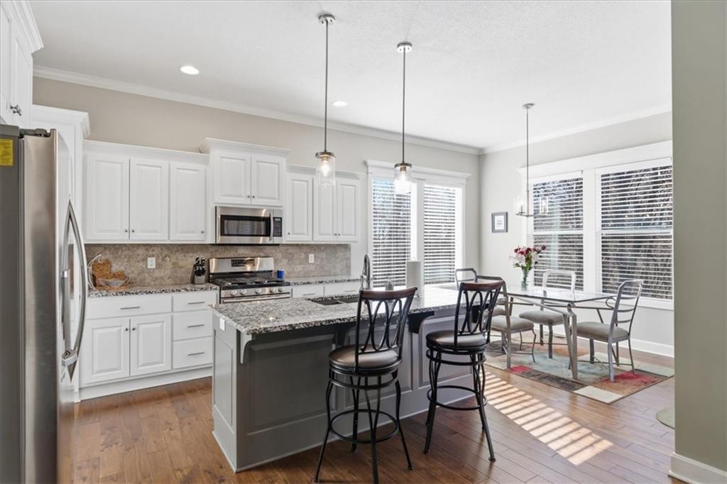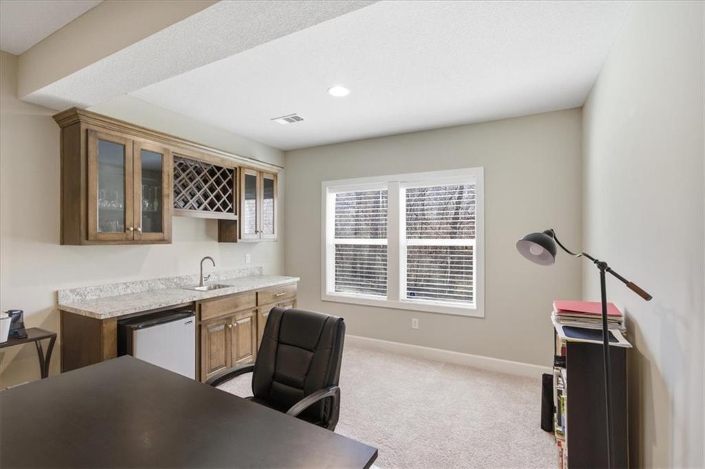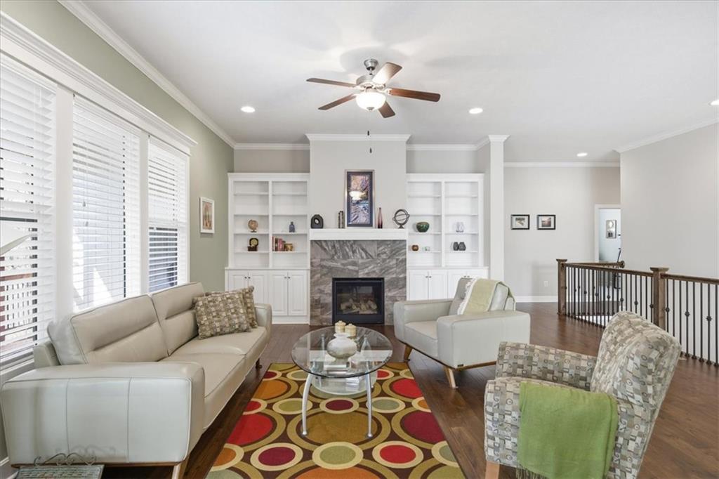 This beautifully maintained 4-bedroom, 3.5-bath ranch-style home is located in The Enclave at Shoal Creek Valley. The thoughtfully designed main level features three bedrooms, a private office with French doors, formal dining room, and a breakfast nook. Interior highlights include custom built-ins, extensive crown molding, and additional recessed lighting throughout the main living areas. The kitchen is equipped with granite countertops, a gas range, and under-cabinet lighting. Engineered hardwood flooring extends through the kitchen, foyer, great room, and primary bedroom. The primary bathroom offers a sliding barn door, custom cabinetry, and a soaking tub. The finished walkout lower level includes an additional bedroom, full bathroom, expansive family room, and wet bar—ideal for entertaining. The home backs to a wooded preserve, offering scenic natural views from the covered, stained deck and lower-level patio. Additional upgrades include high-efficiency blown-in insulation, a LeafFilter gutter guard system, epoxy-coated garage floor, insulated garage doors, and a utility sink in the garage. Age: 8.5 years (Original owners; purchased new on October 1, 2017) Total Finished Living Space: 3,415 sq. ft. Main Level: 2,345 sq. ft. Lower Level: 1,070 sq. ft. HOA Dues: $146/month ($1,750 annually) Gated entry with access to community pool Clubhouse and water park amenities