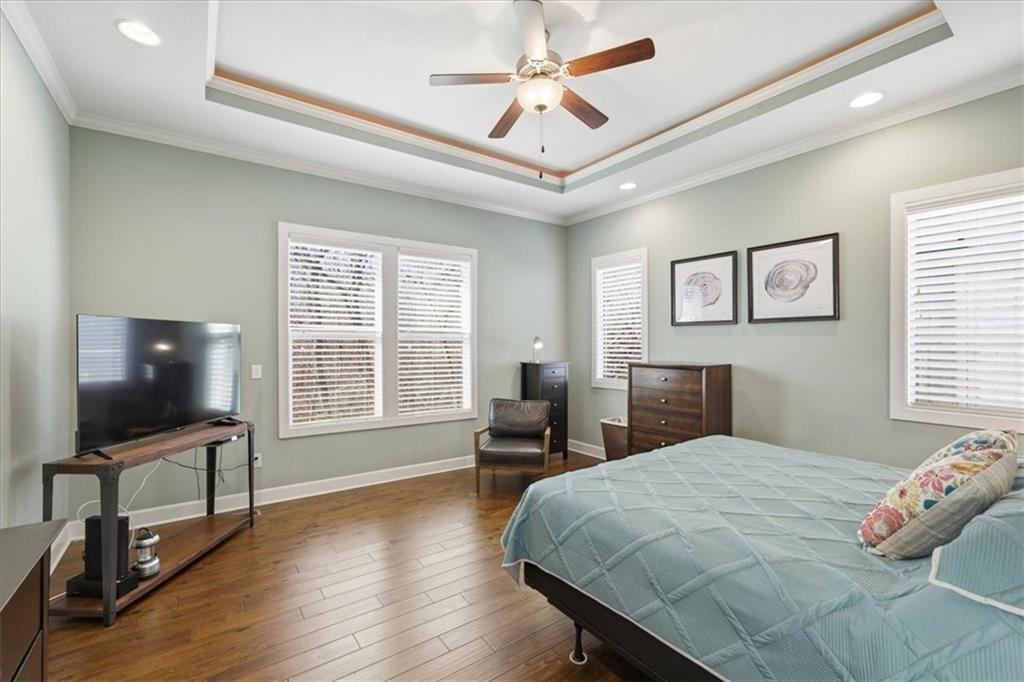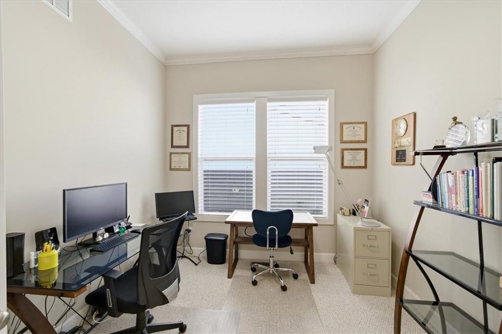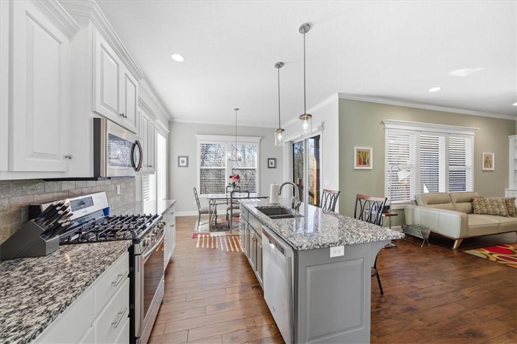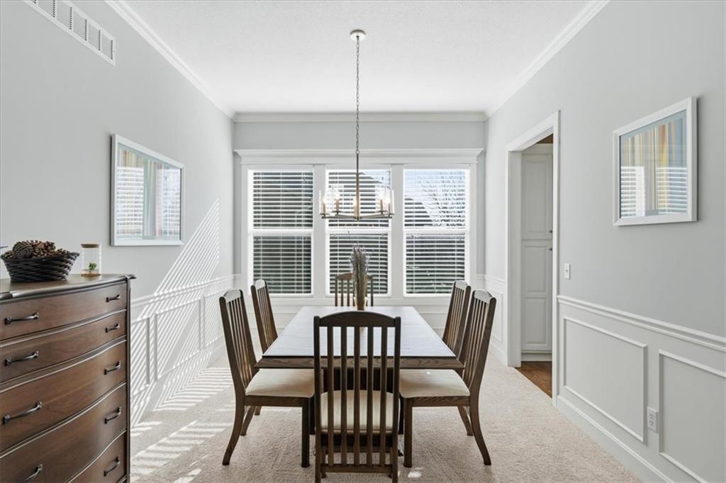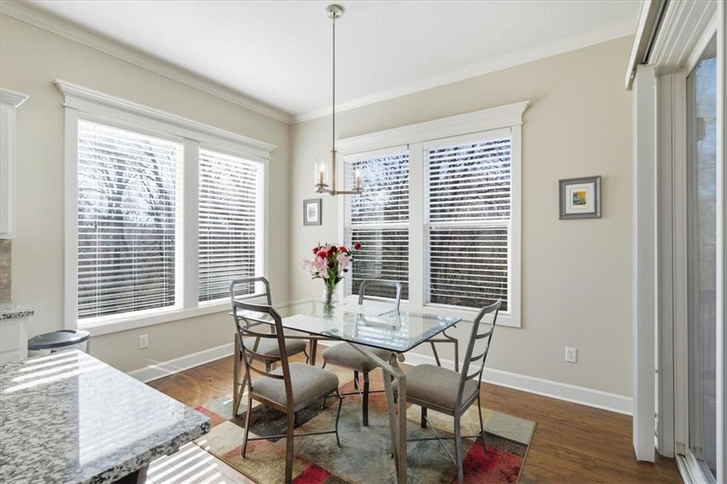 This beautifully maintained 4-bedroom, 3.5-bath ranch-style home is located in The Enclave at Shoal Creek Valley. The thoughtfully designed main level features three bedrooms, a private office with French doors, formal dining room, and a breakfast nook. Interior highlights include custom built-ins, extensive crown molding, and additional recessed lighting throughout the main living areas. The kitchen is equipped with granite countertops, a gas range, and under-cabinet lighting. Engineered hardwood flooring extends through the kitchen, foyer, great room, and primary bedroom. The primary bathroom offers a sliding barn door, custom cabinetry, and a soaking tub. The finished walkout lower level includes an additional bedroom, full bathroom, expansive family room, and wet bar—ideal for entertaining. The home backs to a wooded preserve, offering scenic natural views from the covered, stained deck and lower-level patio. Additional upgrades include high-efficiency blown-in insulation, a LeafFilter gutter guard system, epoxy-coated garage floor, insulated garage doors, and a utility sink in the garage. Age: 8.5 years (Original owners; purchased new on October 1, 2017) Total Finished Living Space: 3,415 sq. ft. Main Level: 2,345 sq. ft. Lower Level: 1,070 sq. ft. HOA Dues: $146/month ($1,750 annually) Gated entry with access to community pool Clubhouse and water park amenities