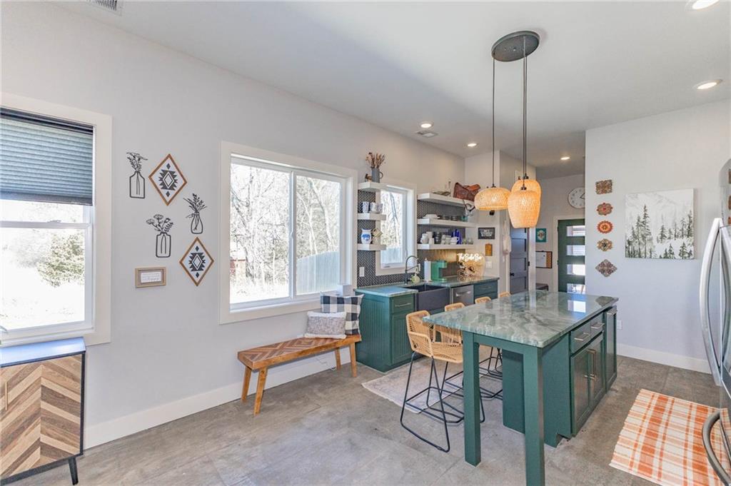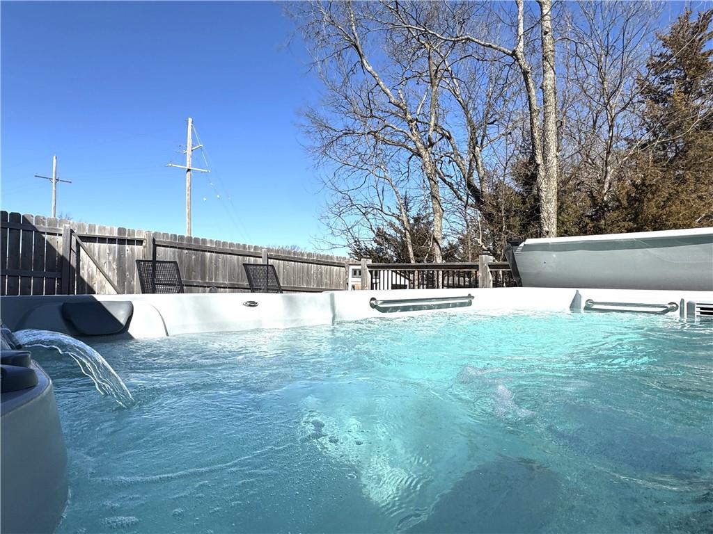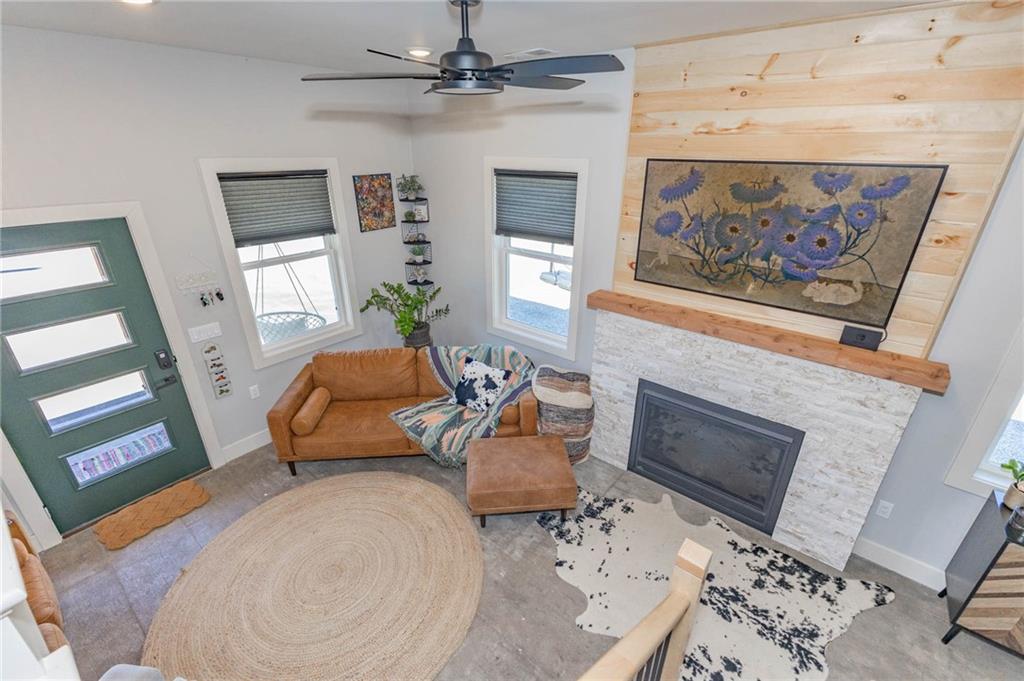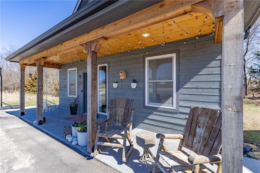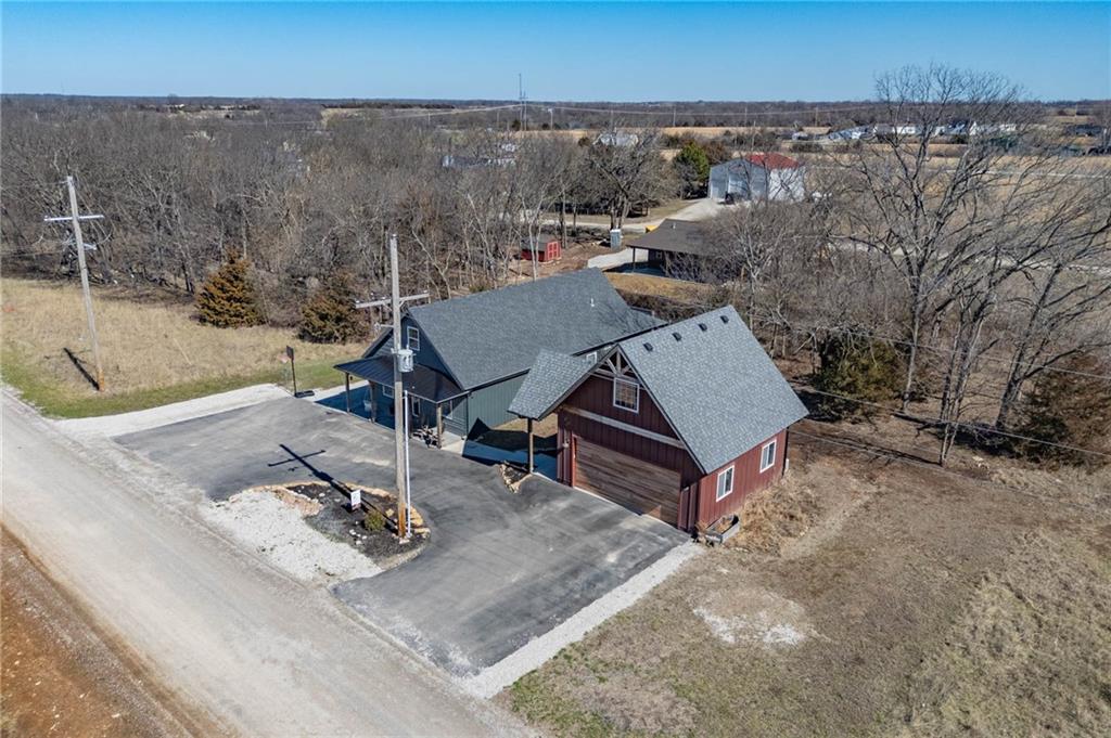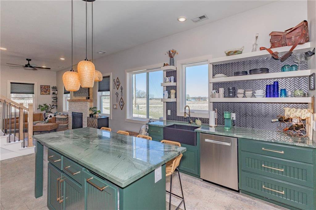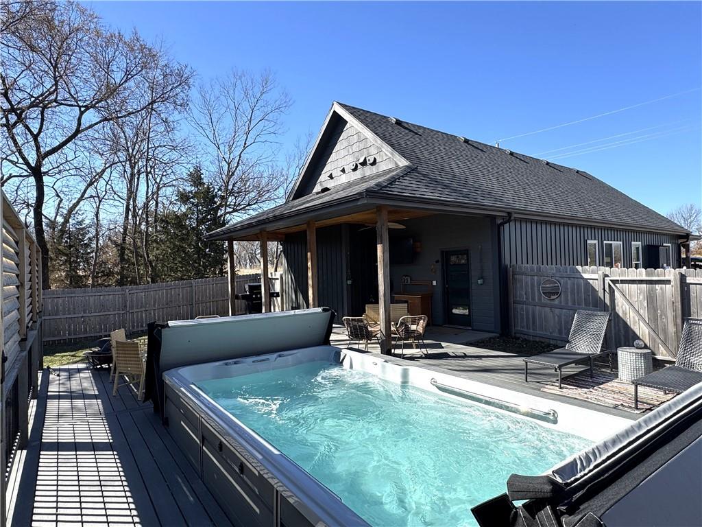 This is truly a custom home, located within the gated community of Linn Valley Lakes. Nothing about this home is builder grade including design, quality, features, or style. Enter the home and you are treated to a beautiful gas fireplace with a stone face, concrete floors, and designer fixtures. 10 ft ceilings provide the open look and feel throughout the entire main level. The chef's kitchen includes high-end stainless-steel appliances, a gas stove, custom cabinets with brass handles and stunning green quartzite countertops. The quartzite is heat resistant has the look of marble, yet it is easier to maintain. Four can sit at the island, but there is room for a small table if you wish. The backsplash is black subway tile laid in a herringbone pattern on one side and a beautiful gold and black hexagon pattern on the other. As you leave the kitchen and head to the back door, there is a large pantry, a laundry room, and a mudroom. Get ready to feel pampered in the primary suite. The large bedroom has a feature wall and lots of natural light. The primary bath includes a quartzite vanity with double sinks and beautiful brass lighting. The shower is a work of art with 4 different tiles that blend to create something beautiful. A bidet? You bet! The main bath and the second bedroom are also on the main floor. Going up the stairs, you have gray carpeting and white wood trim with black iron balusters. The 3rd bedroom is a loft, and it has a walk-in closet. The fully fenced backyard has a resort feel with over 200 sq feet of covered porch and then decking extending out to the large swim spa. The jets can create a water flow for swimming, and it feels more like a pool than a spa. The detached garage has a bonus room upstairs that is heated and cooled by a mini split and makes a great office, craft room or simply a get-away space for kids (or adults). It would be impossible to re-create this home for the list price, so make plans to see this special home soon!