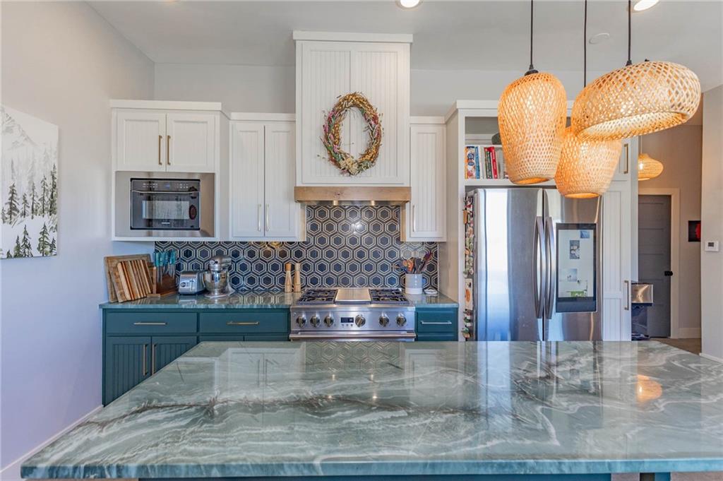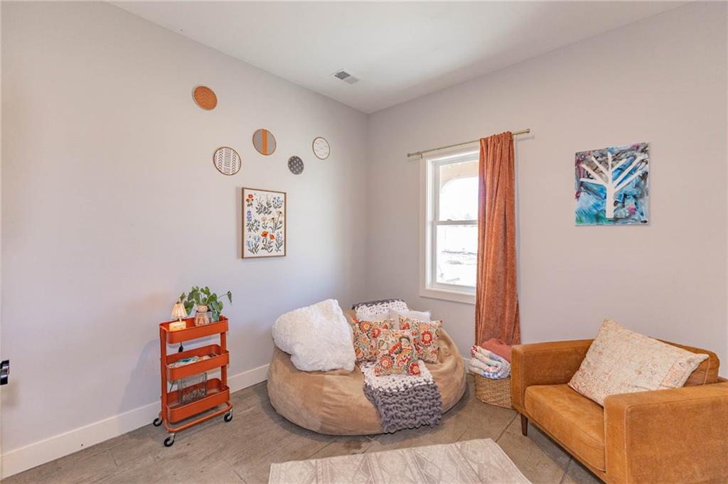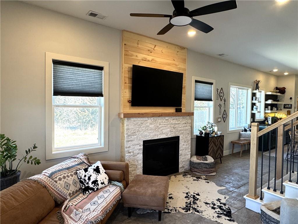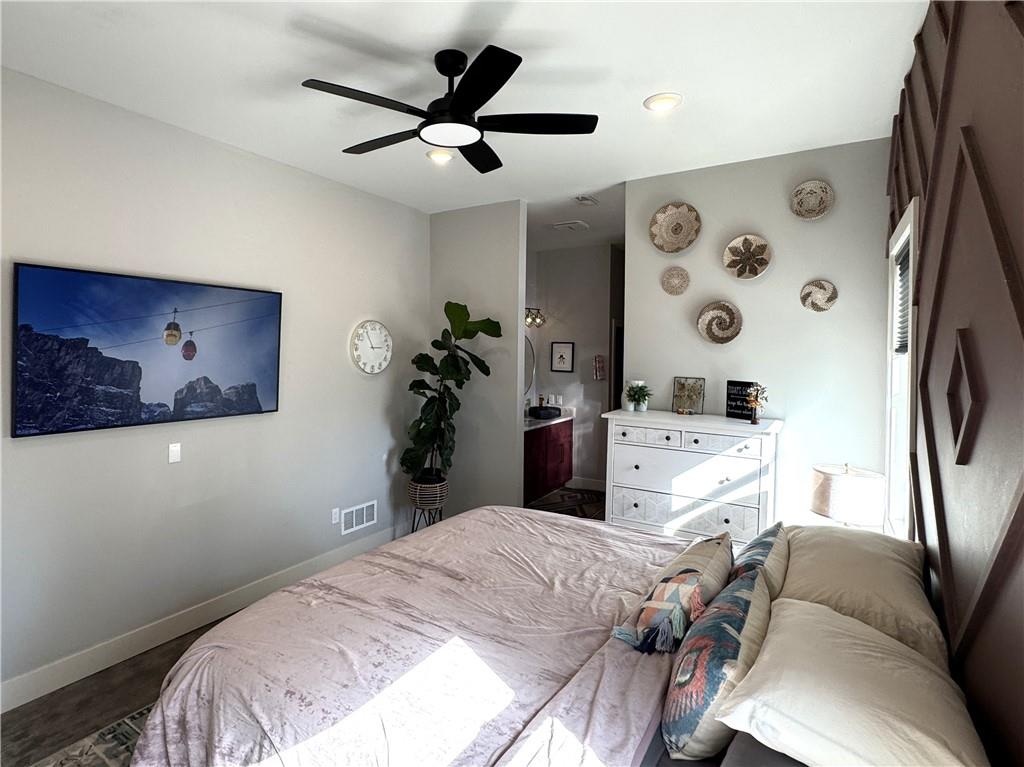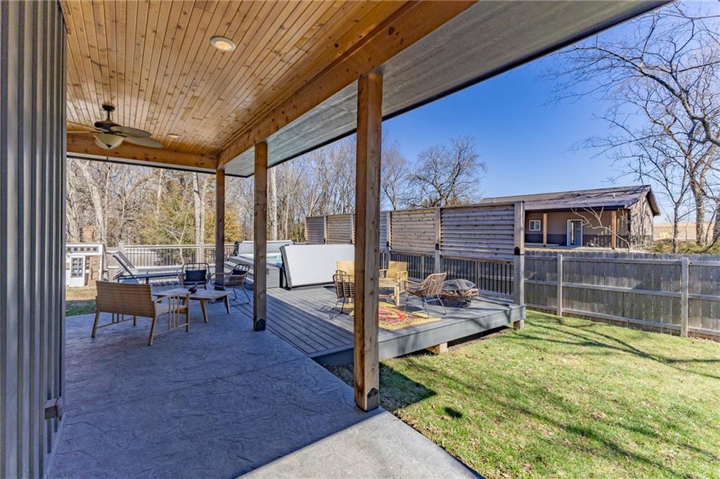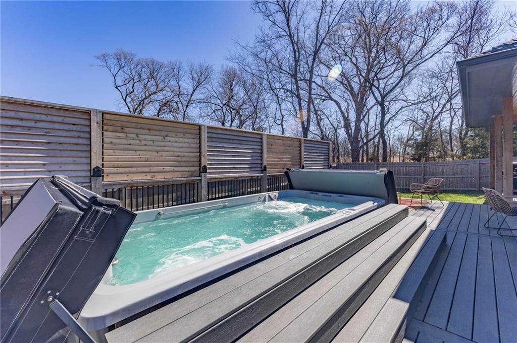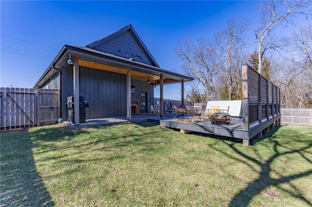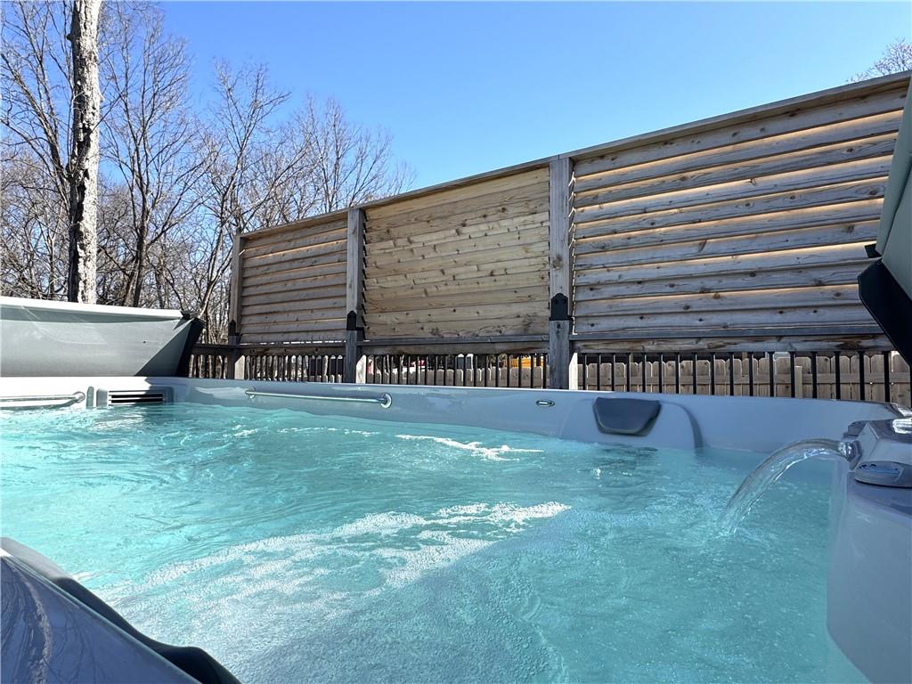 This is truly a custom home, located within the gated community of Linn Valley Lakes. Nothing about this home is builder grade including design, quality, features, or style. Enter the home and you are treated to a beautiful gas fireplace with a stone face, concrete floors, and designer fixtures. 10 ft ceilings provide the open look and feel throughout the entire main level. The chef's kitchen includes high-end stainless-steel appliances, a gas stove, custom cabinets with brass handles and stunning green quartzite countertops. The quartzite is heat resistant has the look of marble, yet it is easier to maintain. Four can sit at the island, but there is room for a small table if you wish. The backsplash is black subway tile laid in a herringbone pattern on one side and a beautiful gold and black hexagon pattern on the other. As you leave the kitchen and head to the back door, there is a large pantry, a laundry room, and a mudroom. Get ready to feel pampered in the primary suite. The large bedroom has a feature wall and lots of natural light. The primary bath includes a quartzite vanity with double sinks and beautiful brass lighting. The shower is a work of art with 4 different tiles that blend to create something beautiful. A bidet? You bet! The main bath and the second bedroom are also on the main floor. Going up the stairs, you have gray carpeting and white wood trim with black iron balusters. The 3rd bedroom is a loft, and it has a walk-in closet. The fully fenced backyard has a resort feel with over 200 sq feet of covered porch and then decking extending out to the large swim spa. The jets can create a water flow for swimming, and it feels more like a pool than a spa. The detached garage has a bonus room upstairs that is heated and cooled by a mini split and makes a great office, craft room or simply a get-away space for kids (or adults). It would be impossible to re-create this home for the list price, so make plans to see this special home soon!