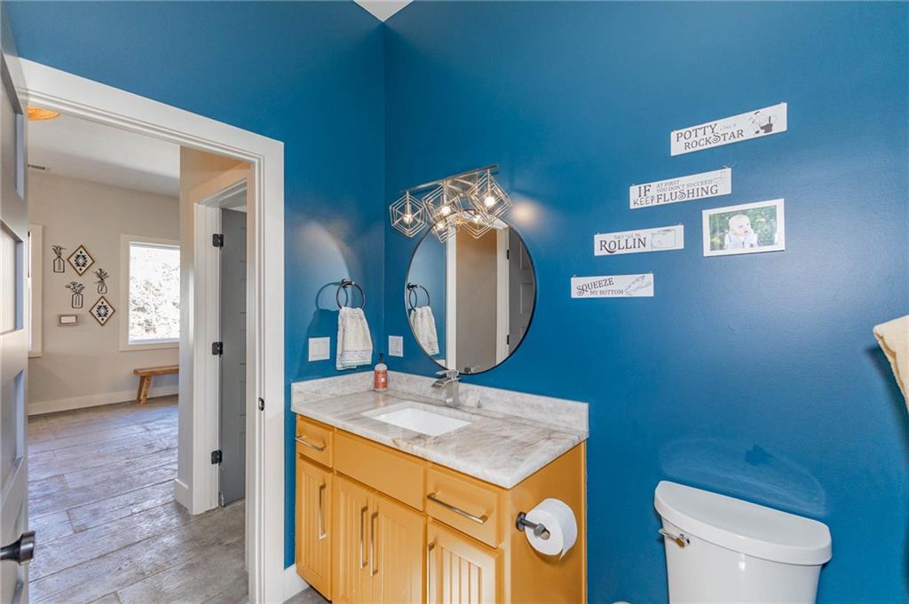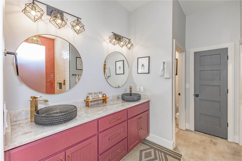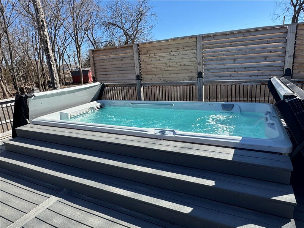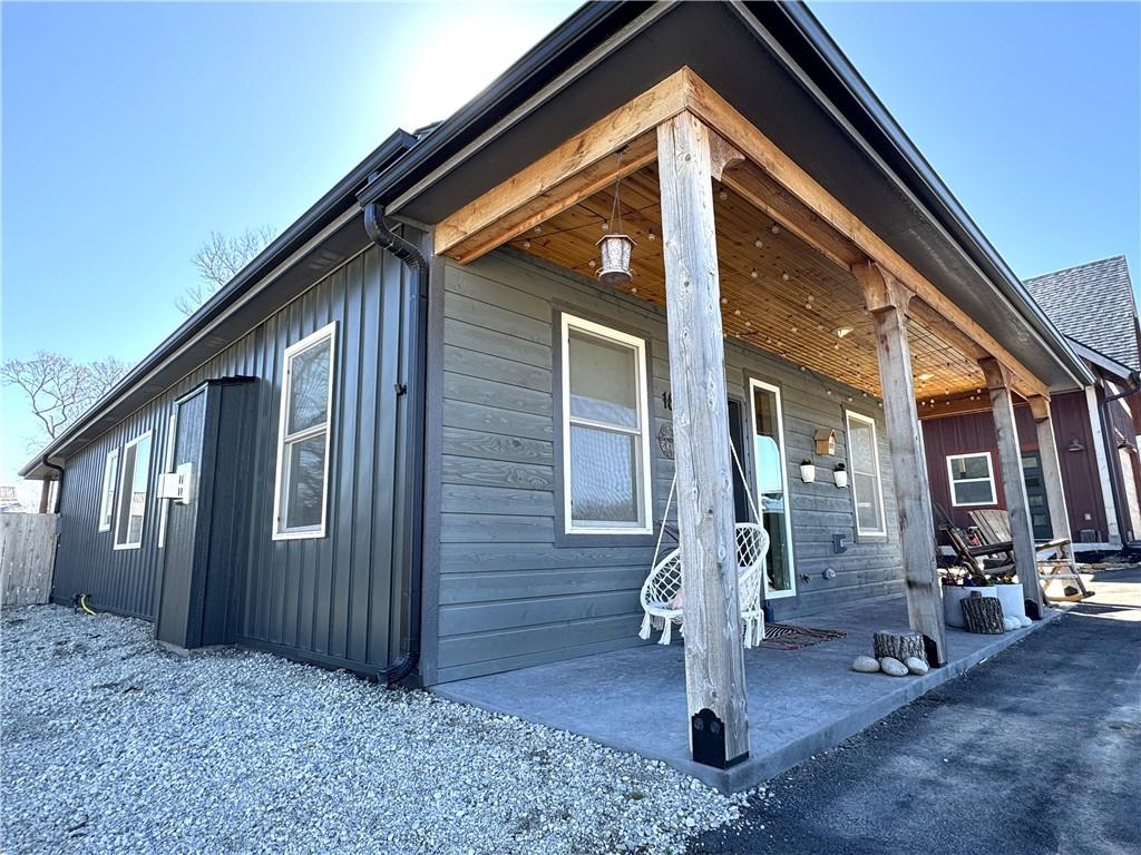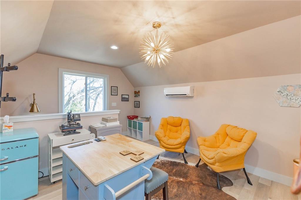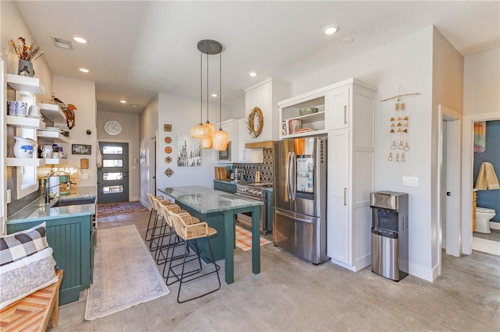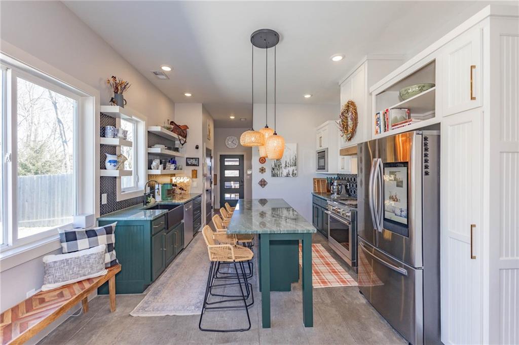 This is truly a custom home, located within the gated community of Linn Valley Lakes. Nothing about this home is builder grade including design, quality, features, or style. Enter the home and you are treated to a beautiful gas fireplace with a stone face, concrete floors, and designer fixtures. 10 ft ceilings provide the open look and feel throughout the entire main level. The chef's kitchen includes high-end stainless-steel appliances, a gas stove, custom cabinets with brass handles and stunning green quartzite countertops. The quartzite is heat resistant has the look of marble, yet it is easier to maintain. Four can sit at the island, but there is room for a small table if you wish. The backsplash is black subway tile laid in a herringbone pattern on one side and a beautiful gold and black hexagon pattern on the other. As you leave the kitchen and head to the back door, there is a large pantry, a laundry room, and a mudroom. Get ready to feel pampered in the primary suite. The large bedroom has a feature wall and lots of natural light. The primary bath includes a quartzite vanity with double sinks and beautiful brass lighting. The shower is a work of art with 4 different tiles that blend to create something beautiful. A bidet? You bet! The main bath and the second bedroom are also on the main floor. Going up the stairs, you have gray carpeting and white wood trim with black iron balusters. The 3rd bedroom is a loft, and it has a walk-in closet. The fully fenced backyard has a resort feel with over 200 sq feet of covered porch and then decking extending out to the large swim spa. The jets can create a water flow for swimming, and it feels more like a pool than a spa. The detached garage has a bonus room upstairs that is heated and cooled by a mini split and makes a great office, craft room or simply a get-away space for kids (or adults). It would be impossible to re-create this home for the list price, so make plans to see this special home soon!