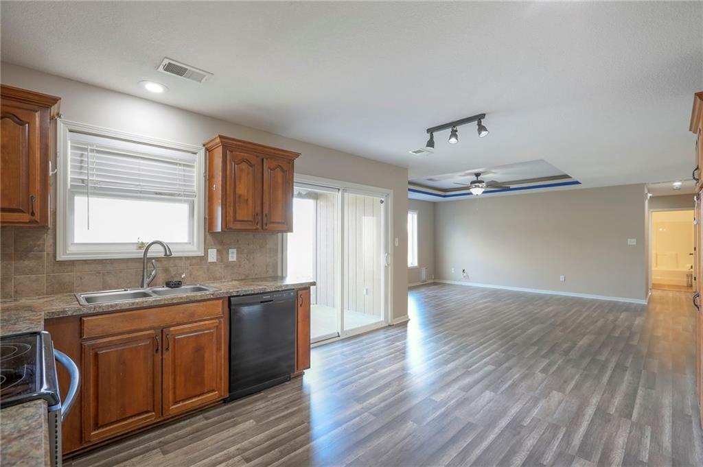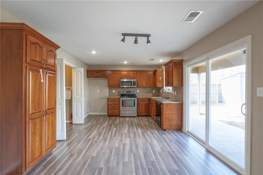 Enjoy the ease of true one-level living in this beautifully updated home designed for comfort and convenience. Fresh paint and brand-new flooring create a bright, welcoming atmosphere. The kitchen showcases beautiful wood cabinetry that adds warmth and timeless appeal, and the thoughtful layout offers three bedrooms, two full baths, and a 2-car garage to fit a variety of needs. The spacious primary bedroom includes a walk-in closet, providing generous storage and everyday practicality. Step outside to a nicely sized double-fenced yard, complete with a wood privacy fence and an additional interior chain-link enclosure—perfect for pets, play, or added peace of mind. A convenient doggie door makes outdoor access easy for your furry companions, and the covered back patio is a wonderful spot to relax or entertain. Seller to provide a one-year buyer warranty with an acceptable offer. Blending style, function, and accessibility, this move-in-ready home is ready to welcome you in.