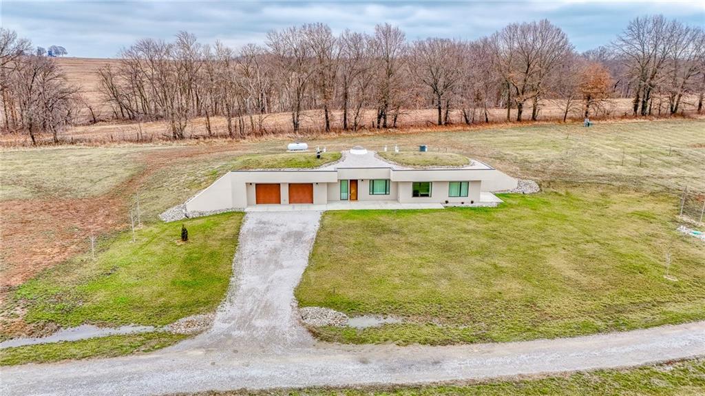 MUST SEE custom earth-contact estate on 20 scenic acres just outside Higginsville. Built in 2022, this 1,568 sq ft, 2-bedroom, 2-bath residence was thoughtfully engineered for strength, efficiency, and refined country living. Constructed with reinforced concrete walls and vaulted domed ceilings, this home offers superior durability with minimal exterior maintenance. A dramatic central skylight fills the open-concept living space with natural light, highlighting the high-end kitchen complete with Dacor luxury appliances, oversized column refrigerator/freezer, custom cabinetry with built-in organization and pull-out drawers, and a spacious walk-in pantry. Designed for year-round comfort and efficiency, the home features radiant floor heating, backup propane furnace, wood-burning stove, and a recirculating fresh air system. Average utility costs are impressively low — approximately $125/month electric (Utility Saver) and $1,000/year propane. The attached oversized 2-car garage provides generous storage and workspace. The 20 acres offer a beautiful mix of open ground and wooded privacy with abundant wildlife and endless possibilities for recreation, gardening, or simply enjoying the peaceful surroundings. This is a rare opportunity to own a nearly new, structurally superior home offering privacy, efficiency, and modern comfort — all within minutes of town.