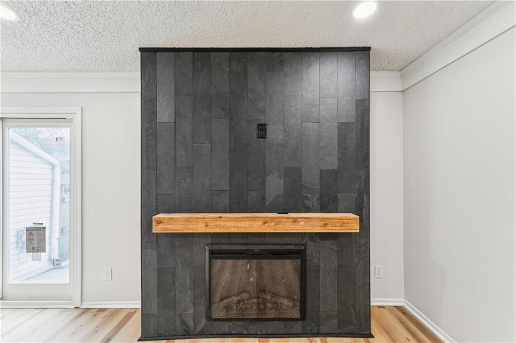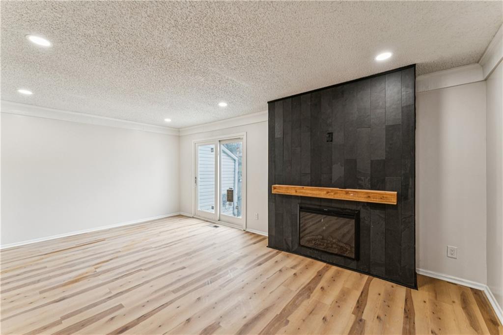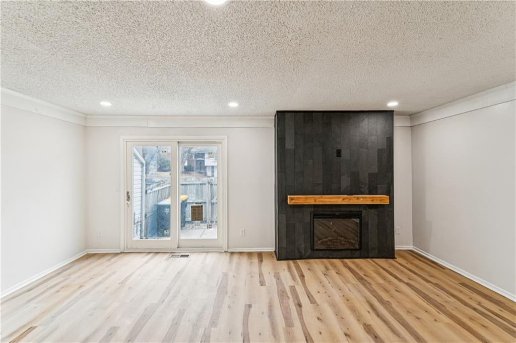 Beautifully updated townhome with a timeless contemporary design and bright, open feel throughout. The main level showcases light oak LVP flooring, sleek black hardware and lighting, and a slate-tiled electric fireplace that anchors the living space. The fully renovated kitchen features brand-new cabinetry, granite countertops, a classic subway tile backsplash, and stainless steel appliances. Upstairs, spacious bedrooms with vaulted ceilings continue the light and airy aesthetic, while the updated main bathroom offers new tile floors and surrounds, a stylish vanity, and modern fixtures. The finished basement provides a versatile bonus room perfect for a home office, rec room, or non-conforming bedroom. In addition to the cosmetic updates, the home includes a new furnace, A/C unit, water heater, and energy-efficient windows. Enjoy maintenance-free living with access to a pool, park space, and common areas; All the perks of homeownership without the hassle.