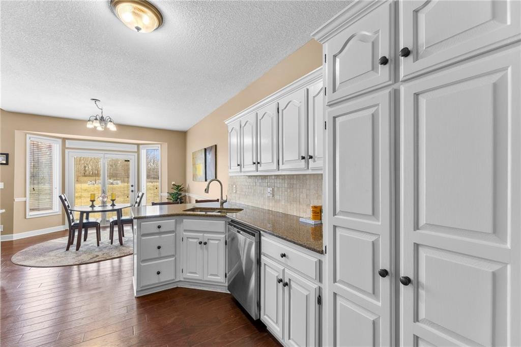 Welcome home to this well-maintained ranch in the desirable Villas of Northbrook subdivision! This 2-bedroom, 2-bathroom home offers almost 1550 square feet of MAIN level living space, including a spacious 1,492 sq ft of unfinished lower level space -- perfect for a REC room, home office, additional living area or bedroom and bathroom. The open layout features a comfortable main floor with soaring ceilings, engineered hardwood floors, main floor laundry and lots of natural light. Spacious kitchen with granite countertops, painted cabinets, stainless steel appliances and eat in kitchen make this home perfect for entertaining. Primary bedroom leads into the spacious primary bathroom with a double sink, oversized walk-in closet and shower with tile surround. Step outside to your private patio, ideal for relaxing or entertaining guests. The attached 2-car garage provides convenience and ample storage. Located in the Liberty School District with a new water heater in 2024 and a new furnace and A/C in 2019! Don't miss this opportunity to enjoy single-story living with room to grow in one of Kansas City's established communities with lawn and snow removal included in the HOA fee. Fridge, Washer and Dryer all STAY!