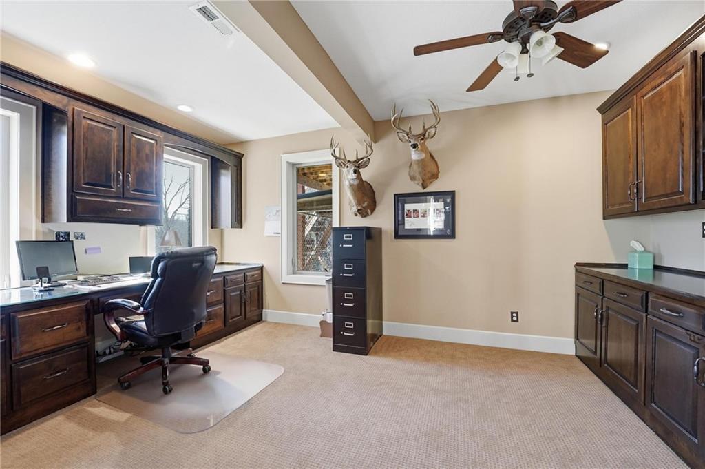 Nestled on a quiet cul-de-sac in the highly sought-after Thousand Oaks subdivision, this beautiful 1.5-story home offers space, style, and functionality. The main level boasts gorgeous dark wood floors, a spacious kitchen with a large island, touchless faucet, trash compactor, and soft-close cabinets, plus a convenient first-floor laundry room and a private home office. Retreat to the main-level master suite featuring ample space and comfort. The finished walk out lower level is perfect for entertaining, complete with a second home office, wet bar with seating and built in's and and incredible amount of storage throughout. Additional highlights include a suspended garage, screened-in porch off the kitchen, and a dog kennel accessible from the rec room. With 4 bedrooms, 4.5 baths, and thoughtful design at every turn, this home combines modern convenience with timeless charm—truly a must-see!