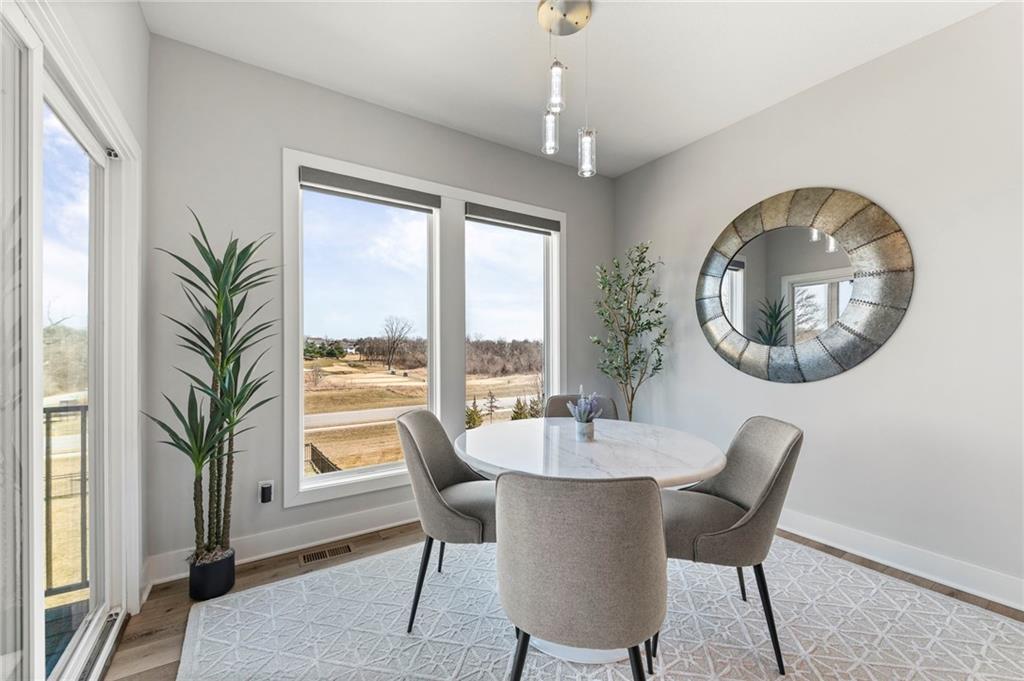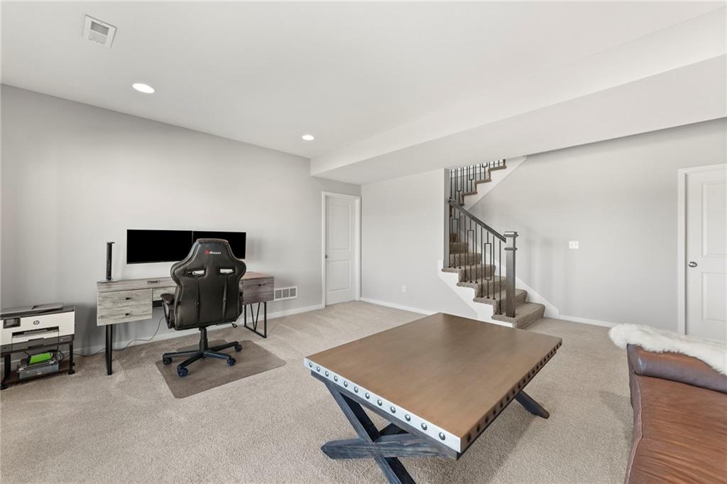 Stunning View of the Golf Course! From Tee Box to the Green par 3 View! Walkout lot on a cul-de-sac! This reverse 1.5 story home has everything you need on the main level. Enter into the great room and instantly see the spectacular view of Hole 17! Kitchen with walk-in pantry and quartz counters. Drop Zone/Boot Bench and 1/2 Bath just off the garage and kitchen. Covered deck is perfect for enjoying a cup of coffee while taking in the sunrise and the scenery! Primary suite includes bedroom with LARGE walk-in closet, bathroom with walk-in shower, laundry right off the closet, and office area. Finished lower level Family Room walks out to great fenced yard! Family Room perfect for an entertainment center. Two bedrooms and a full bath as well. Plenty of storage in the unfinished area. Fresh interior paint 2 years. Stained covered Deck. Maintenance includes comprehensive lawn care, snow removal, exterior painting, and replacement of roof and gutters as needed. Also includes access to neighborhood pool, play area, pickleball & tennis courts. Falcon Lakes golf course is a public course with a bar and grill, "The Nest". Highly rated Basehor-Linwood School District! Conveniently located just off K-7 for easy access to all parts of the metro area. Just 10 minutes to the Legends Shopping and Entertainment District and 30 minutes to the airport.