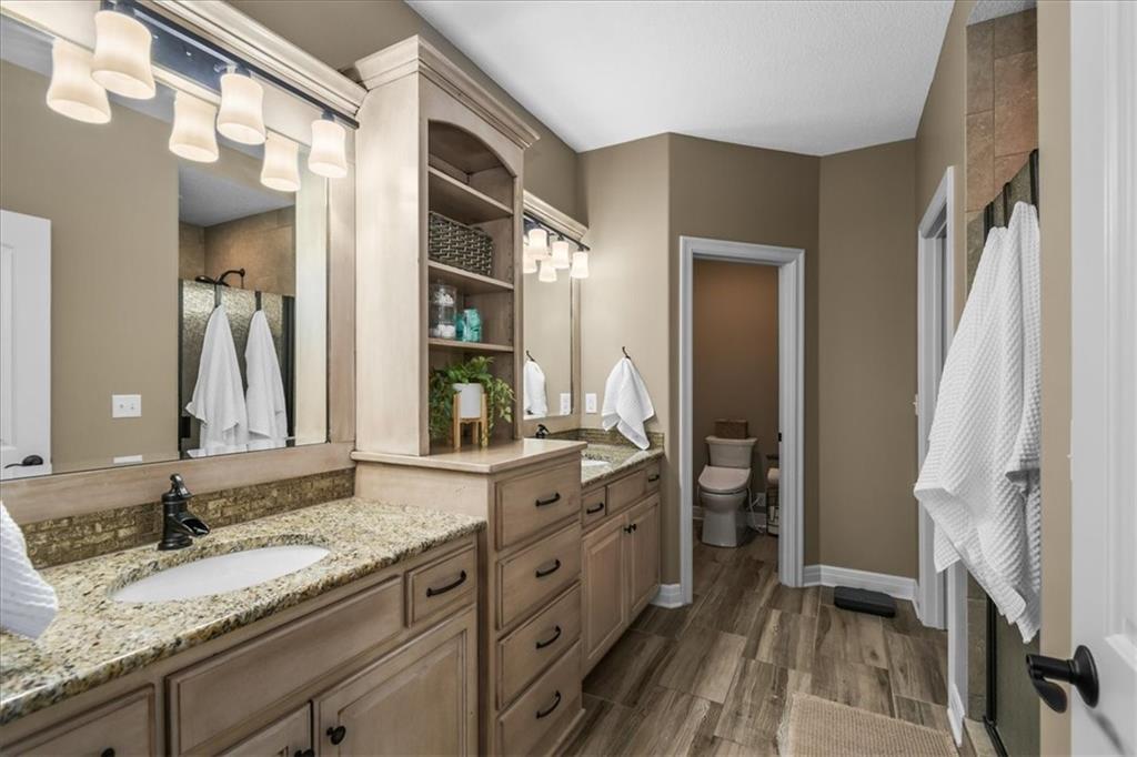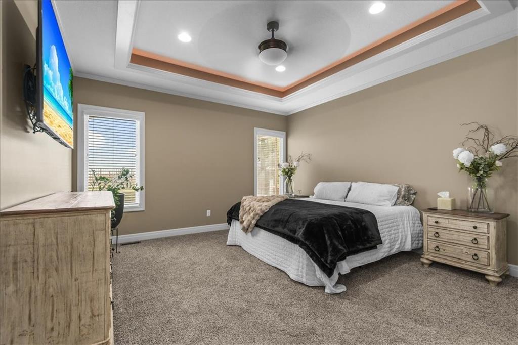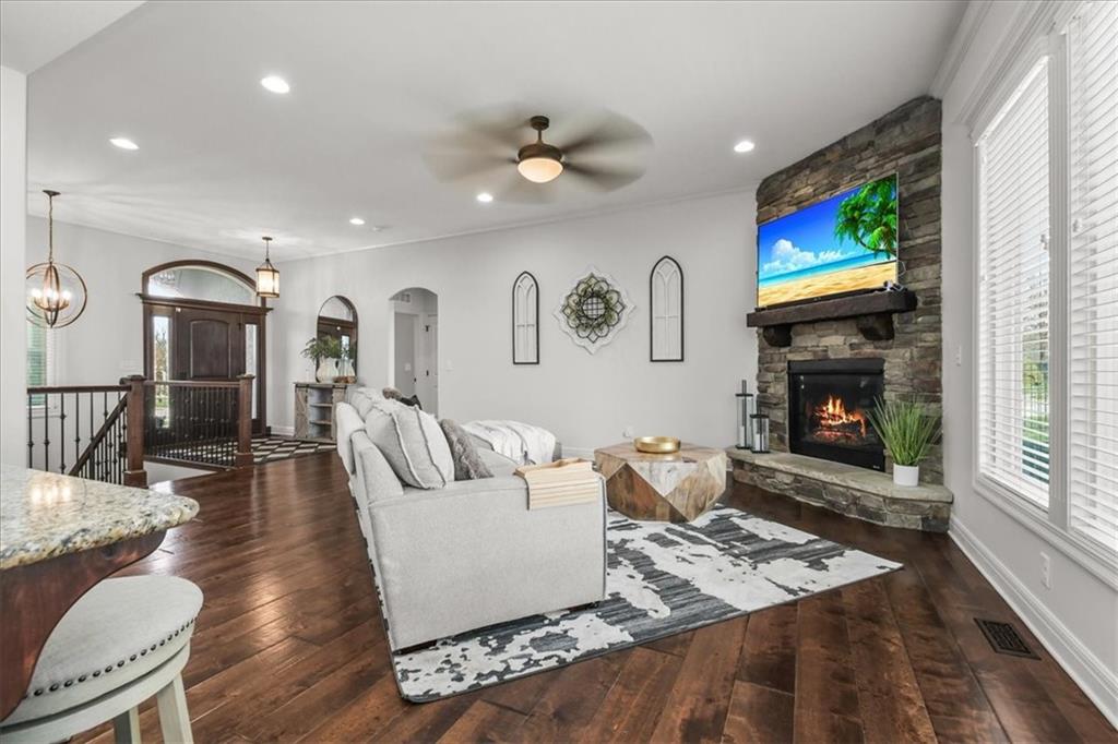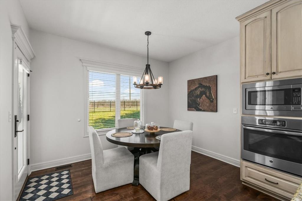 Experience the perfect blend of modern luxury and country serenity in this custom-built ranch-style masterpiece. Nestled in a quiet, secluded enclave, this home boasts an open-concept layout with 9’ and 10’ ceilings and high-end finishes. The chef’s kitchen is a showstopper, featuring Granite countertops, Rustic Alder custom cabinetry, and a large island, all accented by stunning travertine and stone backsplashes. Designed for peak efficiency and longevity, this Energy Star home features upgraded insulated polymer siding, oversized windows, and a high-performance HVAC system with a 16 SEER AC, iWave air purifier, and electric zoning. Car and boat enthusiasts will marvel at the massive 25-foot deep garage with extra-tall ceilings—perfect for large trucks or a wakeboard boat. The expansive finished basement is an entertainer's dream, showcasing a large bar area, custom rustic barn doors, and ample space for epic game nights. Retreat to the primary suite with its elegant tray ceiling, or enjoy the dual-sink vanity shared by the secondary bedrooms. Outside, the maintenance-free landscaping with Colorado river rock leads to a private east-facing patio. Overlooking peaceful farm fields, it's the ideal spot for sunrises or shaded evening BBQs. With a hydro-electric sump pump and high R-value insulated garage doors, every detail has been meticulously upgraded for comfort and peace of mind. Located near the scenic trails of Adams Dairy Road, this home offers a private retreat without sacrificing convenience.