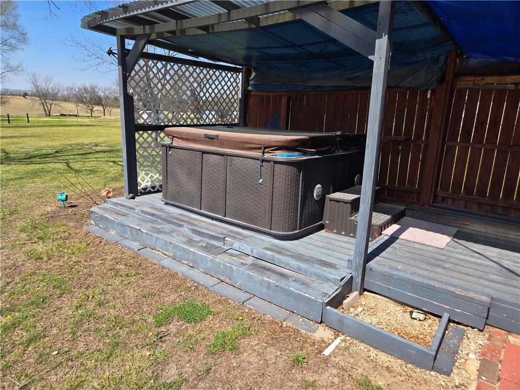 If you are looking to move to the country but stay on a blacktop road with 5+/- acres, this is the one for you! Three bedrooms and two and one half baths in a tri-level home with a metal roof. The house features two brick fireplaces with woodburning inserts to keep the house cozy on cold winter days. There is a hot tub on the covered back deck. Did I mention the two carports? One is 20'x18' and is 9' tall, the other is 25'x18' and is 13' tall. There is also a two car garage with plenty of shelving and workbench areas and a half bath as well. The kitchen comes with hard surface countertops and double stainless steel sink. The laundry room is on the same level as the bedrooms. Newer windows throughout. Set up an appointment and come take a look at this little farm home.