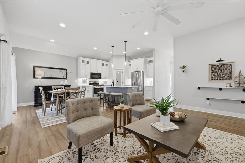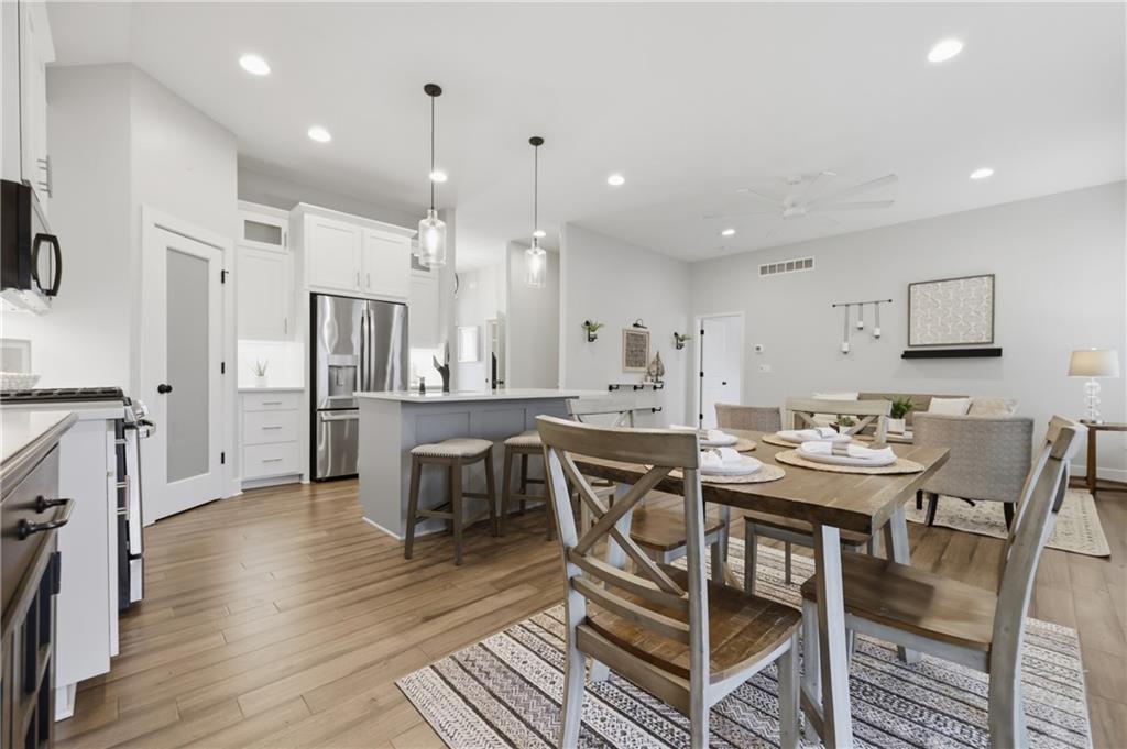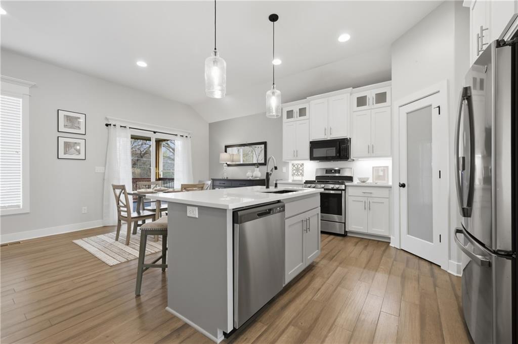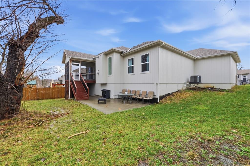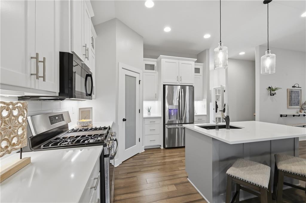 Next to new & ready for you! This beautifully maintained & spacious reverse 1.5 story home combines high end upgrades with a bright and airy design palate to create a peaceful and elevated vibe for its next owners. The open concept plan seamlessly blends the kitchen, dining & family rooms into a cohesive & comfy space that's perfect for entertaining. The kitchen is a chef's delight, with large center island, crisp quartz countertops, gas cooktop, stainless steel appliances & a large walk in pantry for all your grocery staples. Enjoy your morning coffee or evening cocktails while relaxing on the screened in deck. Inside, you'll find four well appointed bedrooms, including the spacious owner's suite with dual vanities, large shower and generous walk in closet. The finished lower level features a large open rec room with surround sound, two large bedrooms and a room full bathroom with dual vanities and private shower / toilet room. The property is located on a quiet street lined with newer homes, yet is just a short drive to both I-435 & I-470 for easy commuting throughout the metro. A must see!