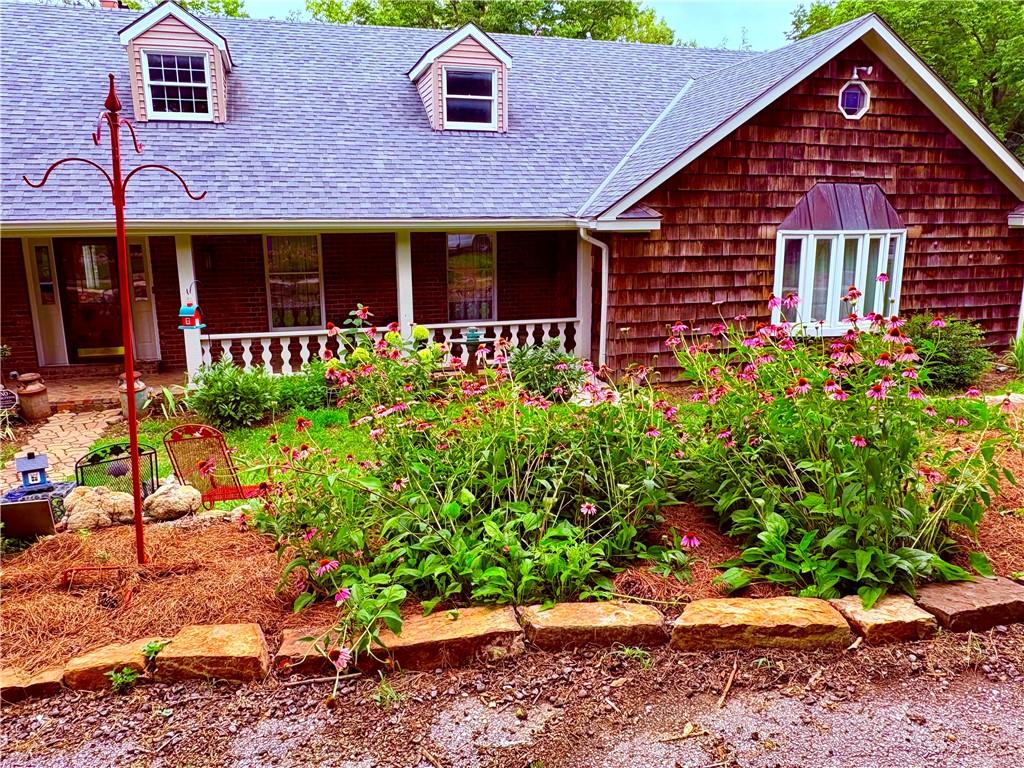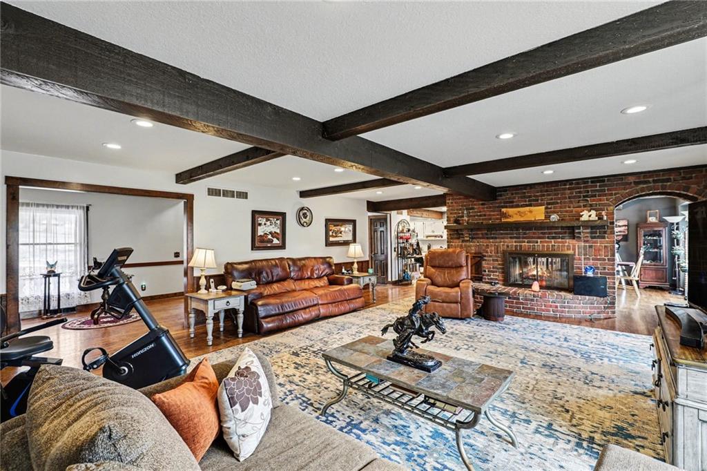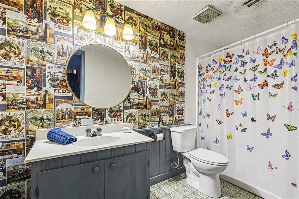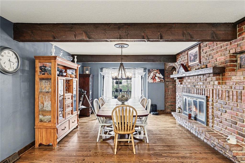 This charming, storybook home near the golf course is nestled on just over an acre with beautiful wooded views, offering character, space, and inviting farmhouse touches throughout. As you walk through the front door, you are greeted with original wood floors, open living spaces, and a gorgeous see through brick fireplace with a wood burning insert as the focal point of the living room. The dining room flows seamlessly from the living area and shares the two sided fireplace, while the spacious kitchen features granite countertops, a large pantry, and cottage inspired farmhouse charm. The primary bedroom is a true retreat with a bow window, hardwood floors, and an oversized walk in closet. The ensuite includes double sinks and a custom barn door. A second main level bedroom with its own bathroom, along with additional half baths, a laundry room, and a three car garage, complete the main floor. Upstairs offers two bedrooms and a full bathroom. The finished basement adds extra living space with a large recreation area, custom shuffleboard, a bedroom, full bathroom, generous storage, and a fourth garage, plus potential for a non conforming fifth bedroom or second kitchen. Outside, enjoy a spacious fenced backyard with a deck, covered gazebo, and patio, all backing to woods with golf course views. A charming fire pit with swings adds the perfect touch for relaxing or entertaining.