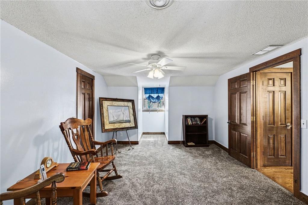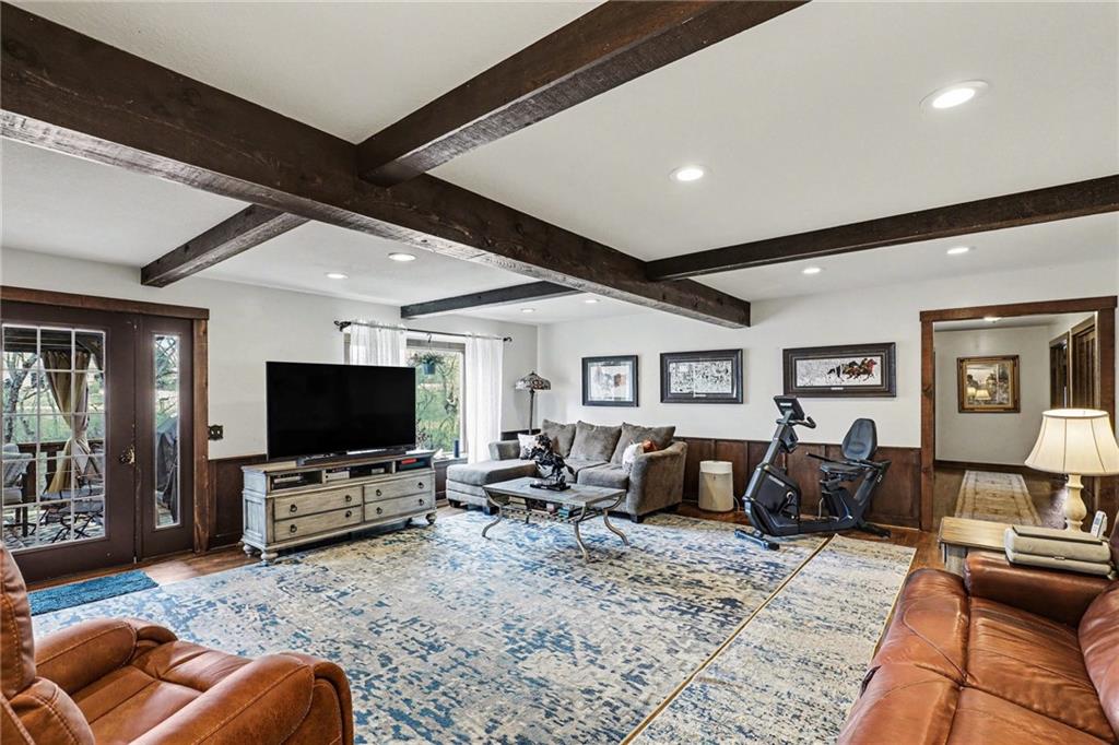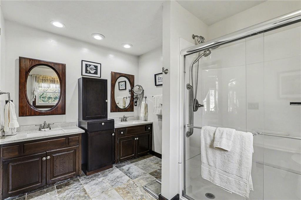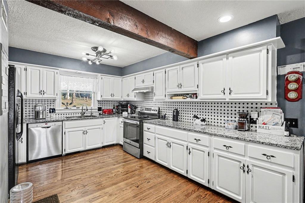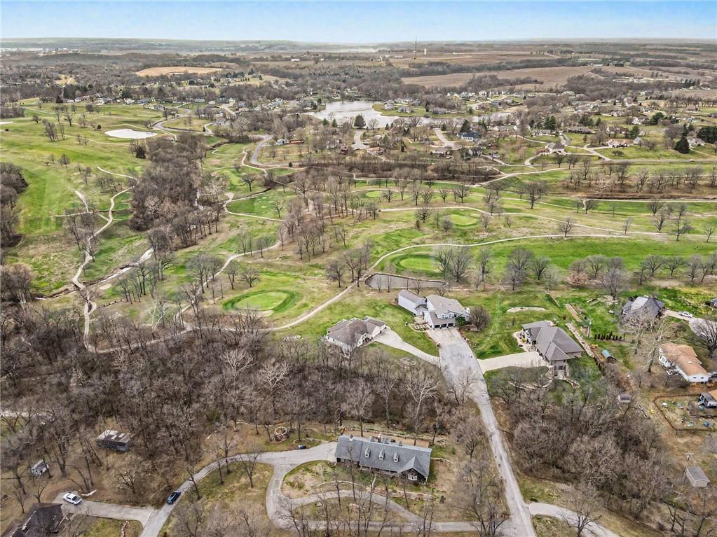 This charming, storybook home near the golf course is nestled on just over an acre with beautiful wooded views, offering character, space, and inviting farmhouse touches throughout. As you walk through the front door, you are greeted with original wood floors, open living spaces, and a gorgeous see through brick fireplace with a wood burning insert as the focal point of the living room. The dining room flows seamlessly from the living area and shares the two sided fireplace, while the spacious kitchen features granite countertops, a large pantry, and cottage inspired farmhouse charm. The primary bedroom is a true retreat with a bow window, hardwood floors, and an oversized walk in closet. The ensuite includes double sinks and a custom barn door. A second main level bedroom with its own bathroom, along with additional half baths, a laundry room, and a three car garage, complete the main floor. Upstairs offers two bedrooms and a full bathroom. The finished basement adds extra living space with a large recreation area, custom shuffleboard, a bedroom, full bathroom, generous storage, and a fourth garage, plus potential for a non conforming fifth bedroom or second kitchen. Outside, enjoy a spacious fenced backyard with a deck, covered gazebo, and patio, all backing to woods with golf course views. A charming fire pit with swings adds the perfect touch for relaxing or entertaining.