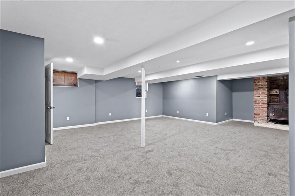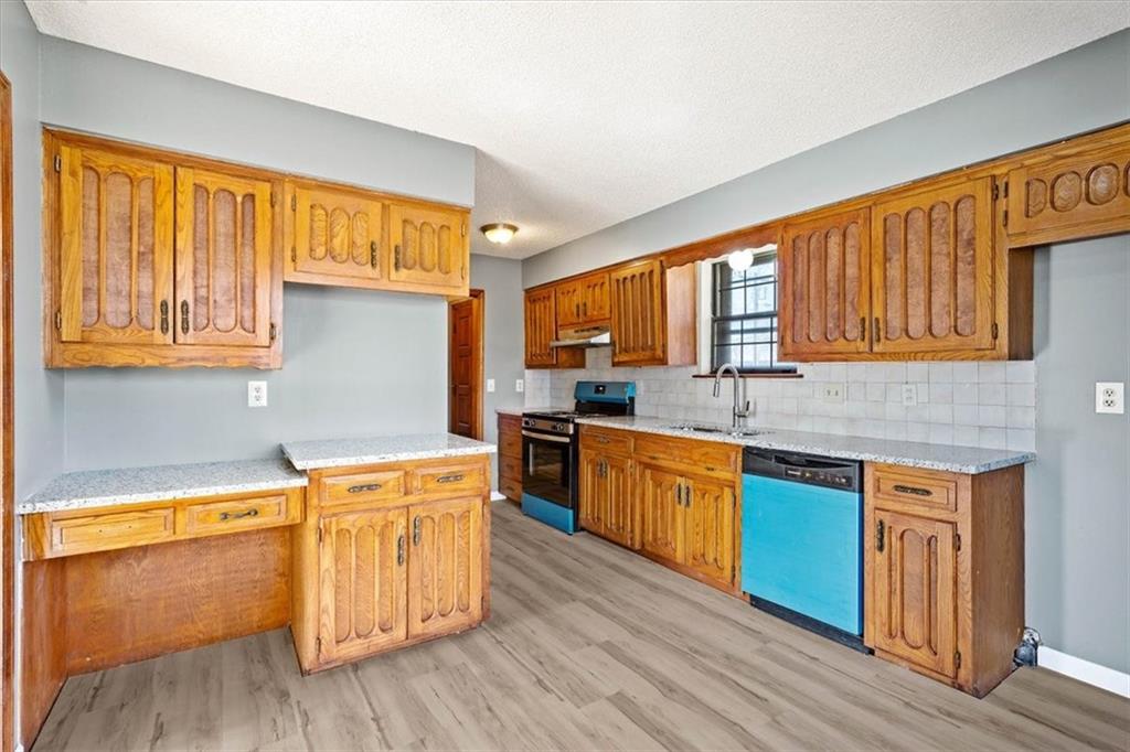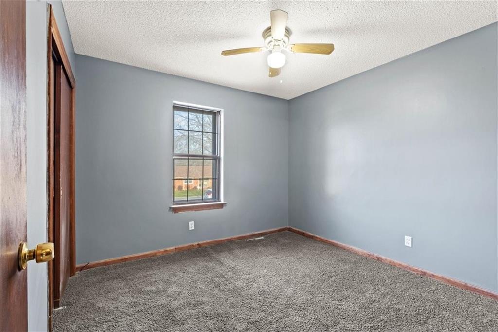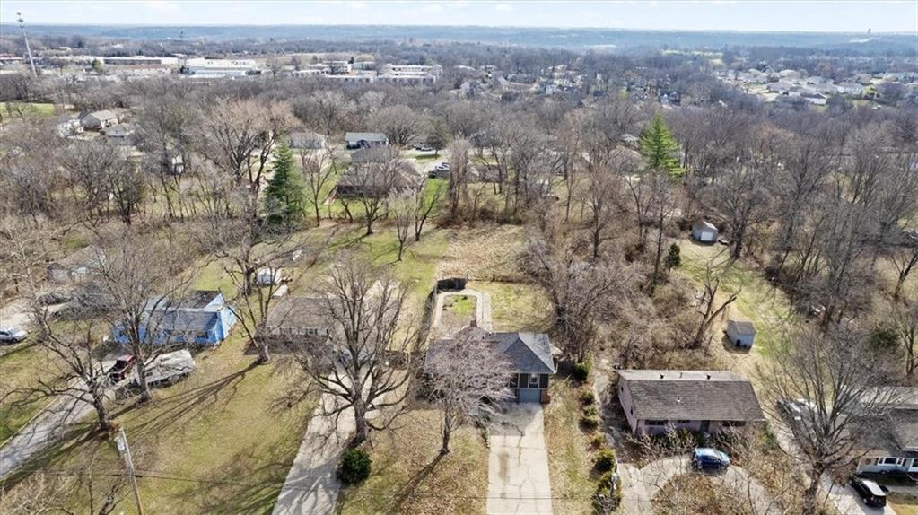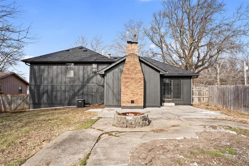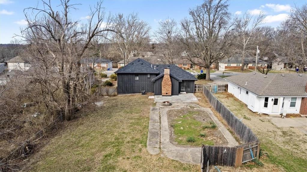 Fully updated and move-in ready, this Raytown side-split checks a lot of boxes, including one you rarely see at this price point: nearly half an acre of land. The oversized lot stretches well behind the home, giving you room to garden, play, entertain, or just breathe. Inside, the updates are everywhere. Brand new roof and gutters (2026), fresh interior and exterior paint, and new luxury vinyl plank flooring flows through the main living areas, kitchen, and entryway. The living room makes an impression with its vaulted, beamed ceiling, floor-to-ceiling brick fireplace, and a sliding glass door that opens to the back patio. The kitchen is spacious and functional, featuring solid oak cabinetry with real character, new granite countertops, updated fixtures, and plenty of room for a full dining setup. The primary suite includes a walk-in closet and a private vanity area with granite counters and its own separate shower. The finished basement is the real bonus, fully drywalled with new carpet, recessed lighting, a wood-burning stove on a brick surround, and a brand new half bath. An egress window makes it legally conforming as a fourth bedroom, and a cedar-lined closet adds serious storage. Out back, a concrete patio with a fire pit sits just off the living room, and then the yard just keeps going. Mature trees, room to expand, and privacy that's genuinely rare for this area.