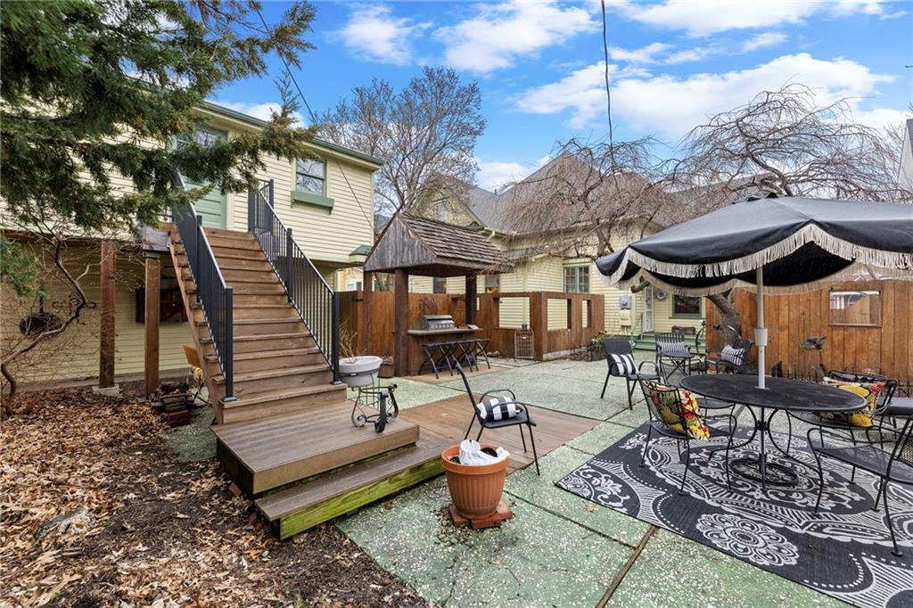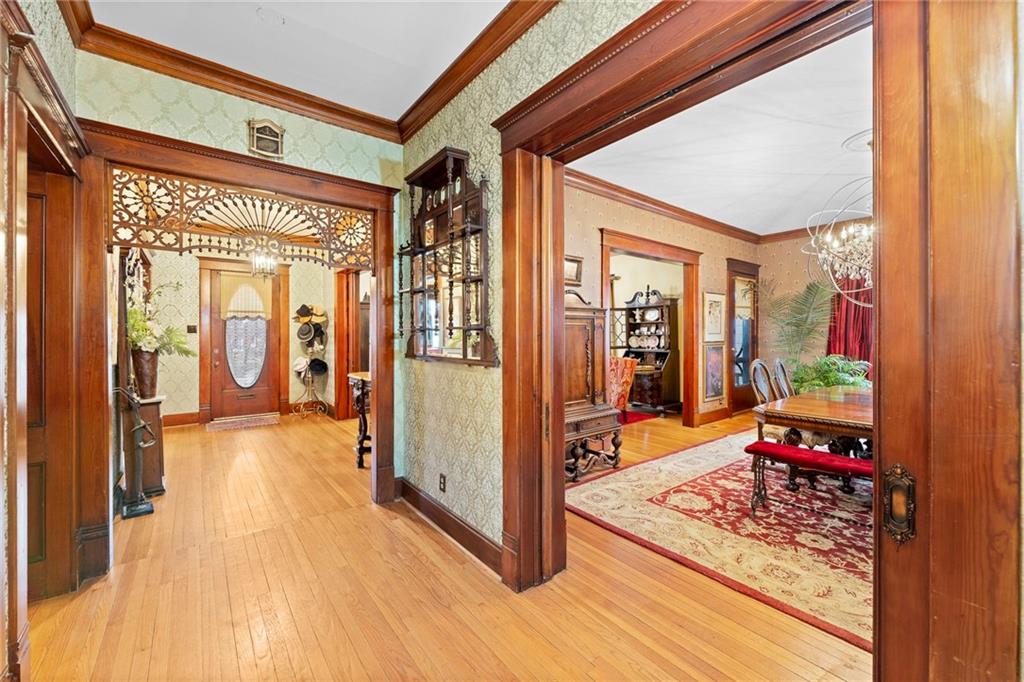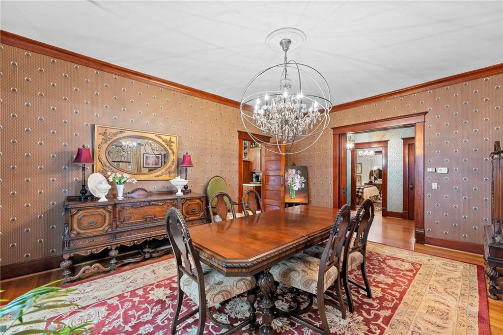 Expect to be impressed as you step into the timeless elegance of the "Washburn" house, a rare residence that masterfully blends old-world charm with sophisticated modern comfort. Meticulously updated while preserving its historic integrity, this home showcases authentic craftsmanship through unique chandeliers, ornate trim, wide crown and baseboard moldings, and original solid wood interior doors. The architectural character shines in the 3 sets of beautiful pocket doors and the lead glass windows that grace the front of the home, while modern peace of mind is provided by newer windows throughout the rest of the house and a central heat and air system installed within the last 5 years. A large, covered front porch invites you into a grand entry room, flanked by an elegant living room featuring an original fireplace and a lovely, sunlit parlor. The gourmet kitchen is a chef's dream, boasting cherry cabinetry, a quartz island, and high-end appliances including a gas stove and a new convection oven with air-frying capabilities. Two butler doors offer seamless flow into the massive formal dining room, perfect for hosting memorable gatherings. The main level features gorgeous hardwood floors and houses 3 spacious bedrooms—including a primary suite —all equipped with walk-in cedar closets and accompanied by 2 full. bathrooms. Upstairs you will find a fourth bedroom, a third bathroom, a cozy den, and a sprawling unfinished area brimming with potential for additional living space. With laundry hookups available on both the main floor and the basement, a detached garage with a finished room above, and a courtyard-style yard ideal for summer barbecues, this property is truly one of a kind. Located within walking distance of the historic Paola square, this home is ready for its next chapter—schedule your private tour today!