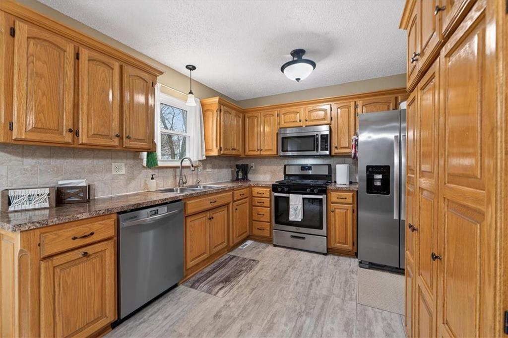 Welcome Home!! This meticulously maintained home is move-in ready! You'll love all the natural light and lower heating & cooling costs from all the new high-efficiency windows and doors installed throughout the home. The spacious living room opens into the dining and kitchen areas where you will find tons of storage from the beautiful natural wood cabinets, along with stainless steel appliances that all stay! All 3 bedrooms are on the main living level, with a 4th possible bedroom and bath on the lower level. The Primary bedroom has its own private bath with luxury vinyl plank floors, nice built-ins, and walk-in shower, and the hallway guest bath provides a shower over tub. Downstairs you'll find a completely finished lower level featuring lots of natural light and space for the whole family to enjoy AND room for a home office or that 4th bedroom. The lower level also offers a half-bath and convenient laundry room with built-in storage PLUS the washer and dryer stay! Just off the kitchen and dining area through the new sliding door you'll find a large, beautiful patio perfect for grilling or entertaining. The large yard is fully fenced and comes with a storage shed for all your outdoor tools and toys. Besides the new windows and doors, this beautiful home has had a new upgraded electrical panel installed and a new privacy fence in the back. Best of all, this home is located in the Award-Winning Blue Springs School District! And talk about convenient, you'll love that this home is located just 2 miles from the Burr Oak Woods Conservation park and trails, 1 mile from Stone Canyon Golf Club, and less than 1 mile from Blue Springs Lake! Of course, there's tons of shopping and dining choices all within minutes since I-70 is only a quick 5 minute drive away. Come see all that this hidden gem has to offer!!
