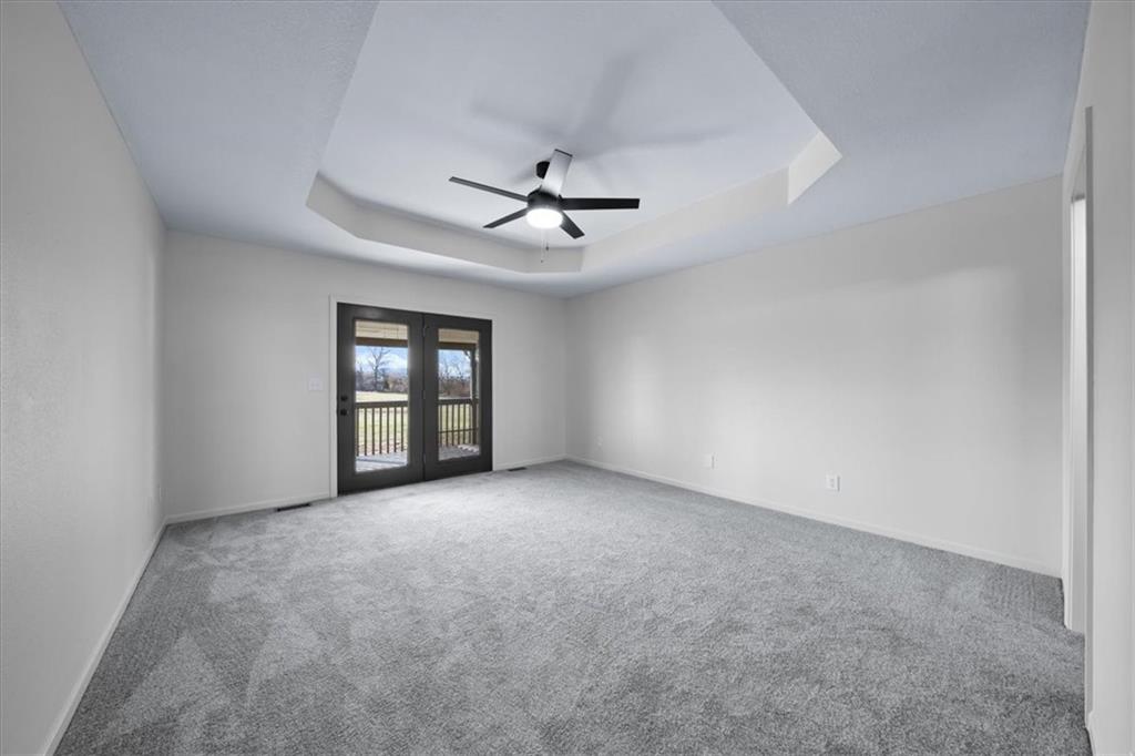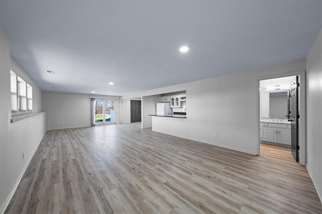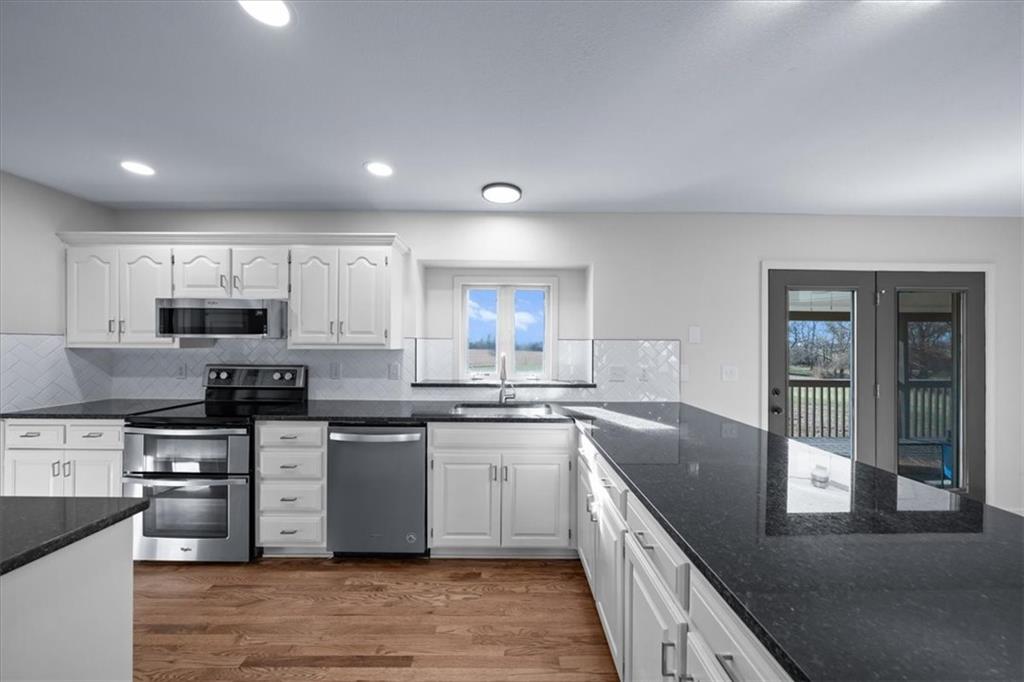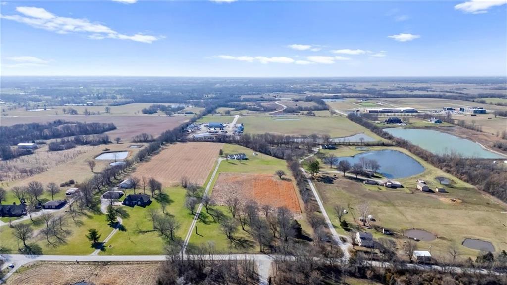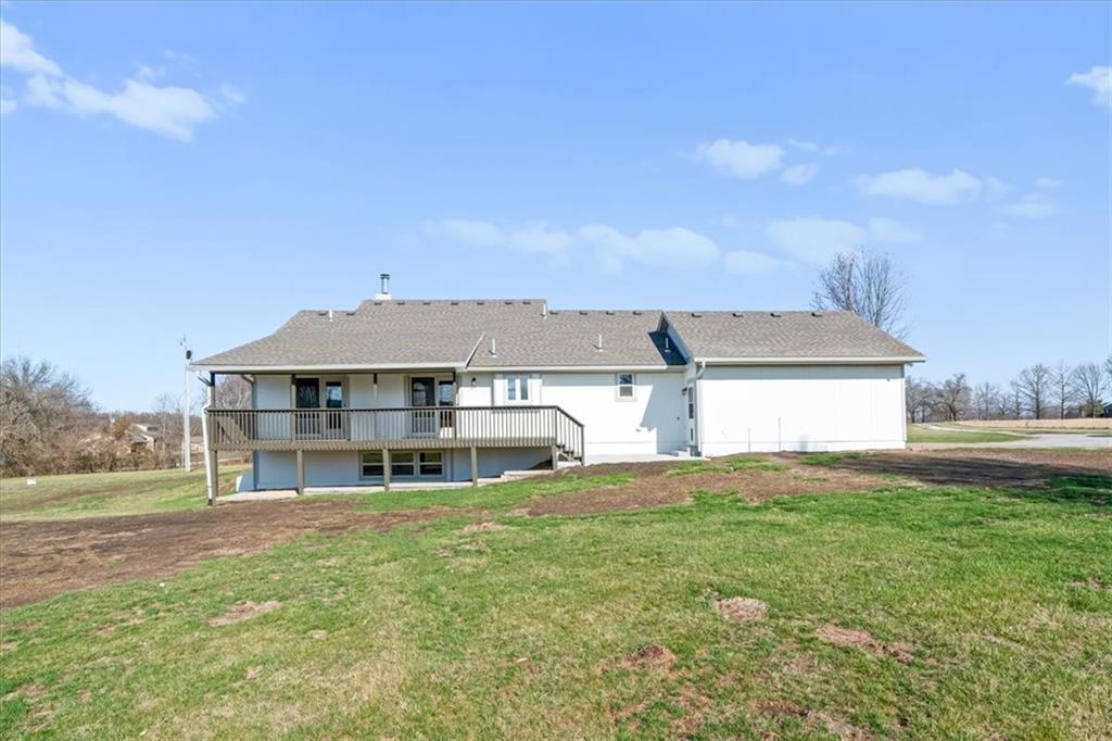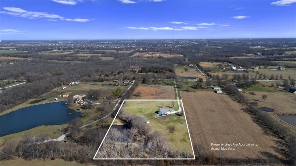 Discover peaceful country living on 5.06 m/l private acres in the desirable Raymore-Peculiar School District! This fully updated 3-bedroom, 3-bath ranch offers an inviting open floor plan with soaring ceilings in the welcoming Great Room, complete with a cozy fireplace and elegant built-in cabinetry. Gleaming refinished hardwood floors flow seamlessly through the Great Room, kitchen, and dining area. The refreshed kitchen shines with brand-new countertops and stylish backsplash, while all bathrooms feature modern updates. Fresh interior and exterior paint throughout, plus new carpet in living spaces, creates a bright, move-in-ready feel. Step outside to relax on the expansive covered deck or the brand-new patio—perfect for enjoying sunsets over your expansive, serene acreage. A shared pond adds to the tranquil setting. The walkout lower level impresses with a finished family room featuring a wet bar, a versatile office (or non-conforming bedroom), and easy access to the outdoors. Additional highlights include an epoxied garage floor for a clean, durable finish. Recent updates throughout make this turnkey ranch ideal for those seeking space, privacy, and modern comfort on acreage. Embrace the lifestyle you've been dreaming of—schedule your tour today! 40ft driveway easement already in place. Buyer & Buyer's Agent to verify all information including square footage, zoning, taxes & room sizes during the Inspection Period. Agent/Owner