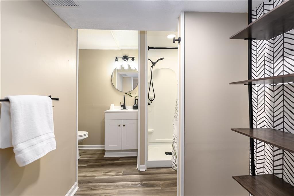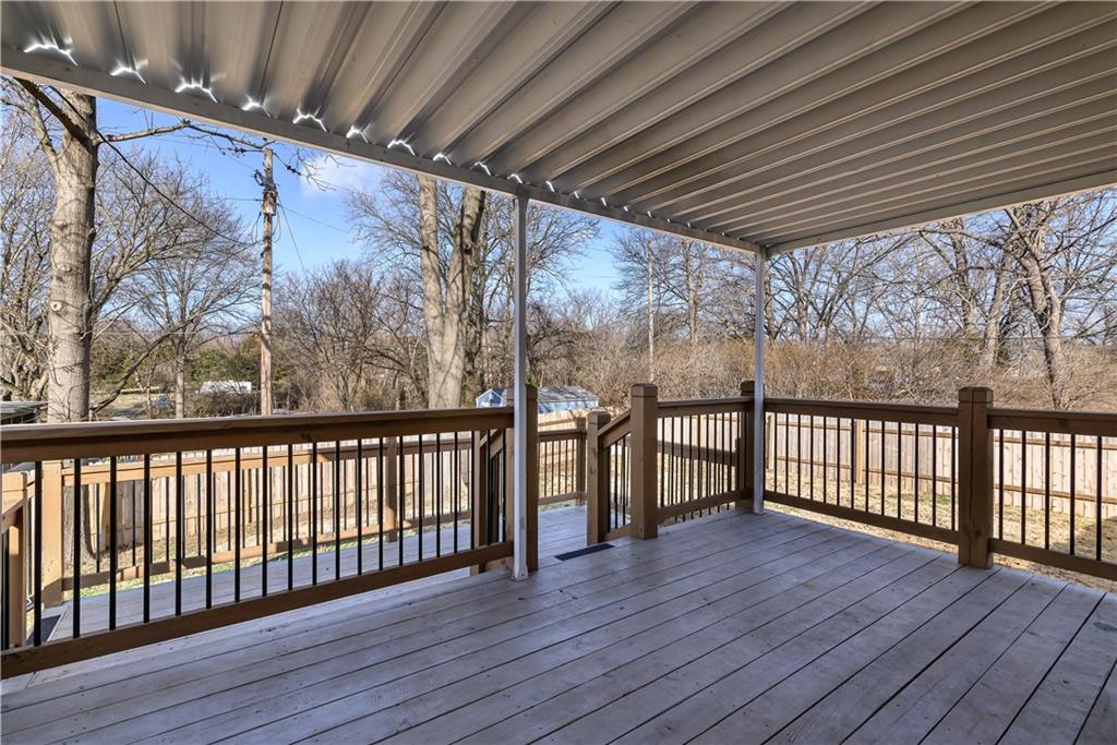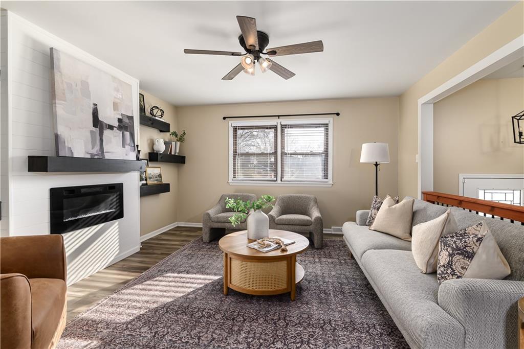 Beautifully updated home located on a quiet dead-end street just minutes from Fort Leavenworth! The upper level features a spacious living room with electric fireplace and built-in shelving, a kitchen with painted cabinets and butcher block countertops, eat-in dining area, three bedrooms, and a full bath. The lower level offers a primary suite with private full bath, walk-in closet, and newer windows. Step outside to enjoy the double-tiered deck, with one level covered, overlooking a privacy-fenced backyard—perfect for relaxing or entertaining. Additional features include a two-car garage with smart openers, extra parking pad, newer flooring throughout, updated plumbing and light fixtures, remote-controlled ceiling fans, faux wood blinds, whole house humidifier, newer concrete front steps with handrail! This Leavenworth CHARMER is move-in ready!
