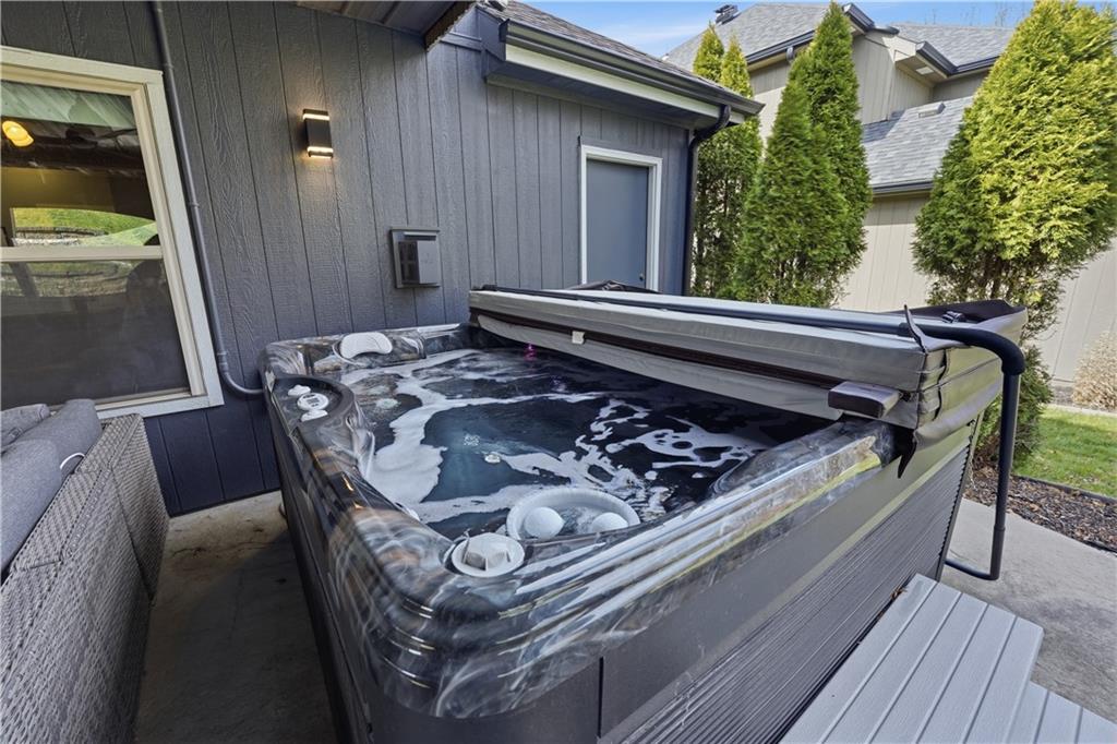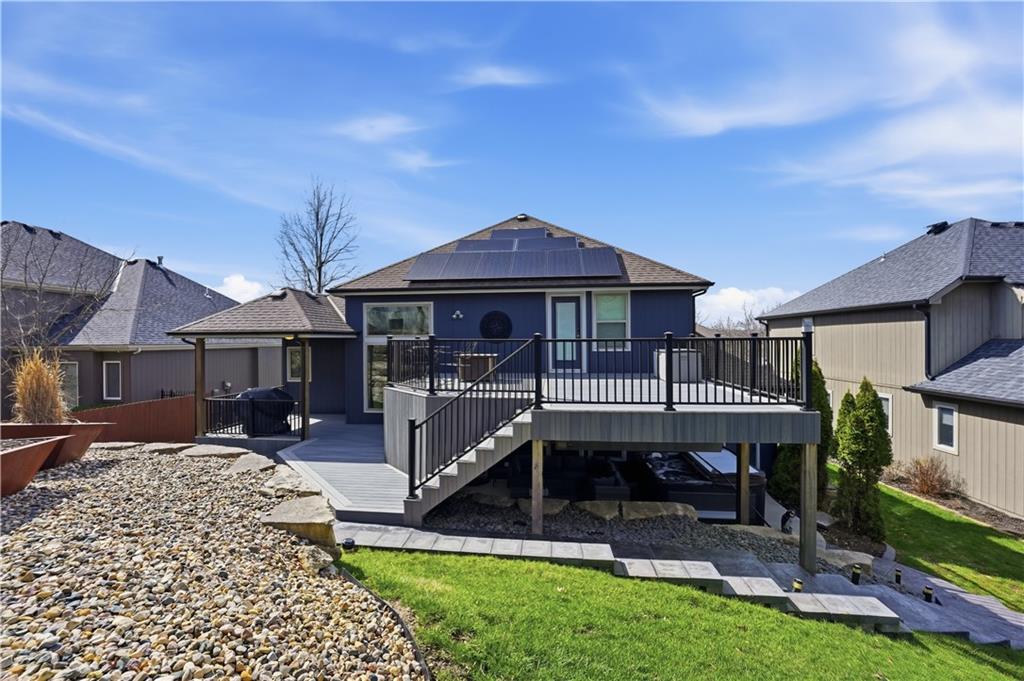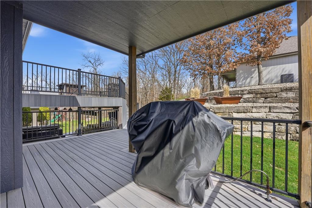 You’ll find modern luxury & unbeatable convenience in this move-in ready 4 bed, 3 ½ bath home packed with extra features. Experience the perfect blend of high-tech sustainability and resort-style living. Ideally situated on a quiet dead-end street in the highly rated Park Hill School District, this home is a commuter’s dream. Reach downtown in just 10 minutes and KCI in 15 min. The interior is designed for both grand entertaining and quiet comfort. The gourmet kitchen features a large center island, granite, gas cooktop and a walk-in pantry for ultimate storage. The spacious primary suite features a spa-like ensuite bath and direct access to the huge deck and play area. The flexible lower level features a full private suite with its own private bath—ideal for a home office or long-term guests. The outdoor living space is a true year-round retreat with a massive composite deck that spans the back of the house, featuring a covered section and a built-in natural gas grill with easy access to the kitchen. Below the deck is a private, stamped concrete patio with a "dry ceiling" system. Stay comfortable and dry in any season with a gas heater, outdoor TV, and a relaxing hot tub. The patio adjoins the large family room with fireplace, a half bath and convenient laundry room. All bedrooms have ceiling fans and generous closet space. More storage in the dedicated storage room accessed from the patio for all your seasonal gear and tools plus an additional storage room in the basement. Extensive professional landscaping includes durable poured concrete edging. The oversized 3-Car garage has two garage door openers & insulated steel doors. It is prepped for your EV charger and even more storage. Washer and dryer stay, and the solar panels are fully paid off, offering immediate energy savings. Enjoy the community amenities of this vibrant neighborhood with a huge community pool and a playground. Nearby is access to the Line Creek Trail system. This home checks all the boxes!