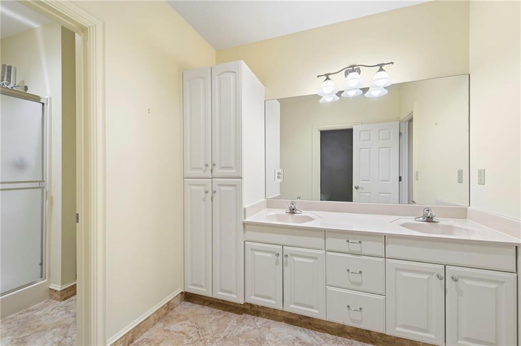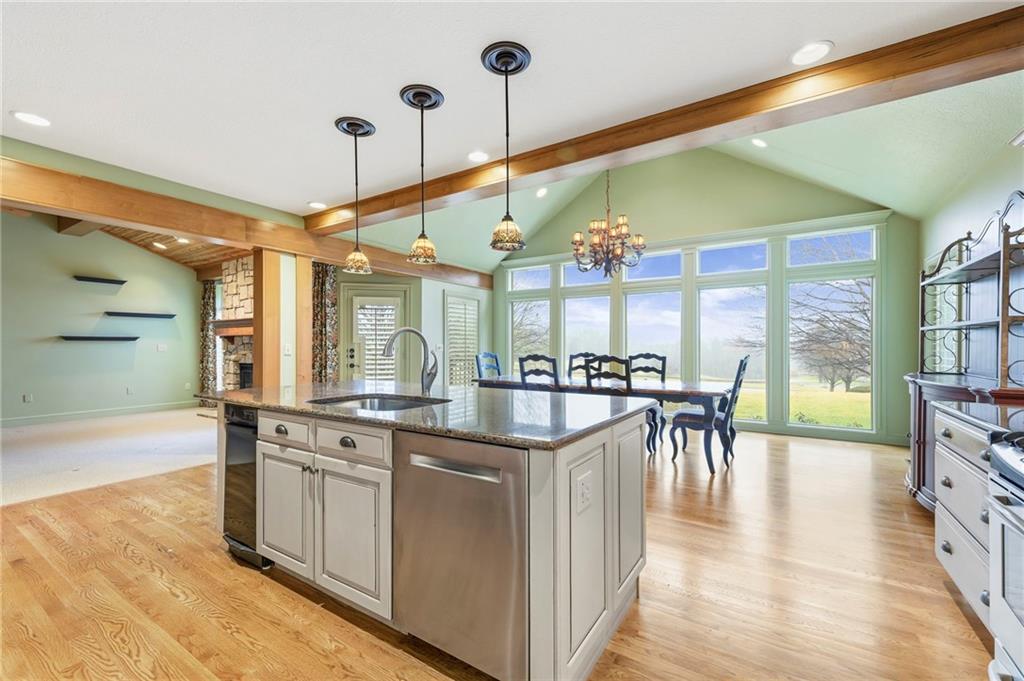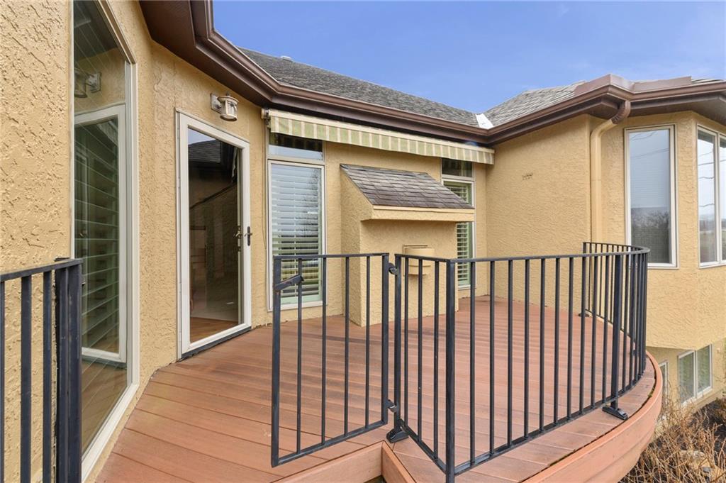 Stunning Custom Reverse 1.5-Story in Highland Crest with Falcon Valley Golf Course Views This beautifully custom designed and built reverse 1.5-story home in sought-after Highland Crest offers privacy, exceptional craftsmanship, and scenic views of Falcon Valley Golf Course. The professionally landscaped lot features mature trees, manicured shrubs, raised garden beds, and a tranquil waterfall water feature. With no neighbors behind, the property backs to open space, creating a peaceful and private outdoor setting. The striking all-stucco exterior with elegant stone accents provides outstanding curb appeal. Inside, the thoughtfully designed floor plan showcases rich hardwood floors, exposed wood beams, and tongue-and-groove wood ceilings that add warmth and character throughout the main living spaces. The chef’s kitchen features beautiful stained cabinetry, granite countertops, stainless steel appliances, a spacious dining area, and a large walk-in pantry—perfect for both everyday living and entertaining. A private office provides a quiet work-from-home space. The main-level primary suite offers a relaxing retreat with a large walk-in shower with seamless glass and an expansive walk-in closet with custom built-ins. A convenient main-floor laundry room completes the level. The daylight lower level is ideal for entertaining and recreation, featuring a spacious rec room with luxury vinyl flooring, a dedicated area for a pool table, two additional bedrooms, and a full bathroom. There is also abundant storage space, along with updated HVAC and a whole-home water filtration system. Step outside to enjoy the newer composite deck and additional patio overlooking the large, treed backyard that backs to open space. Located within easy walking distance to the neighborhood pool and just minutes from Lenexa City Center, shopping, dining, and highways. Situated in the highly regarded Olathe School District.