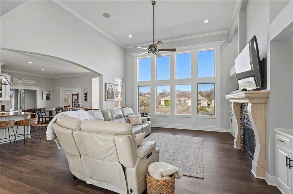 Unique opportunity to own an expertly crafted luxury home located in a quiet neighborhood. Soaring ceilings, high end finishes, 1,380 sq ft of unfinished storage with natural light and windows everywhere. Major expense updating trim & cabinet paint, double HVACs, flooring, lighting, etc. Kitchen has double wall ovens, gas cooktop, a large kitchen island next to a screened in deck overlooking all of the land going down to the lake that the neighbor owns. Formal dining room offers a refined space for entertaining or hosting special holiday gatherings. Guest room on the front and office/3rd bedroom on the back. The full walkout basement has even more living space with 2additional bedrooms and a large second living area. A wet bar complete with a pantry, refrigerator, dishwasher, and microwave perfect for hosting guests or watching movies. Enjoy colorful Kansas sunsets in your back yard with no HOA to answer to.