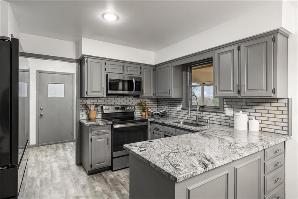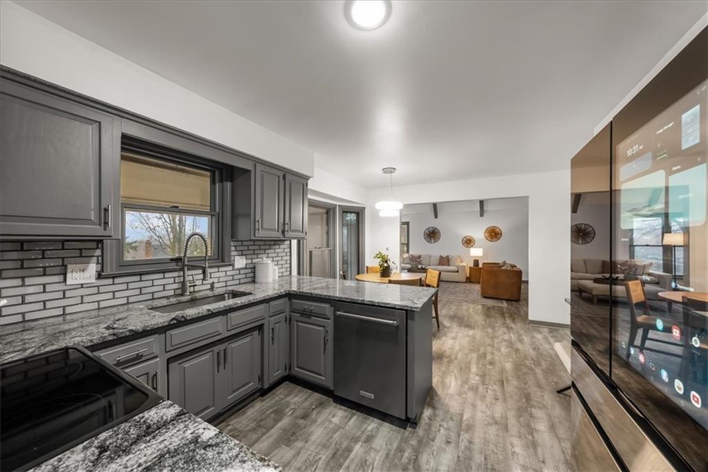 Stunning 1.5-story home in the highly desirable College Hill subdivision, thoughtfully updated with modern finishes throughout. Recent improvements include new LVP flooring on the main level, updated light fixtures, new carpet on the second level, and numerous additional upgrades. This spacious 5-bedroom, 4.5-bath home offers 3,760 square feet above grade, plus a newly finished walk-out lower level featuring generous living space, a bedroom with en-suite bath, and direct access to the large backyard. The Living Room showcases vaulted ceilings, a wood stove fireplace, and access to an expansive main-level deck—perfect for entertaining or relaxing outdoors. The large eat-in kitchen features a charming bay window overlooking the deck, new stainless steel appliances, freshly painted cabinets, and flows seamlessly into the main-level laundry room and powder bath. A spacious formal Dining Room sits across from an equally generous office, ideal for working from home. The main-level primary suite is conveniently located off the Living Room and is currently designed for handicap accessibility. Upstairs, you’ll find an en-suite bedroom, two additional secondary bedrooms with a shared hall bath, and a versatile bonus room. The newly finished lower level provides exceptional flexibility, offering ample space for a family recreation area or comfortable long-term accommodations for guests. Ideally located with easy access to major highways and within the award-winning Blue Valley School District.