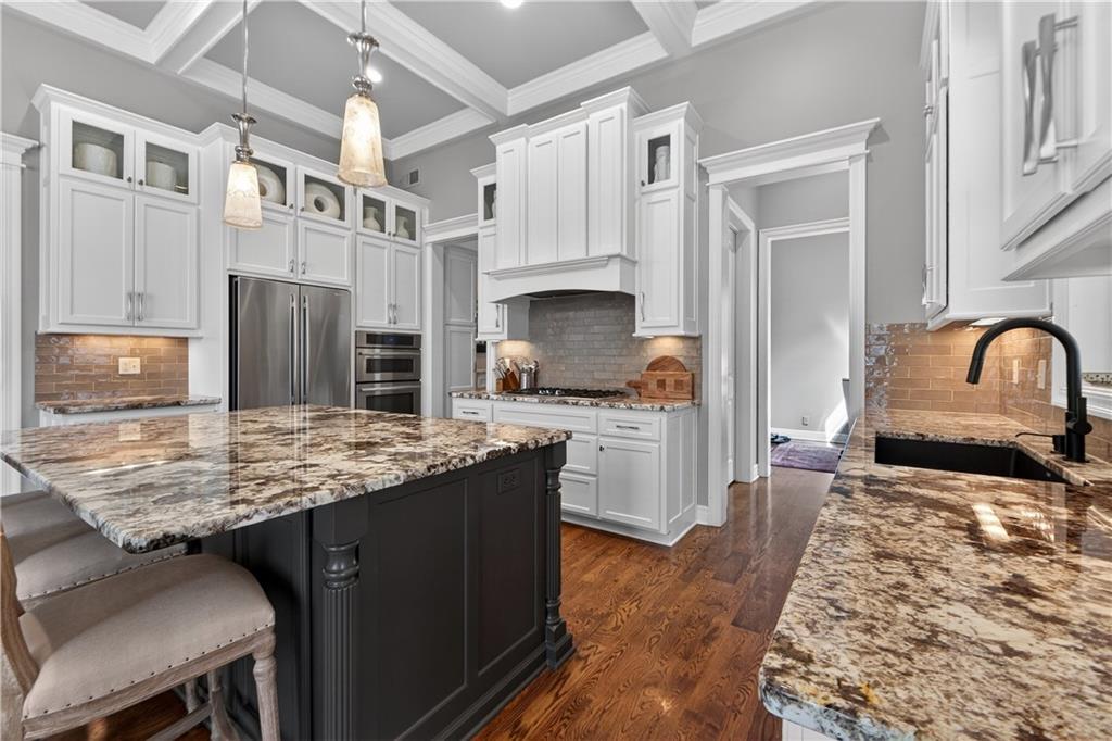 This one owner custom built home sits on an oversized private treed lot and boasts upgraded mill work and moldings, fresh new paint throughout and true hardwood floors on the entire first floor and stairs. The chef's dream kitchen has upgraded granite countertops, huge center island, double ovens, newly painted cabinets and opens up to family room with vaulted ceilings, beautiful mill work and stunning fireplace. Walk out to the covered lanai perfect for entertaining, lounging and grilling! Three car side entry garage with flat driveway is perfect for outdoor activities. The finished lower level has a fifth bedroom, fourth full bath, with rec and family room areas. Must see this home with charming front porch, 2 main floor offices and all upgraded finishes!