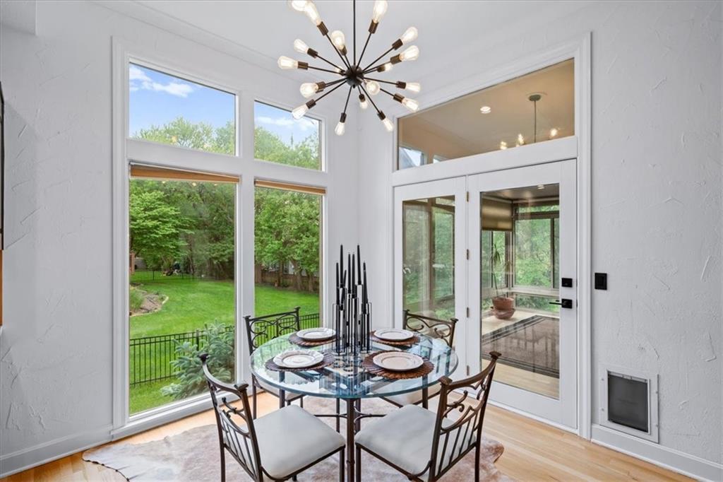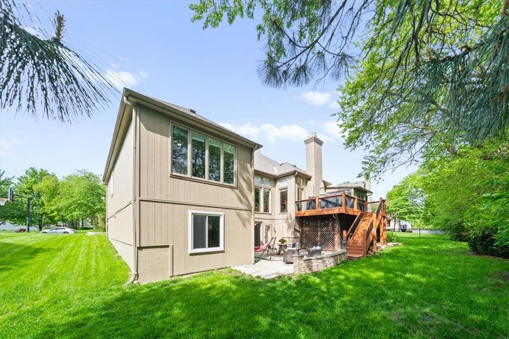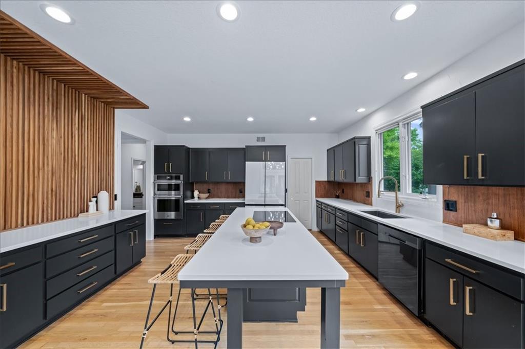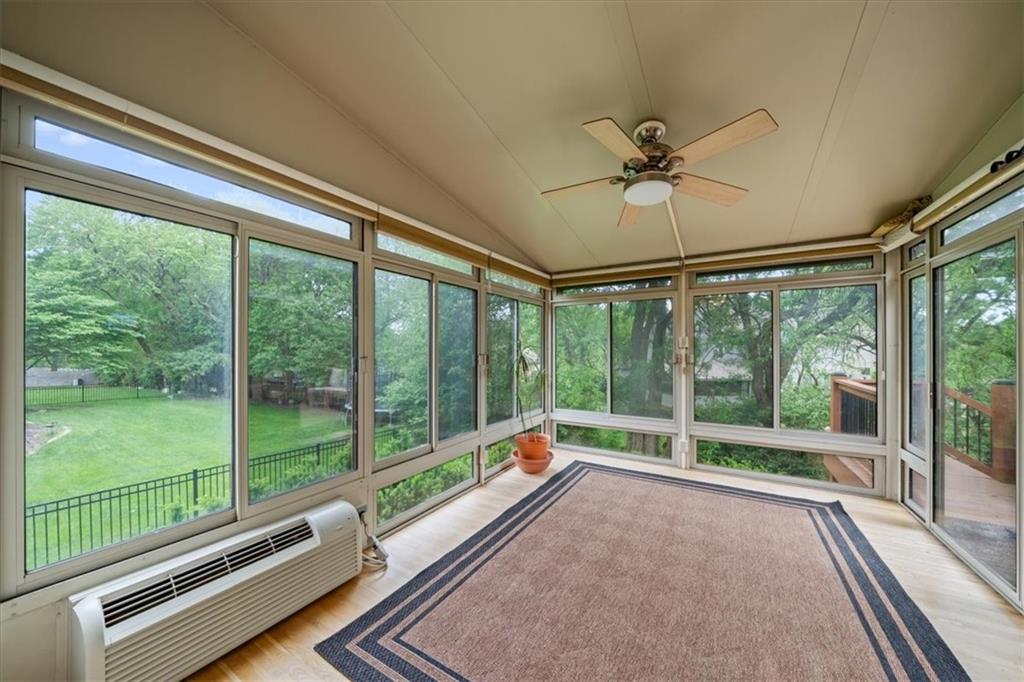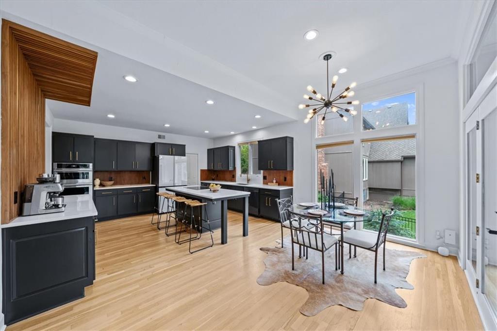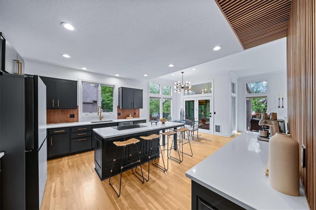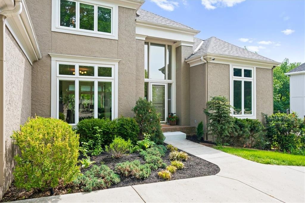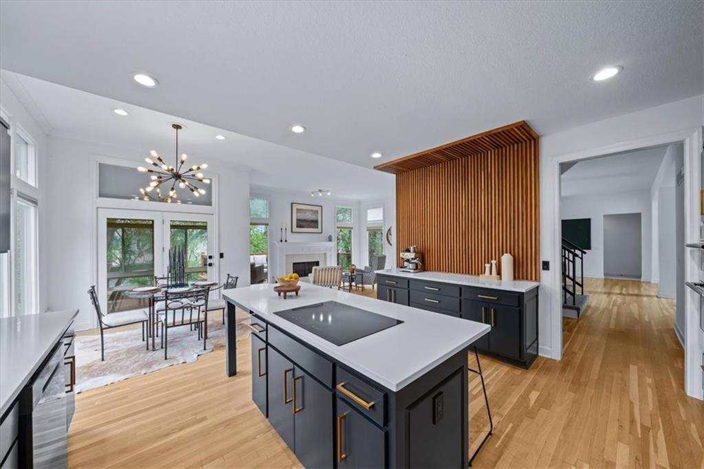 Five room (+2 & office), 4.2 bath Overland Park luxury living in Blue Valley schools! Entering the front door places you in an expansive and welcoming double-height foyer with gleaming hardwoods throughout. Light from full length windows on each wall highlight the logical and open flow of the ground floor, balanced between formal and informal spaces. To the L is the formal DR, and to the R is private office space with high ceilings. Next to the office is the Lg primary bedroom with its own bath, skylight, and XL closet. Through the entry is the living room anchored by a gas fireplace, then a sitting room w/a 2nd gas fireplace and XL windows, a breakfast area, and access to the three seasons patio with its own fan, heat, and A/C. The patio further opens to the outside deck for grilling and to enjoy relaxing evenings. The newer modern Kit includes brass hardware adorning black cabinets, an island with flat-top induction stove, tons of prep space and storage options, barstool area, quartz countertops, and optional coffee center. The Kit connects to a pantry and laundry rm, storage closet, and 1/2bth in the hallway leading to the XL 3-car garage. Upstairs are 3 bedrooms. Room 2 has built-in storage, a window bench under Lg windows, and adjoining shared bth with room 3. Room 4 has its own full bth and Lg walk-in closet. The basement serves as its own self-sufficient living quarters, with 3 additional nonconforming rooms, one full bth and one 1/2bth, a full Kit, LR, and walkout to back patio. The DR is next to the Kit, which has black granite countertops and oak cabinets flanking a sink, dishwasher & oven, while more storage is tucked behind the wall. Room 5 has an XL storage area, built-in shelves, an extra W/D connection, and dual upgraded HVAC for the home. The important things have gotten the right attention: new roof, new kit, and upscaled HVACs. Easy highway access makes it mere minutes from restaurants, shopping, and bustling attractions around the metro area.