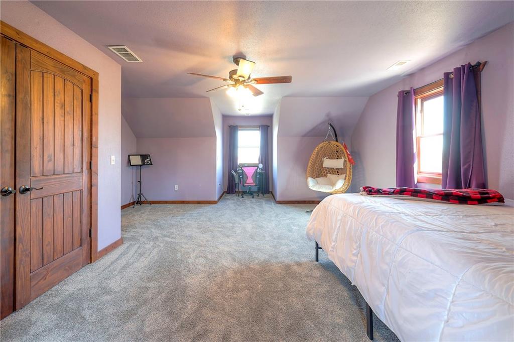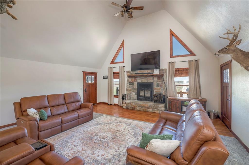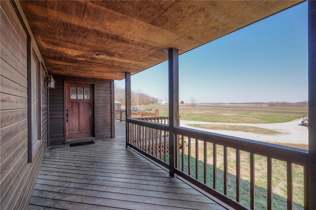 There’s something about this place that slows things down in the best way! Mornings begin with the sun rising across nearly 18 acres of open ground, lighting up the landscape and the wraparound porch where the day starts with a coffee and a quiet view. Just outside Blairstown, this 4-bedroom, 3.5-bath home sits off blacktop Highway O and is served by rural water, offering both peaceful surroundings and practical convenience. Much of the land is open and tillable, granting wide views and a sense of space that’s becoming harder to find. Inside, the living room opens up with vaulted ceilings that give the space an airy, welcoming feel. A stone fireplace anchors the room and creates a natural gathering spot, especially on cooler evenings. Large windows on either side bring in natural light and frame views of the property, while the upper-level balcony looks down into the living area and connects the space between floors. The layout was built for everyday comfort as much as for hosting friends and family. The primary suite includes a large walk-in closet, double vanity bathroom, and its own in-suite laundry. Downstairs, the finished walkout basement opens up even more possibilities—movie nights, game tables, a workout space, or simply another place to gather. The wraparound porch runs along the entirety of the home and creates a front-row seat to the property. In the mornings, the sun comes up across the land and lights the whole place in warm color. It’s the kind of sunrise that makes coffee last a little longer. Beyond the home, a 24×40 detached shop adds valuable workspace and storage—ideal for equipment, hobbies, vehicles, or projects that need room to spread out. With nearly 18 acres, the land gives you room to decide what comes next—whether that’s gardening, hobby farming, outdoor projects, or simply enjoying the quiet and privacy of country living. It’s a property that feels open, comfortable, and ready for whatever pace of life you want to bring to it.