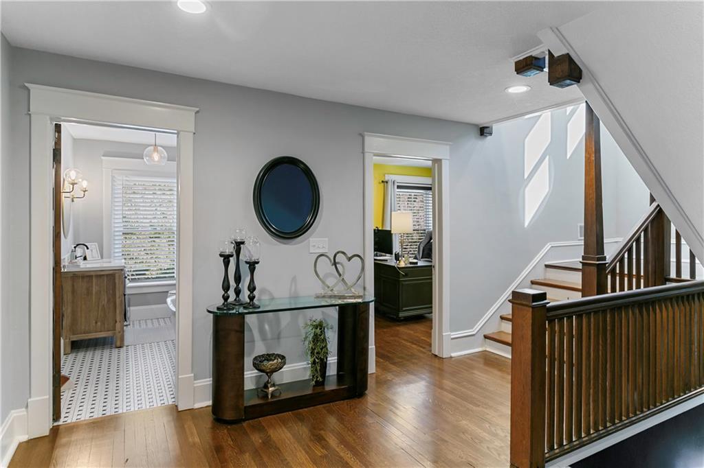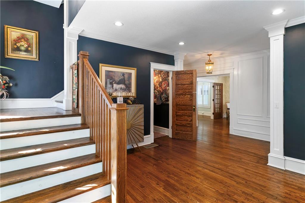 Timeless Luxury in the Scarritt Point Historic District just outside of Downtown. Experience refined living in this magnificent 1910 American Foursquare residence, gracefully situated on a picturesque street, just steps from acclaimed restaurants and vibrant entertainment. Discover sun-drenched interiors adorned with rich hardwoods, custom millwork, and premium fixtures. The grand formal entry sets an impressive tone, seamlessly connecting spacious living areas designed for both comfort and entertaining. Host unforgettable gatherings in the elegant dining parlor, featuring French doors, exquisite lighting, and a dramatic bay of oversized windows. The gourmet kitchen is a chef’s dream—thoughtfully designed with abundant cabinetry, a generous island with breakfast bar, granite countertops, and a secondary dining for casual meals. Retreat to the stately library, accented in deep hues, with a private side entrance. For ultimate convenience and privacy, the main level features a spacious guest suite—perfect for visitors or multi-generational living. A chic powder room is discreetly positioned for guests. Upstairs, the private quarters include a formal corridor, three secondary bedrooms, and a lavish primary suite with a spa-inspired bath and expansive walk-in closet with laundry hookups. Third level offers a contemporary recreation space with panoramic views and a full bath—ideal for relaxation or entertaining. Meticulously maintained, this 4,900-square-foot home features newer mechanicals, including zoned HVAC for year-round comfort. Outdoor living is equally impressive, with a fully fenced backyard, a spacious front porch perfect for morning coffee, and detached two-car garage. Located just a block away from the renowned Kansas City Museum and close to downtown amenities, this residence captures the timeless charm of this convenient and exclusive neighborhood.