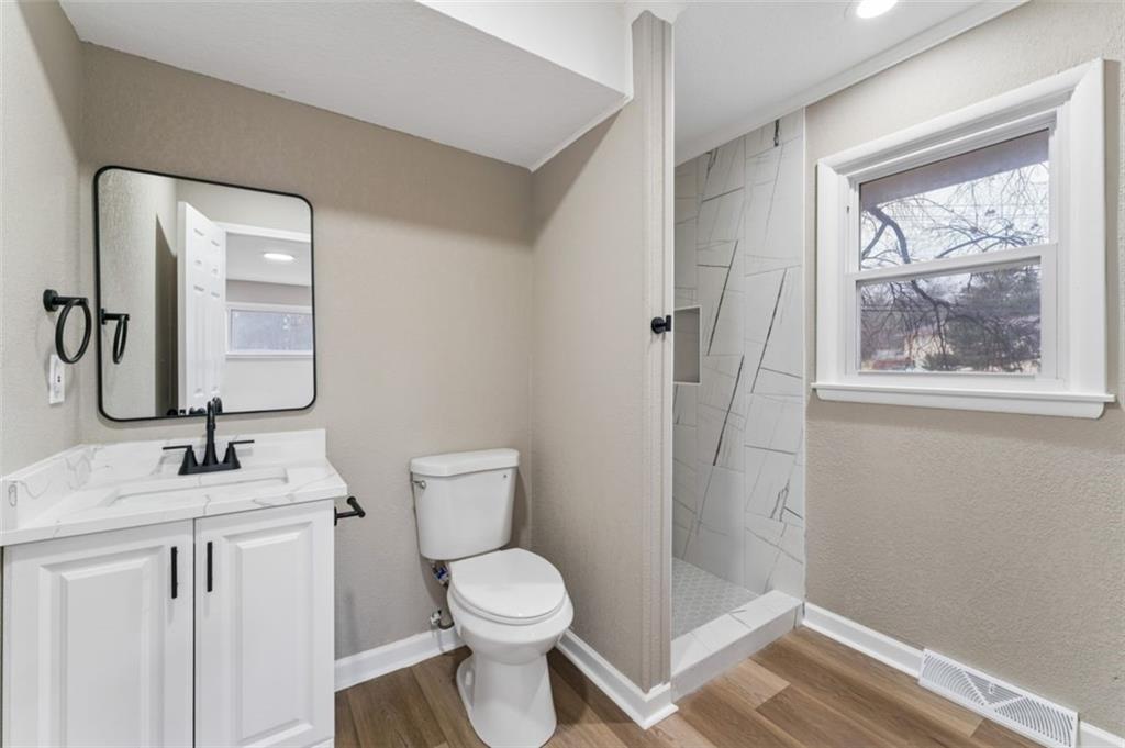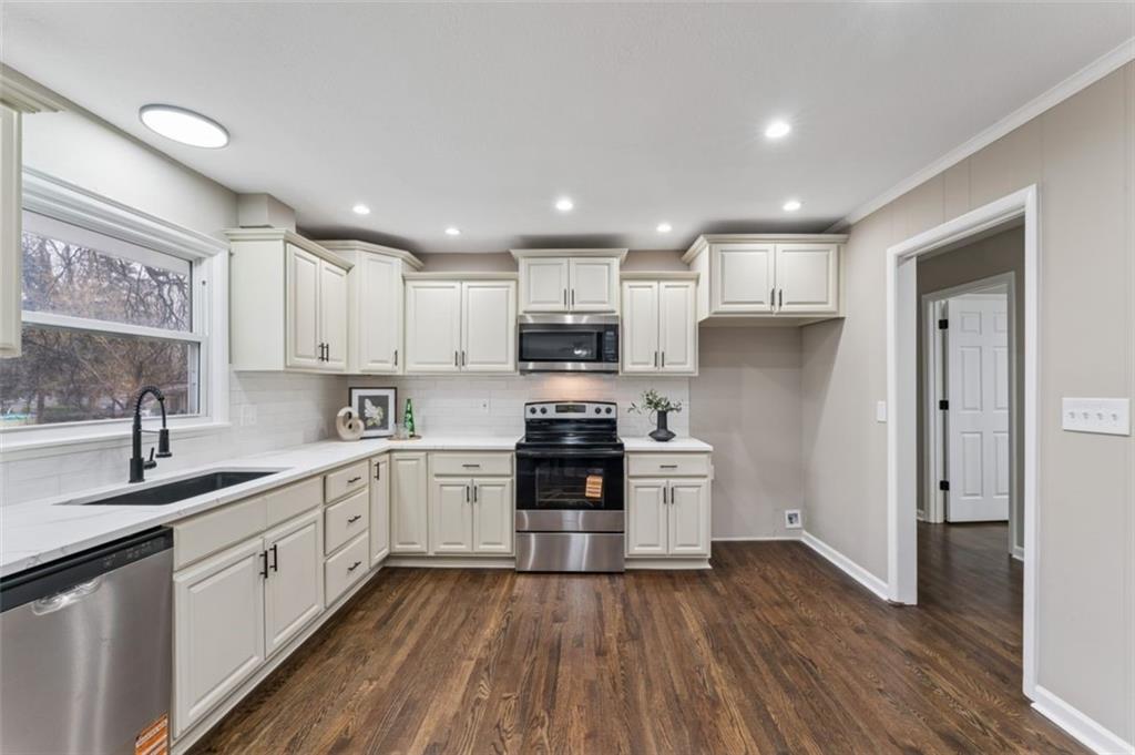 Beautifully remodeled 5 bedroom, 2.5 bath home offering over 3,500 finished square feet of living space. The main level features refinished hardwood floors, a spacious living area with a striking brick fireplace, and an open layout that flows into the fully updated kitchen with quartz countertops, custom cabinetry, stainless steel appliances, and subway tile backsplash. Sliding doors lead to a deck overlooking the backyard, perfect for relaxing or entertaining. The finished lower level provides over 1,400 additional square feet of flexible living space ideal for a family room, office, or guest area. Move-in ready with modern updates throughout and conveniently located near shopping, dining, and major highways.