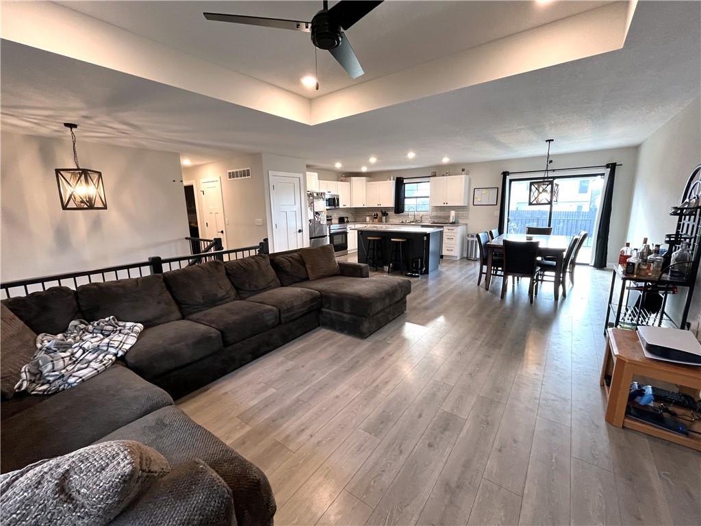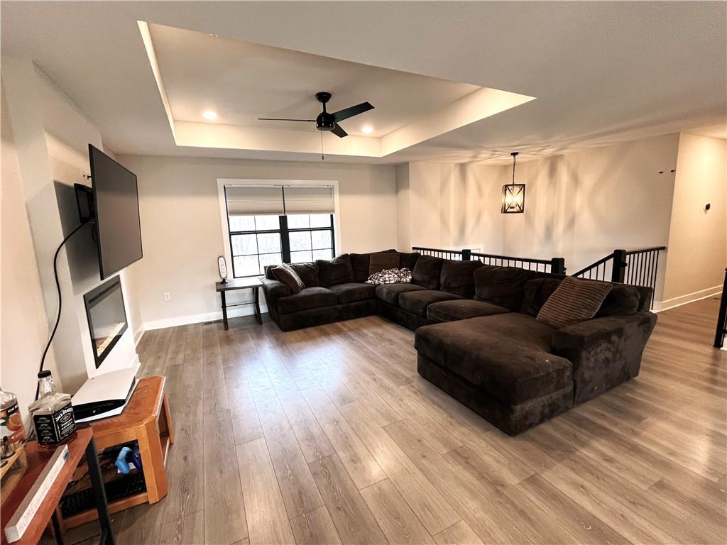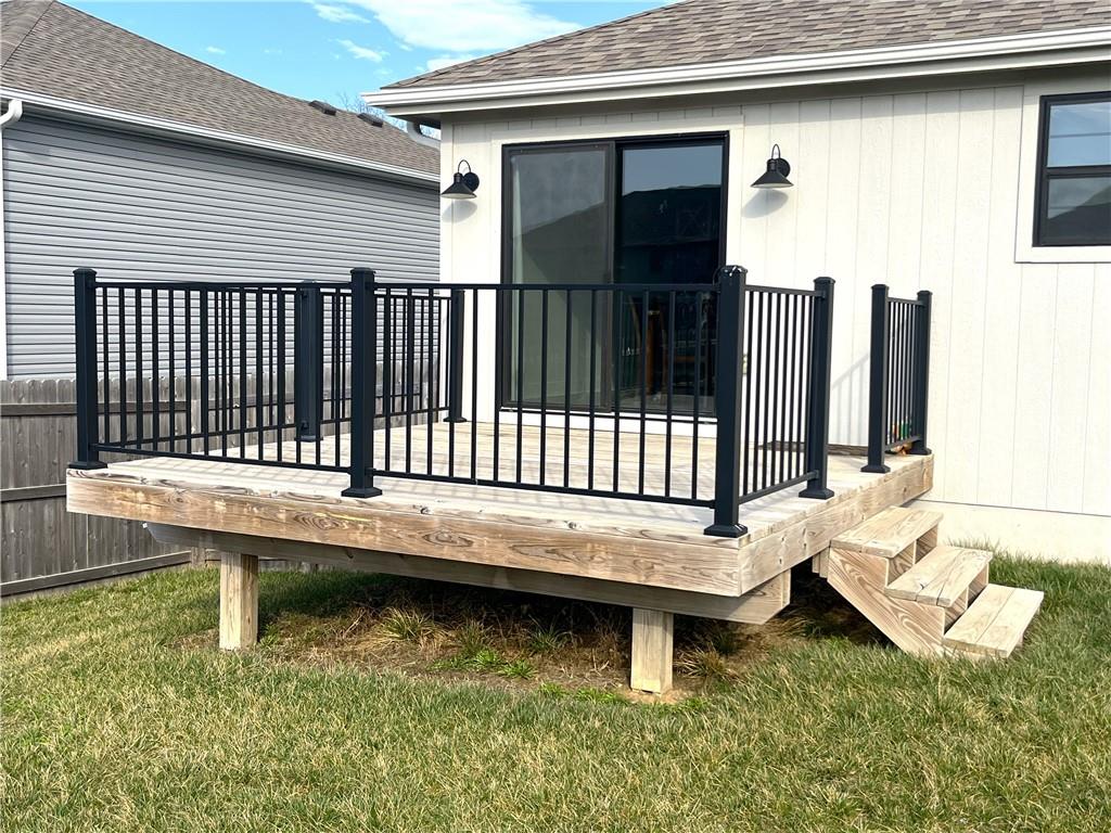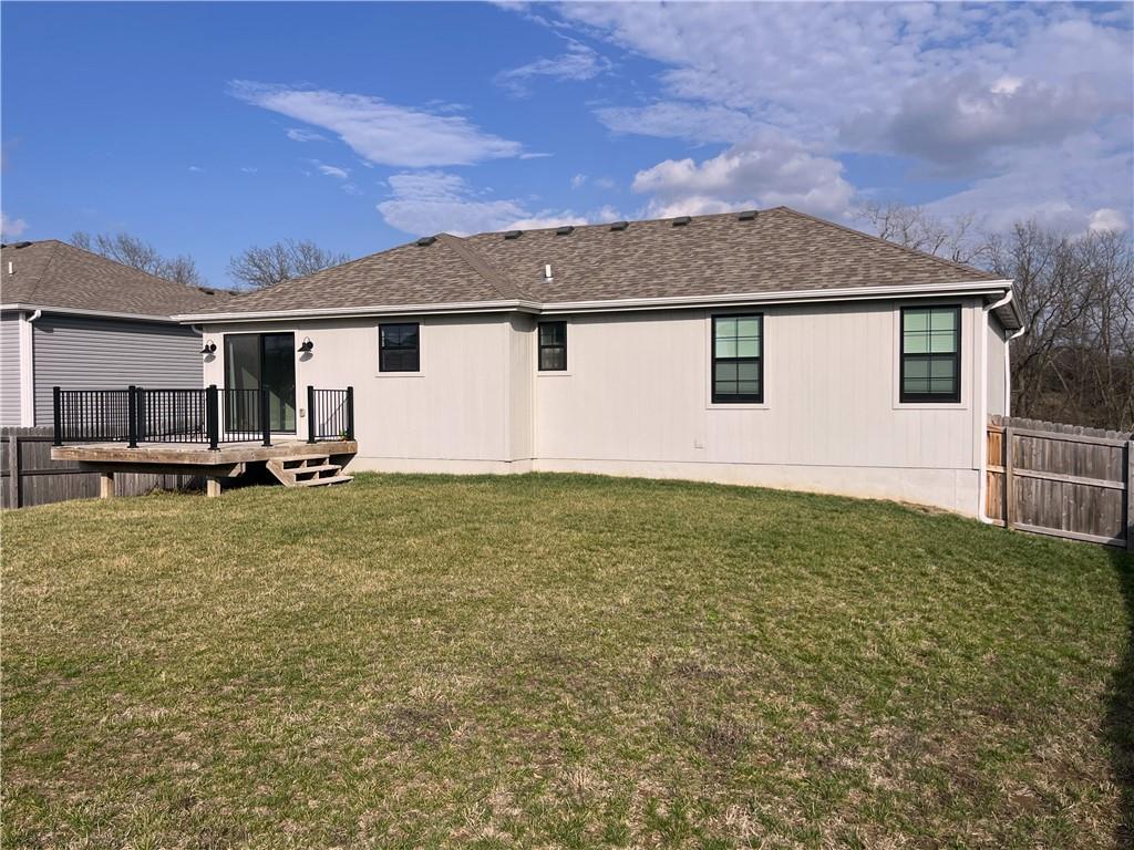 PRECISELY LOCATED BETWEEN WAFB & THE ‘BURG Well-appointed home featuring a privacy-fenced oversized backyard and a spacious deck perfect for relaxing or entertaining. Open kitchen and living room with tray ceilings, an electric fireplace, and a large island with bar seating. The kitchen also offers a walk-in pantry and includes all stainless steel appliances. The primary bedroom suite provides plenty of storage with two closets, including a walk-in closet, along with a double-sink vanity and a huge walk-in shower with glass doors. A main-level utility room adds everyday convenience. Additional features include an oversized garage and a finished lower level offering a bedroom, family room, and full bathroom. Conveniently located just off the state highway halfway between Whiteman Air Force Base and Warrensburg, this home also sits just a quick hop onto the Freedom Trail for easy access to outdoor recreation.