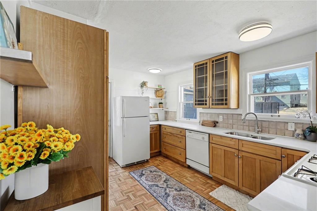 7234 Baltimore St • 1.5-Story Tudor/Traditional • Solar panels • 3BR/2BA • 1,659 SF • Classic 1937 charm meets clean updates in this brick-and-trim Tudor with a covered front porch and dormer details. Inside, the living room features hardwood floors, a large picture window for natural light, and a masonry fireplace. The kitchen offers ample cabinetry, white counters, tile backsplash, dishwasher, and a gas range, with room for a breakfast nook. Two refreshed bathrooms showcase modern fixtures and standout tilework. Main-floor bedroom plus additional bedrooms upstairs; huge walk in closet! Full stone/rock basement provides storage and utility space. Brand New HVAC. Outdoor living includes a patio/deck, and parking is served by a shared driveway with carport-style covered parking. Solar panels are already installed to help offset electric costs. Convenient access to Ward Parkway and W Gregory Blvd.