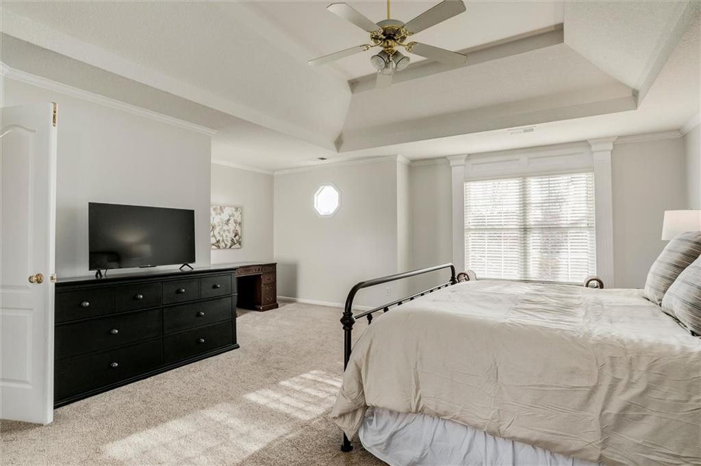 Welcome to this charming home in Nottingham By the Green! It is nestled on a lovely cul-de-sac, with many trees, and a large lot! You will love the floorplan when you step inside! It has so much space for everyone! First floor dining room plus an office/flex room! The great room is spacious and has a wall of windows letting in so much natural light! The see-through fireplace is an awesome feature. Step around the corner to the cozy hearthroom, with a fabulous stone fireplace, generously sized eating space, and a large kitchen! The cabinet doors have been replaced! The hardwood floors have been recently refinished! You will love their updated natural color! Upstairs is a huge primary bedroom, a large primary bath, that has been updated, the vanity was raised and has had new vanity tops and brass fixtures installed! There is also a jetted tub, shower and a nice walk in closet! There is a secondary bedroom with a private en suite and walk in closet. The other 2 bedrooms each boast walk in closets, and connect to a Jack & Jill bath! Upstairs laundry is a BONUS feature you will love! The basement is finished into a secondary living space, large enough to host movies or sports games on TV, and still will still leaving you room for workout equipment and plenty of storage along with a handy half bath! The backyard is really pretty at night with the cool lights hanging over the large deck! Great schools, close to shopping and restaurants! You don't want to miss this house!