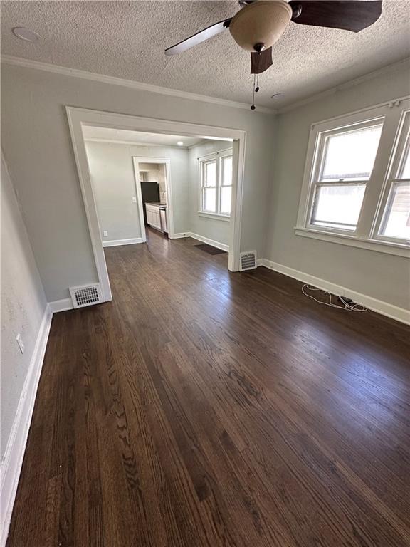 Empty room featuring a ceiling fan, dark wood-style floors, a textured ceiling, and ornamental molding
