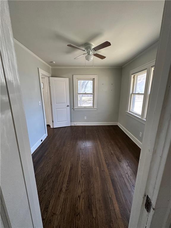 Unfurnished bedroom with crown molding, dark wood finished floors, and a ceiling fan
