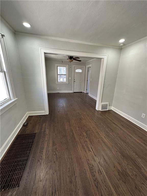 Empty room with dark wood-type flooring, ceiling fan, and crown molding