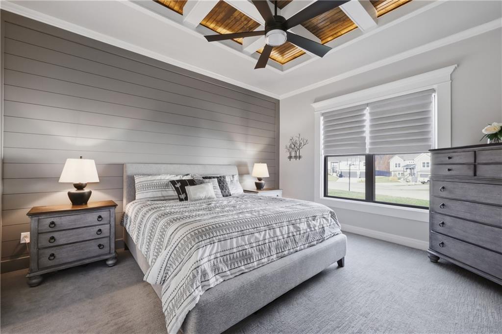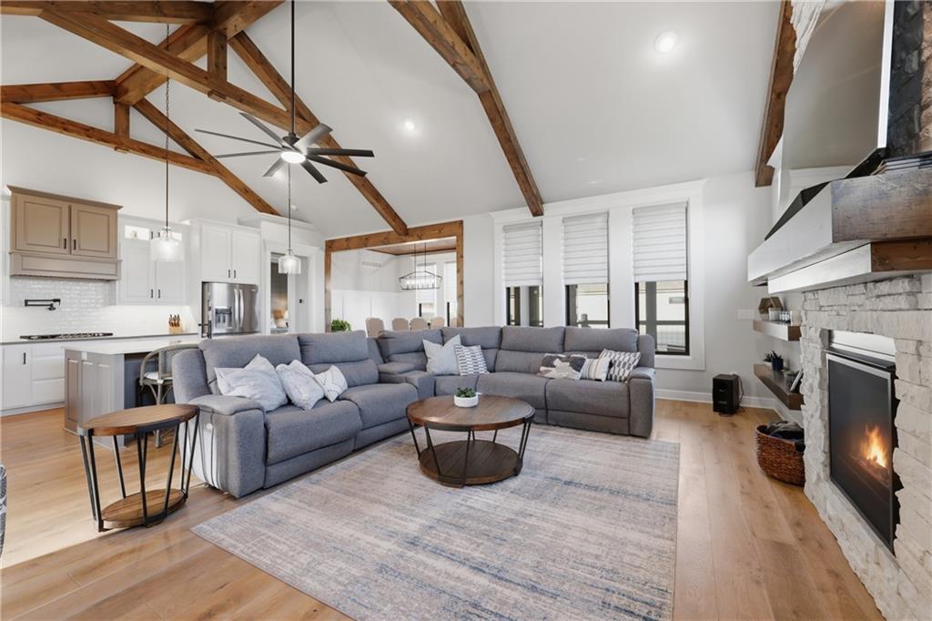 Beautiful custom-built, one-owner reverse 1.5 story offering quality craftsmanship and thoughtful upgrades throughout. This stunning home features soaring ceilings with exposed beams, creating a warm and inviting open floor plan. The spacious kitchen is equipped with high-end KitchenAid appliances, ample cabinetry, and flows seamlessly to an enclosed deck just off the kitchen—perfect for relaxing or entertaining. Enjoy the comfort of heated floors, custom blinds, tankless hot water, and dual-zoned HVAC for year-round efficiency. The main level offers generous living space while the finished walkout basement expands the home with additional living areas, bar, and plenty of room for guests or entertaining. This home includes 3 bedrooms and 4 bathrooms, providing space and privacy for everyone. You will appreciate the oversized 3-car garage featuring durable epoxy floors. Enjoy a lush, well maintained lawn made easy with a full ground sprinkler system. A rare opportunity to own a beautifully maintained custom home with premium upgrades and exceptional attention to detail.