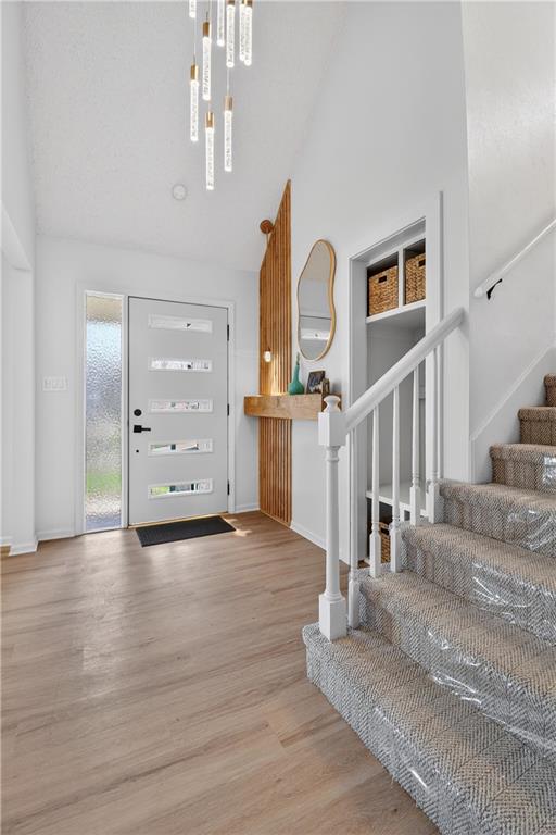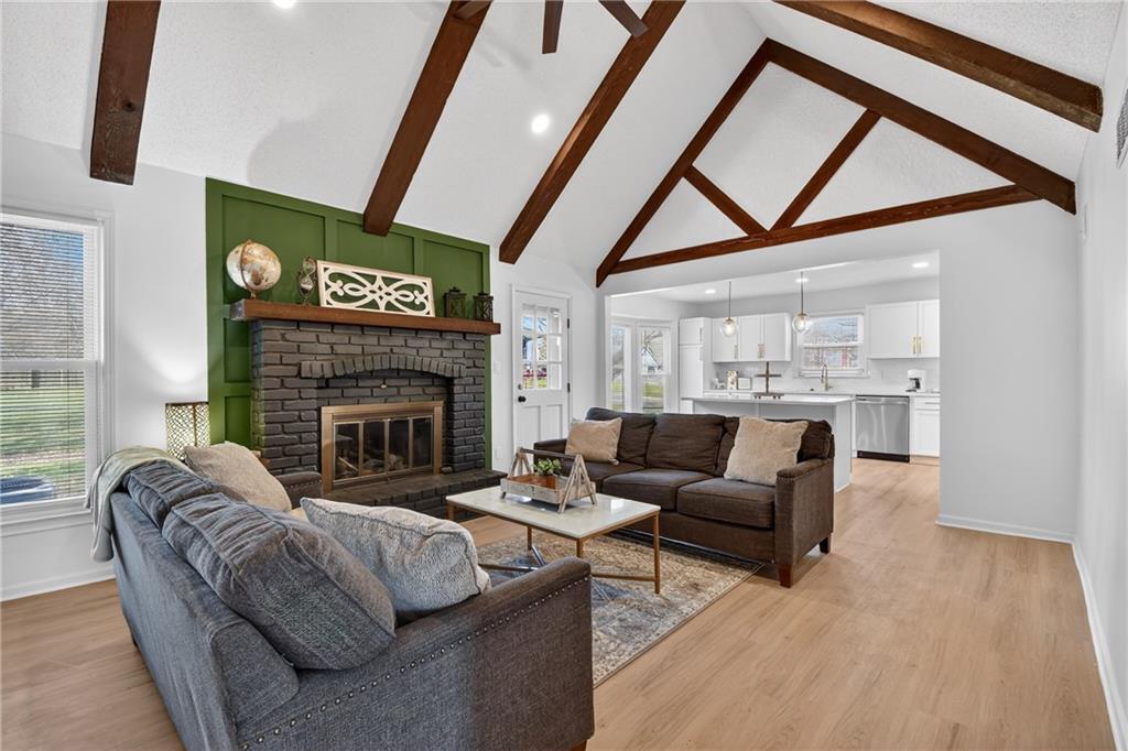 This home has been completely and beautifully remodeled with a design you are going to love, featuring bold accents and modern touches throughout. The kitchen highlights new cabinets, quartz countertops, a subway tile backsplash, and stainless-steel appliances. It is an entertainer's delight with an open concept, large central island, a breakfast eat-in space and formal dining room complete with a bold accent wall and overflow wine storage that shows as artwork. Black and gold fixtures add a stylish modern appeal, and the beautiful light fixtures throughout the home complete the updated look. You will love the foyer entrance with beautiful accent wall, built in storage and bench, and modern chandelier. The main level has a great formal room with gas starter fireplace, a vaulted ceiling, and walk out to a covered patio. Upstairs are three bedrooms and two full baths, including a HUGE primary bedroom. The ground level features a fourth bedroom on the same level as the garage, along with laundry and a half bath. The basement includes a third full bathroom and large finished space with unlimited possibilities. There is three hundred plus sq feet of unfinished storage space as well. A NEW HVAC in May 2023 will have you living in comfort for years to come. Exterior features including vinyl siding, thermal windows, a cute shed, and a large corner lot make this home a must see. Book your tour today!