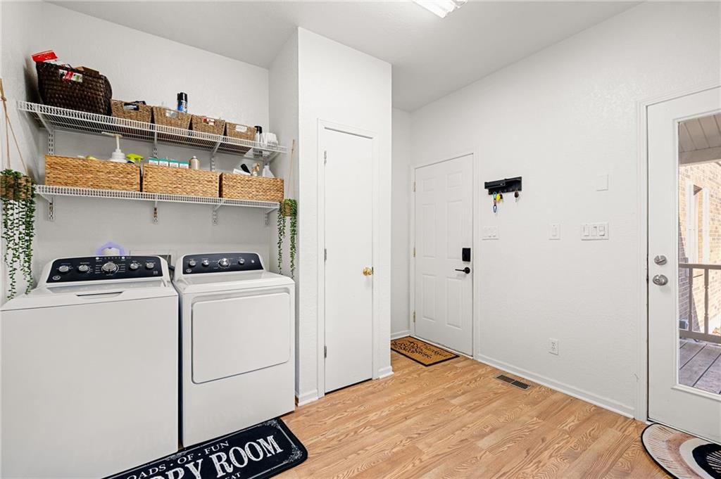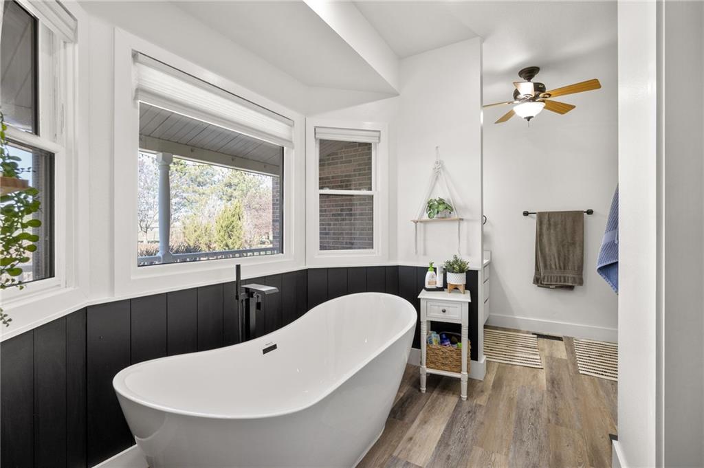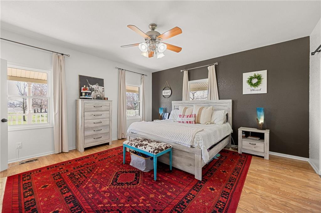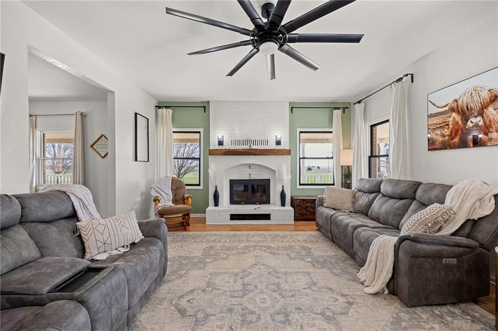 Beautiful traditional farmhouse on 3.75 acres offering 4 bedrooms, 2 bathrooms, and 2,557 square feet of inviting living space. This mostly brick home features wood siding on the second level, a durable metal roof, and a large covered wraparound porch perfect for enjoying the peaceful setting and beautiful yard. Inside, you will find 9-foot ceilings throughout the main level, a striking wood staircase, a spacious living room with a wood-burning fireplace, a large laundry room, and a main-level primary bedroom and bathroom for added convenience. The kitchen is beautifully updated with custom cabinetry and quartz countertops, and the attached 2-car garage plus two separate driveways provide plenty of space for parking and everyday function. Outside, the property includes a fruit orchard with a variety of fruit trees, adding even more charm to this picturesque country property.