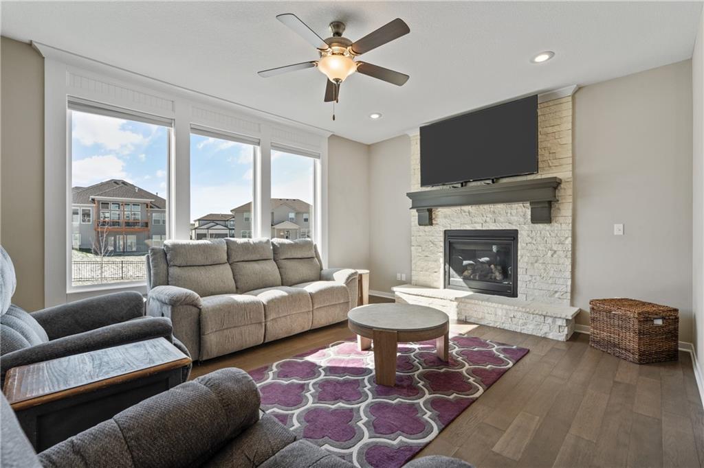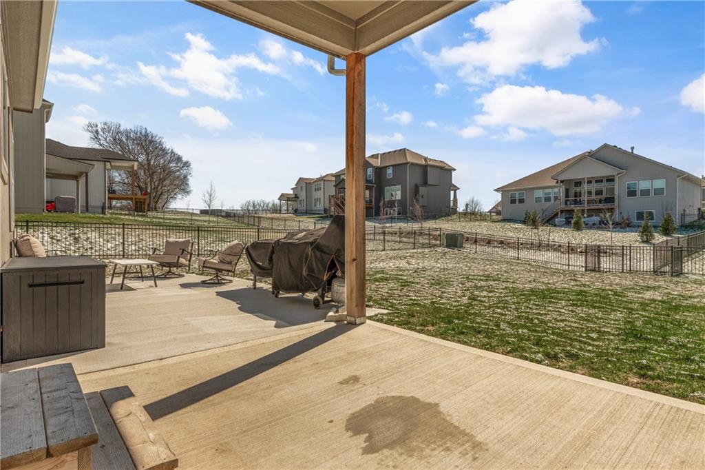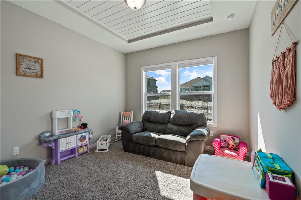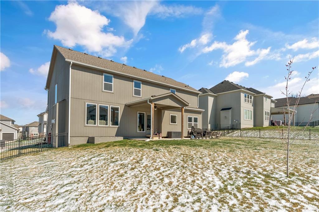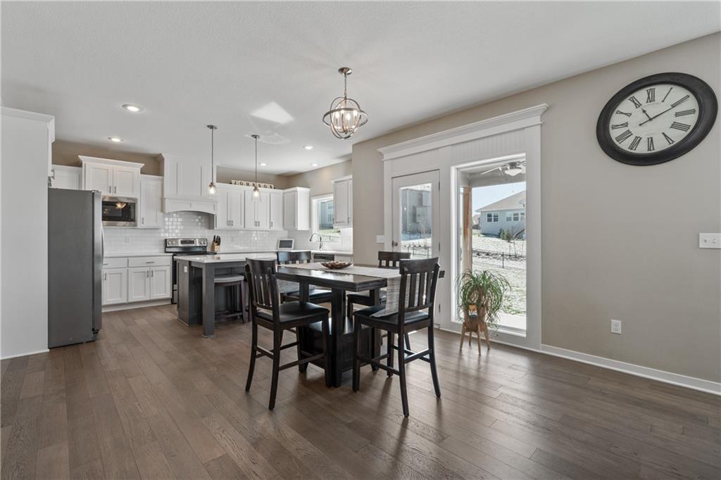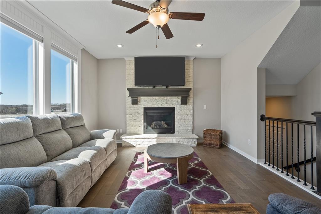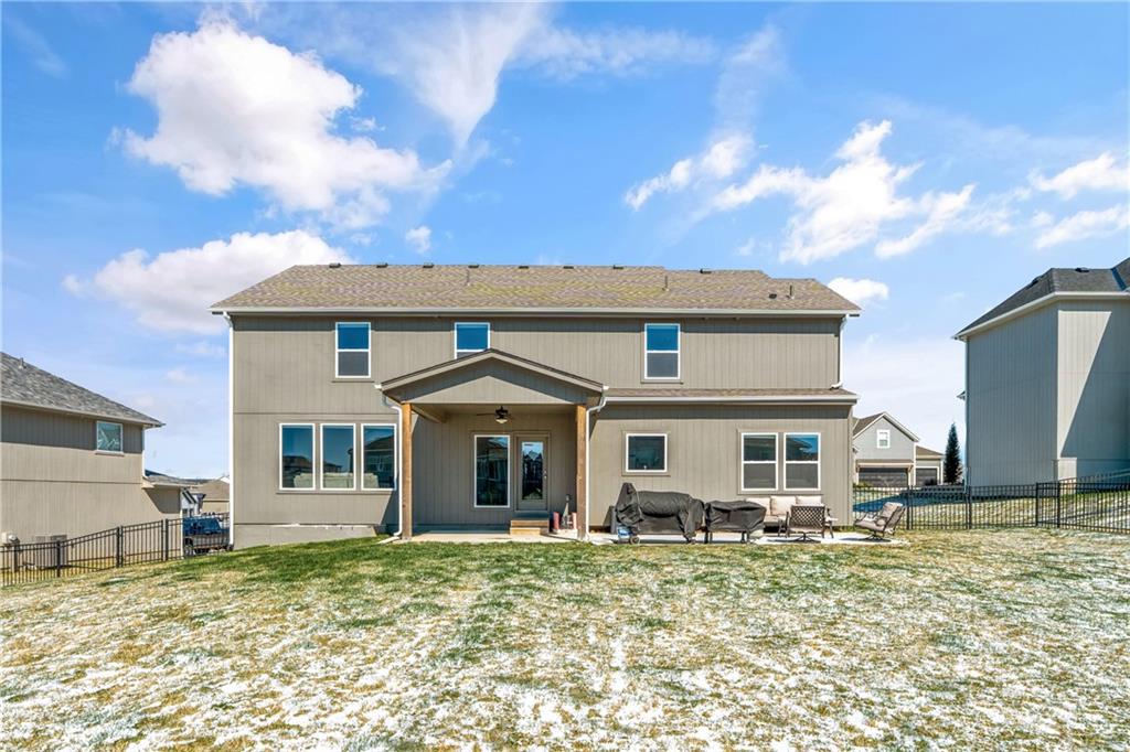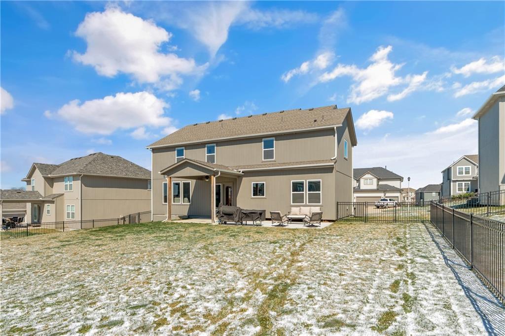 Welcome to this beautifully maintained, nearly new home in the growing community of Canyon Lakes—just 2 years old and ideally located near the golf course. Just off the entry, a bright and inviting office or den provides the perfect space for working from home or a quiet retreat.The heart of the home is the spacious, open-concept living area filled with natural light. The living room showcases a stunning stone fireplace and flows seamlessly into the beautifully designed kitchen, complete with a subway tile backsplash, farmhouse sink, and a large island with additional breakfast seating—perfect for gathering and entertaining.Just off the kitchen, you’ll find a convenient mudroom along with a well-appointed main-floor bedroom and full bath, offering flexibility for guests or additional living needs. Upstairs, the primary suite serves as a true retreat, featuring recessed ceilings and abundant natural light. The ensuite bath includes double vanities, a walk-in shower with dual shower heads, and a separate garden bathtub. The laundry room is conveniently located just off the primary closet for added ease. Generously sized secondary bedrooms complete the upper level, each offering vaulted ceilings and access to bathrooms for added comfort and privacy. Step outside to the beautifully expanded patio—ideal for relaxing evenings or entertaining—overlooking a large, fenced backyard. Enjoy a warm and welcoming neighborhood atmosphere with scenic surroundings, including charming fishing ponds, a nearby elementary school within a short 5-minute walk, a community pool coming soon, all within the award-winning De Soto School District and with convenient access to nearby amenities. Don't let this one go!