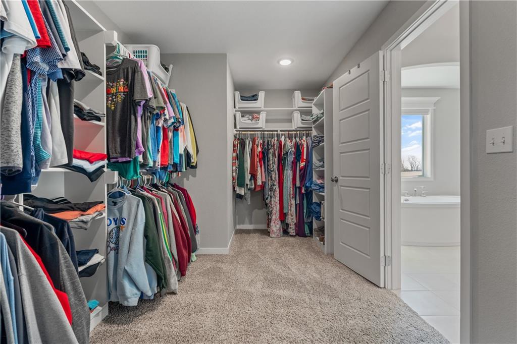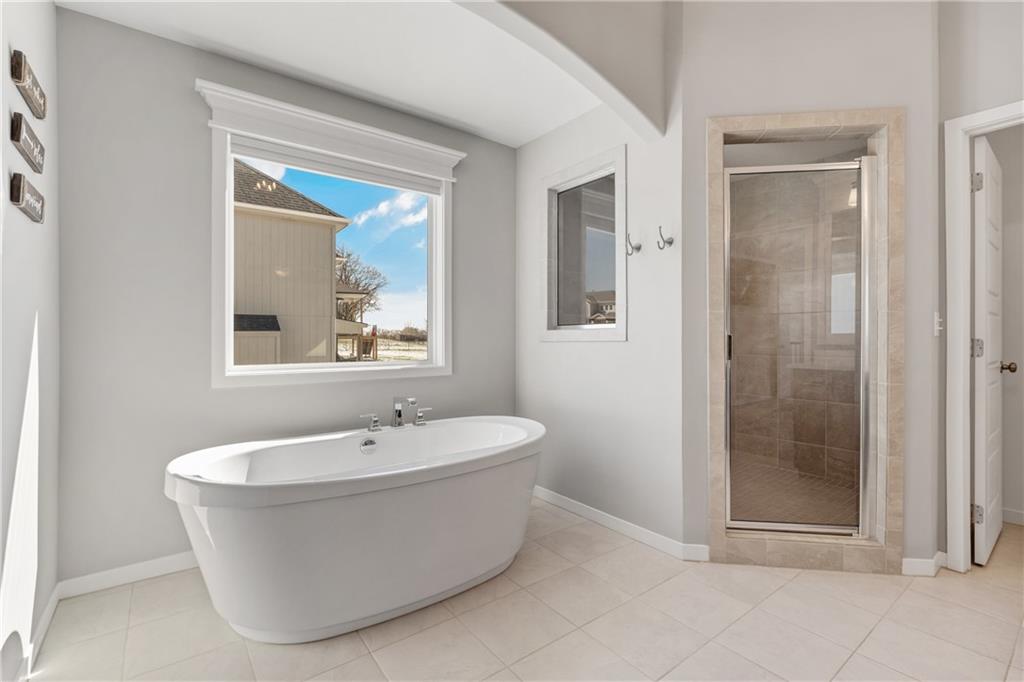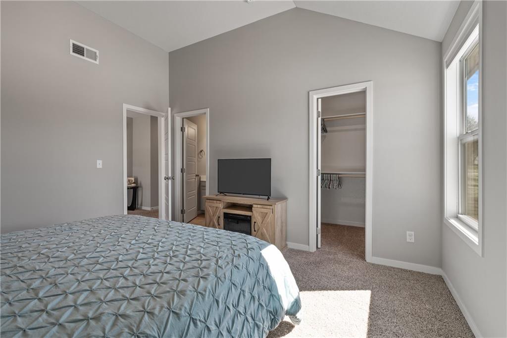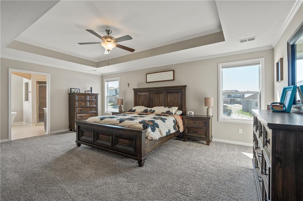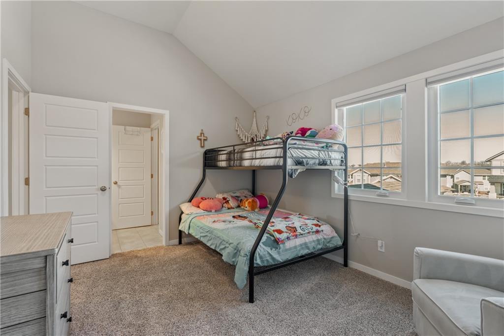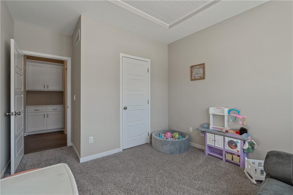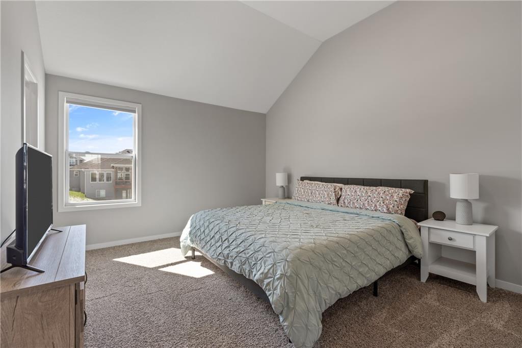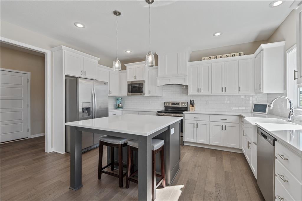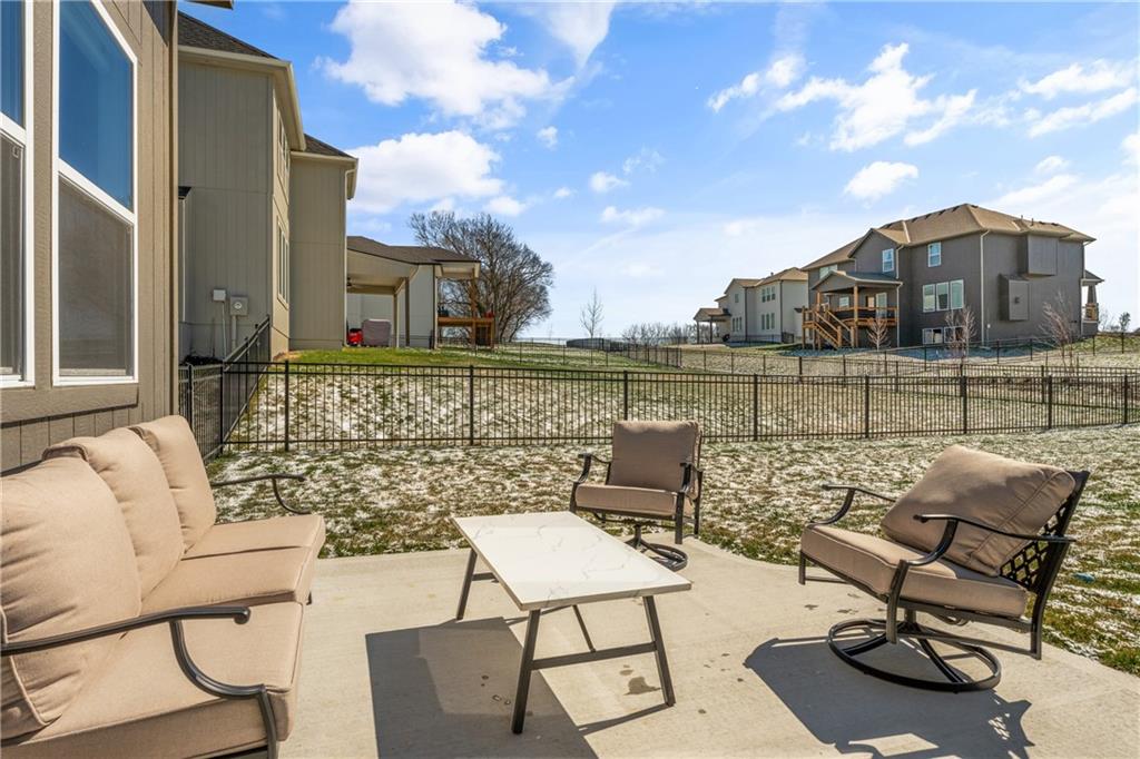 Welcome to this beautifully maintained, nearly new home in the growing community of Canyon Lakes—just 2 years old and ideally located near the golf course. Just off the entry, a bright and inviting office or den provides the perfect space for working from home or a quiet retreat.The heart of the home is the spacious, open-concept living area filled with natural light. The living room showcases a stunning stone fireplace and flows seamlessly into the beautifully designed kitchen, complete with a subway tile backsplash, farmhouse sink, and a large island with additional breakfast seating—perfect for gathering and entertaining.Just off the kitchen, you’ll find a convenient mudroom along with a well-appointed main-floor bedroom and full bath, offering flexibility for guests or additional living needs. Upstairs, the primary suite serves as a true retreat, featuring recessed ceilings and abundant natural light. The ensuite bath includes double vanities, a walk-in shower with dual shower heads, and a separate garden bathtub. The laundry room is conveniently located just off the primary closet for added ease. Generously sized secondary bedrooms complete the upper level, each offering vaulted ceilings and access to bathrooms for added comfort and privacy. Step outside to the beautifully expanded patio—ideal for relaxing evenings or entertaining—overlooking a large, fenced backyard. Enjoy a warm and welcoming neighborhood atmosphere with scenic surroundings, including charming fishing ponds, a nearby elementary school within a short 5-minute walk, a community pool coming soon, all within the award-winning De Soto School District and with convenient access to nearby amenities. Don't let this one go!