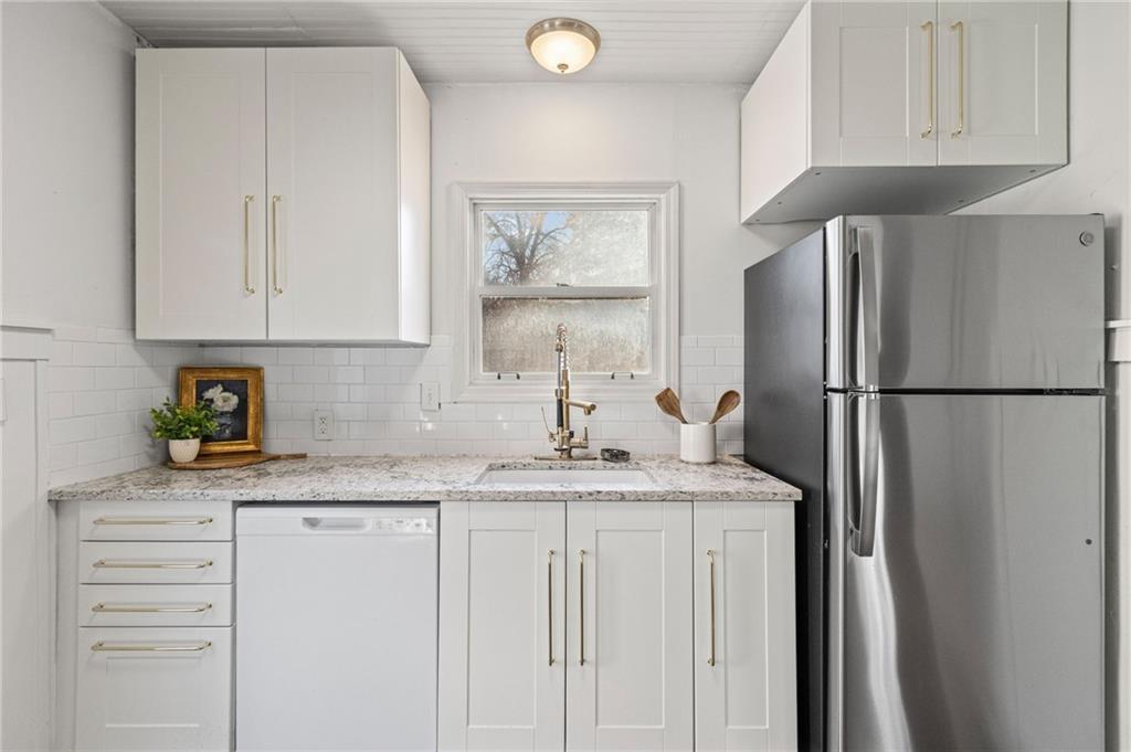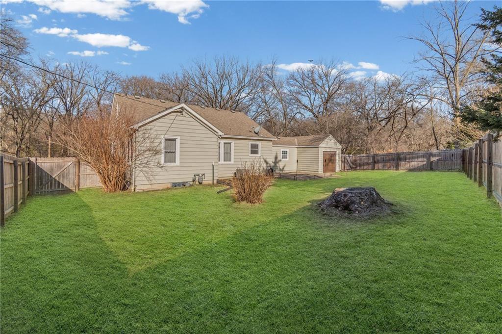 Charming home nestled on an oversized lot! Lovely living room with wood floors, brick fireplace, and room to welcome guests. Dining with arched details and provides plenty of room to entertain. Beautiful, remodeled kitchen with gas stove, white cabinetry, storage hutch, granite countertop, undermount sink, sleek faucet, panel wall, and easy patio access. Two main level bedrooms with wood floors and fans. Main level bath is freshly updated with custom vanity, green tile detail, shelving for additional storage, upgraded rain showerhead, and new tub with surround. Bonus main level space ready to be finished with double doors offering plenty of sunshine. Venture upstairs to the large loft bedroom with deep closet. Walkout basement offers so many possibilities and ample storage. In the backyard you will discover tranquility with the privacy fence and patio large enough for summer BBQs. Workshop with garage door is a nice space for hobbies, projects, or even more storage. Plus, all appliances stay! Deep driveway with plenty of parking. Located across from the street from the picturesque North Troost Trail with paved walkway and bridge, leading to the Englewood Park with a fishing pond, recreational fields, and playground. Conveniently located near highways, shopping, and restaurants. The perfect blend of character, comfort, and updates will win you over!