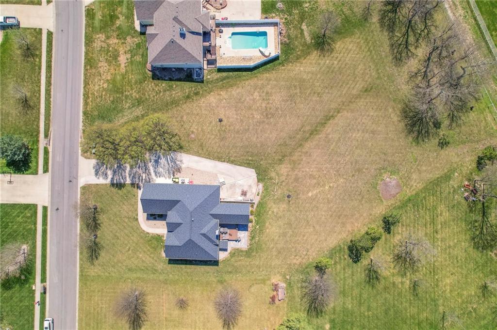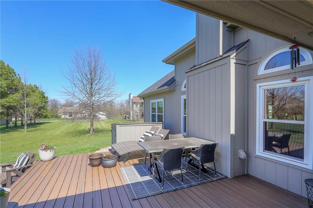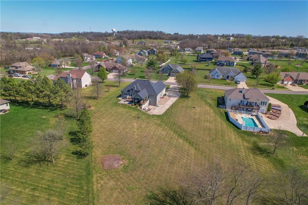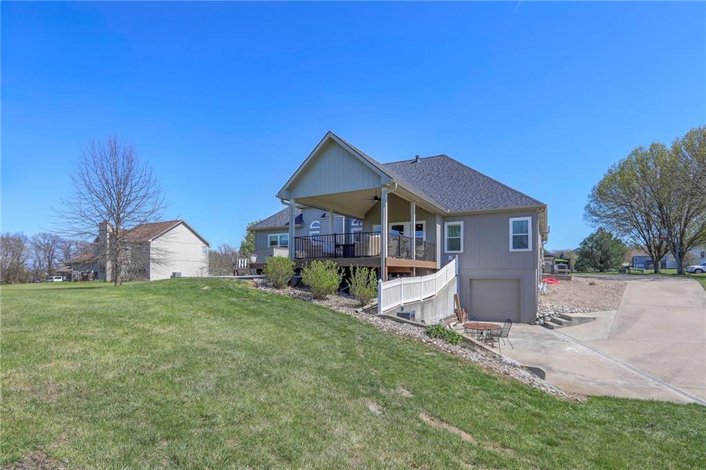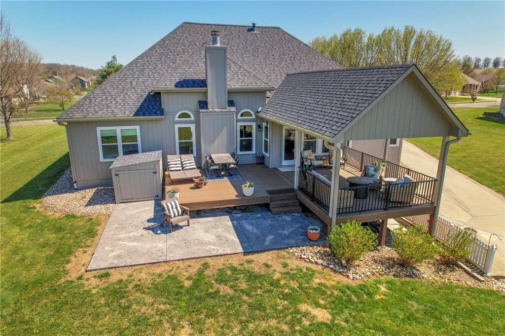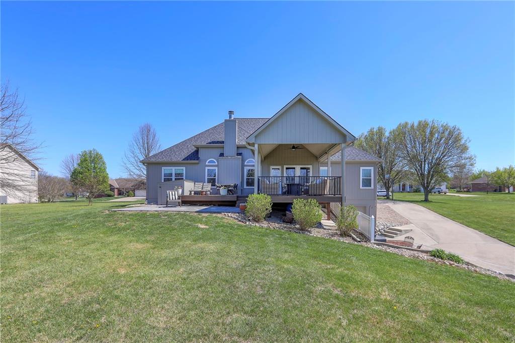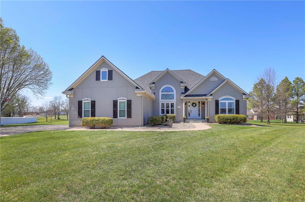 Homes in Edgewood Estates rarely come to market—even more rarely on 1.29 acres with breathtaking sunset views overlooking a horse farm. This beautifully appointed 5-bedroom, 3-bath home offers expansive living spaces, exceptional outdoor entertaining, & one of the largest lots in the neighborhood. Inside, soaring ceilings & a stately fireplace anchor the main living space, creating an atmosphere that feels both grand & welcoming. The expansive kitchen offers abundant cabinetry & workspace rarely found in newer homes, complemented by a family dining area with bar-top seating, while the formal dining room provides an elegant setting for gatherings. The primary suite offers a peaceful retreat with west-facing windows capturing spectacular sunsets, along with a generous ensuite & oversized walk-in closet. Two additional bedrooms & a spacious hall bath are positioned on the opposite side of the home, offering privacy & flexibility for additional living space or a home office. The finished lower level expands the home with a large family room, oversized recreation area with pool table space, & a fully equipped kitchenette—ideal for entertaining or a true second living space. Two additional bedrooms & a full bath add flexibility for guests, hobbies, or a home gym. With direct access from the third-car garage, the lower level creates an ideal private retreat. A safe room, generous storage, & third garage bay, currently outfitted as a woodworking shop, add additional functionality. Outdoor entertaining shines with a covered deck featuring vaulted ceilings, built-in floor outlets, mounted TV, & sunshade—perfect for sunset gatherings. A stamped concrete patio & beautifully maintained landscaping complete the outdoor setting. Located on the west side of Oak Grove in the Grain Valley School District, this Edgewood Estates property offers a rare opportunity to own a truly exceptional home.