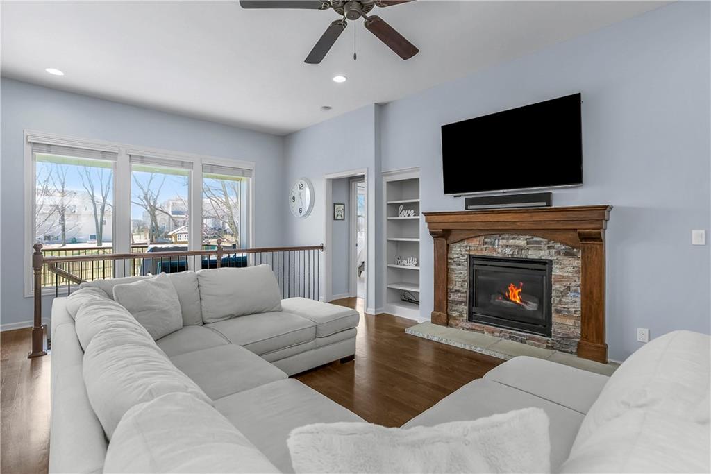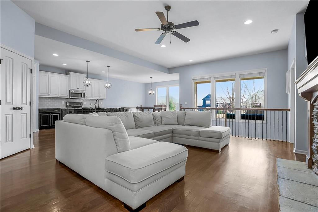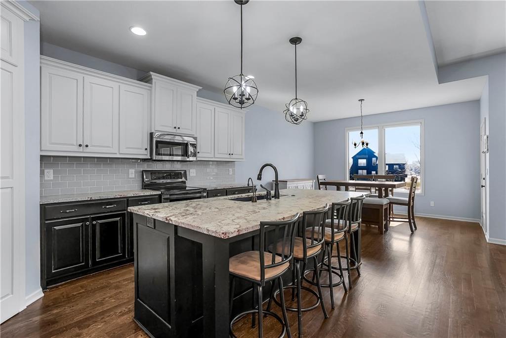 This Popular Reverse 1 1/2 story plan by D&M Builders is ready for you to move in! Enjoy the huge kitchen with 2 walk-in pantries that is open to the expansive great room with focal point fireplace. The dining room is conveniently a part of this space and opens to a covered deck. The covered deck has a bonus retractable awning extending the covered area. The large backyard is totally fenced. The home is conveniently located within walking distance to the sought-after Prairie Trail elementary school as well as middle and high schools. The community swimming pool is also nearby. Other features of this home include an instant hot water filler in the kitchen, front bedroom that has a full bath next to it, high ceilings in the great room, a soft water system, a radon mitigation system and a boot bench area as you come into the home from the garage. Please come take a look and make it your own!