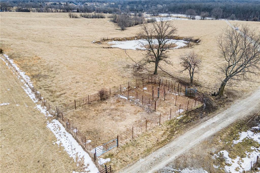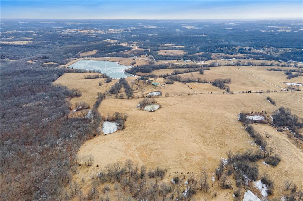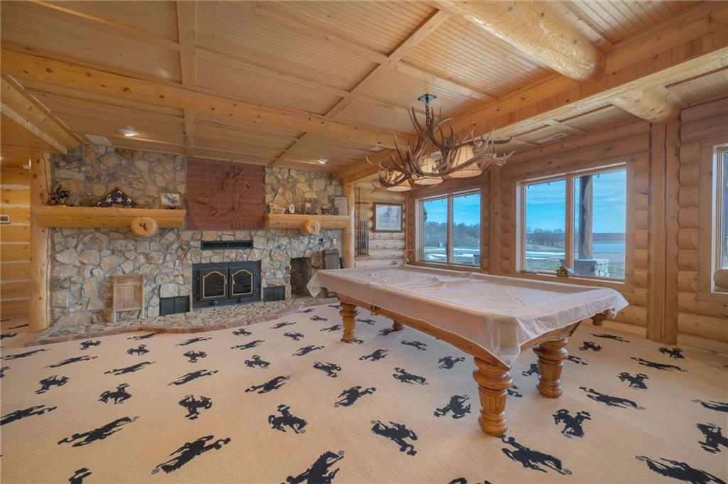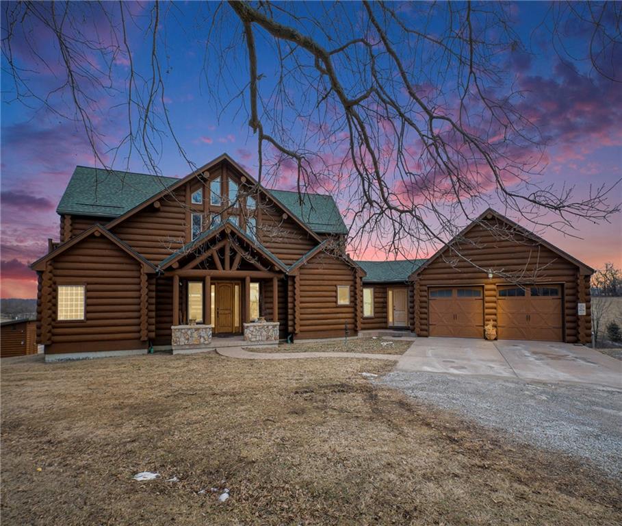 STUNNING CUSTOM LOG HOME located on 67+/- acres FULLY FENCED & cross fenced featuring a GORGEOUS LAKE!! 40x98 OUTBUILDING & lean to w/solar panels. PASTURE GROUND for your LIVESTOCK & HAY PRODUCTION along with timber. This RURAL RETREAT offers loads of RECREATIONAL OPPORTUNITIES for you and your family! The 4 bedroom 4.5 bath home offers an OPEN PLAN perfect for entertaining! CHEF'S KITCHEN features HUGE ISLAND, granite tops, CUSTOM CABINETS w/roll outs, pantry, dining space & more! SOARING CEILINGS & so many windows to take in the VIEWS! Main level primary suite w/SITTING ROOM & BEAUTIFUL STONE FIREPLACE! Don't miss the spacious laundry and mud room space for convenience. The upper level has 2 SECONDARY BEDROOMS with their own PRIVATE BATHS, walk in closets and balconies. The LOFT SPACE overlooks the EXQUISITE GREAT ROOM, STONE FIREPLACE and WALL OF WINDOWS! Finished walk out LL has the 4th bedroom & full bath, 16x8 SAFE ROOM, bonus room, REC ROOM W/3RD stone fireplace and WET BAR and 2 storage spaces. RELAX and watch the SUNSETS & WILDLIFE from the low maintenance deck overlooking the SALT WATER IN GROUND POOL & LAKE! This is a ONE OF A KIND meticulously maintained property 30 minutes from Kansas City. Square footage, acreage, schools, taxes, etc are approximate...buyer and buyer's agent to verify