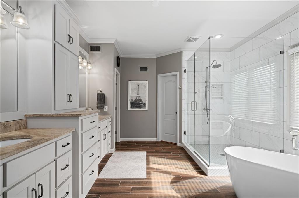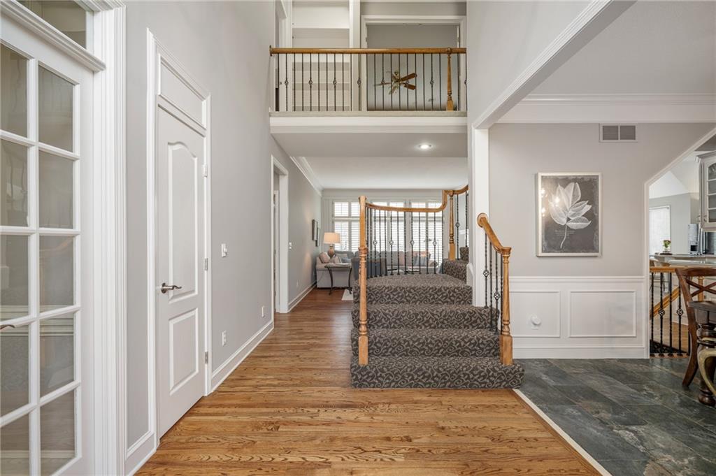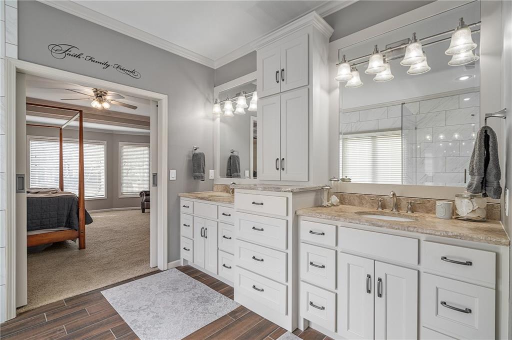Welcome home to a remarkable 1.5-story residence in Wellington Park Parkside, quietly situated on a cul-de-sac. This home features a formal living room with plantation shutters, a hearth room, and a spacious kitchen equipped with an island, pantry, and breakfast nook, along with a formal dining space and a dedicated office. The master suite offers a walk-in closet with a custom system and an updated, spa-inspired bathroom. Upstairs includes three generously sized bedrooms, each with walk-in closets—one with an en-suite bath and two sharing a Jack-and-Jill bathroom. The substantial loft/media room, enclosed by French doors, provides an ideal space for gatherings. The fully finished walk-out, walk-up basement includes a half bath, wine cellar, expansive recreation areas, a bonus room, and ample unfinished storage. The backyard is well-suited for entertaining, featuring both a deck and patio with a fireplace. Neighborhood amenities include a swimming pool, clubhouse, playground, and newly refinished tennis/pickleball courts. The property is conveniently located near schools, shopping, restaurants, and highways. This property is a fabulous place to call home!!!
